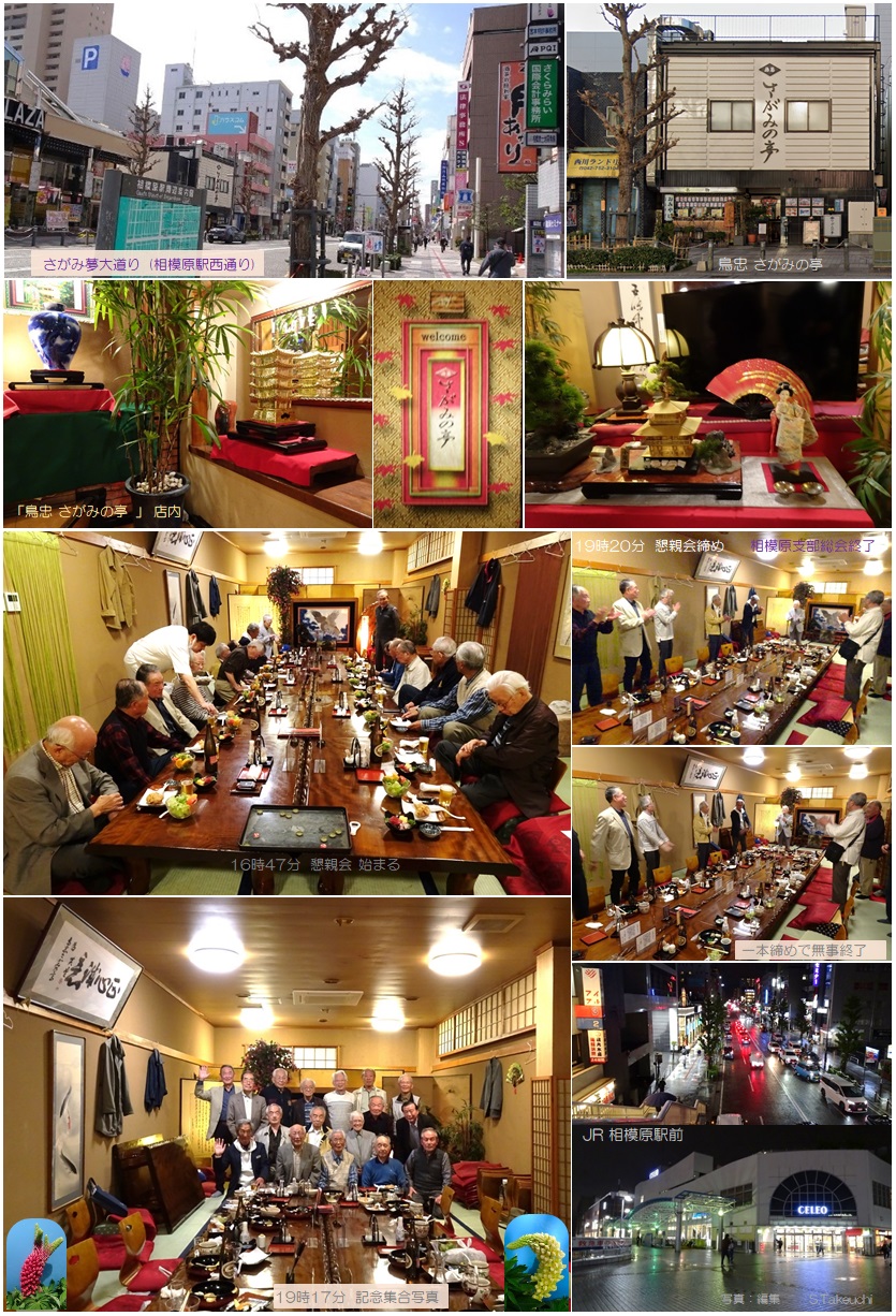 | ◆懇 親 会◆ 懇親会の宴席は昨年同様 お洒落な日本料理店です。宴は支部長の乾杯で始まりました。料理コースは名物若鳥の手羽揚げを中心に特製サラダ、新鮮刺身盛り合わせ、酢の物、江戸前寿司等タイミング良くテーブルに並びます。 飲むほどに会話が進み和やかな中、参加者全員よりスピーチを頂きました。皆健康第一を心掛け、趣味や家族との日々を大切に地域活動への参加等元気に 過ごされている様子や、現役時の思い出等、話題がつきません。限られた時間での懇親会の意義を胸に、次回への再会を願い一本締めで閉会となりました。 |