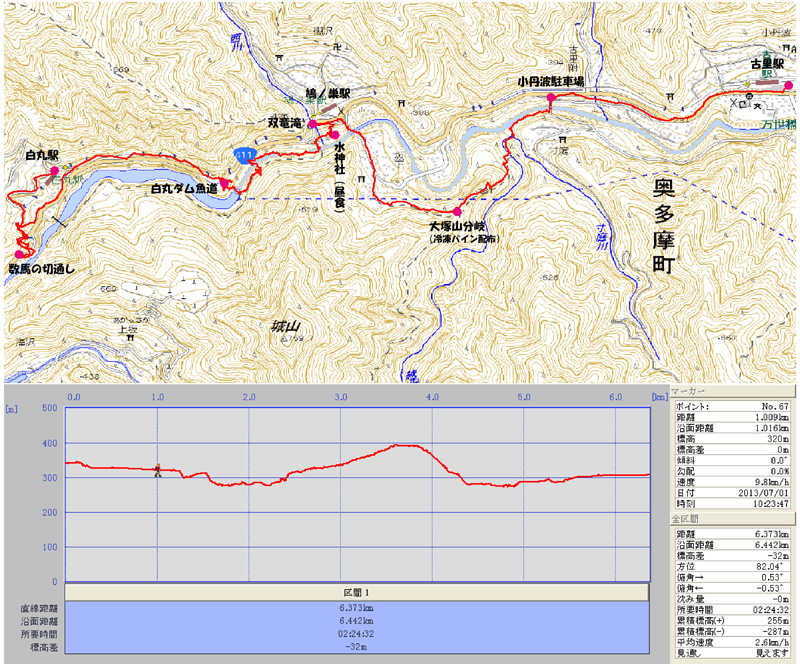 実施日 2013(H25)年8月28日(水) 天候 晴 湿度 少行き先 鳩ノ巣渓谷 コース JR立川8:45==10:03白丸駅10:10〜十一面観音〜10:27数馬の切通し〜10:35青梅 街道〜10:50白丸ダム魚道11:05〜白丸ダム〜鳩ノ巣渓谷〜11:29鳩ノ巣小橋〜11:35 水神社12:00〜双竜の滝〜雲仙橋〜12:25松の木尾根12:40〜越沢川(ほたる橋)〜寸庭 橋〜13:24古里駅13:48(青梅行) 参加者 竹島 久雄、折本 文夫、杉田 勝行、前北 勝司、野田 宏、嶋崎 猛、中田 信義、 宇山 治男、三浦 繁雄、八木 閲三、中島 征雄 計 11名 概要 白丸駅で今日のコースを確認後(一昨年平成23年3月11日の東日本大震災で数馬峡のハイキングコースが崩落し通行禁止)、10時10分数馬の切通しに向け出発。 十一面観音堂(「新編武蔵風土記稿」に「十一面観音は秘仏にて見ること許さず」とあり、我々も見ることがの出来なかった)の先から昔の街道の趣が残る道を行くと、元禄時代に岩盤を切り開いて作った切通しがあり、旧街道はその先で現青梅街道で絶ち切られて行き止まり。 戻って青梅街道に下り、白丸ダムを目指す。 10時50分白丸ダム魚道管理棟に着き、6階建て(?)位の螺旋階段を降り魚道のトンネル部を見学。11時5分過ぎに白丸ダムを渡り、右岸の直ぐ先のあずまやで休憩、これから鳩ノ巣渓谷歩きとなる。 長くて急な岩石で造られた階段を一気に下り、巨岩を縫っての多摩川の流れ、対岸の絶壁等の渓谷美を楽しみながら狭い岩場の道を歩いて行くと吊橋が見えて来た。 吊橋の袂で集合写真を撮る。吊橋の上からの渓谷の眺めは素晴らしい。左岸に渡り川に沿って下ると目の前に上に祠がある巨岩の下に着く。この祠が水神社で、その巨岩の上の東屋とその周りで昼食を取る。 12時00分、閉じられた旅館の間を上り、途中双竜の滝を見て上り多摩川の架かる雲仙橋の袂に出る。下を見ると足がすくみそうになる高い雲仙橋を渡り、集落の中を上って行くと林道となり、12時25分御岳山への道の分岐の松の木峠に着いて休憩をとる。ここが今日の最高地点で、崖の上に造られたあずまやがあり、川苔山、本仁田山が良く見える。 12時40分、古里駅に向かって細い急な道を下る。一軒の民家の先の滝のある「ほたる橋」で渡り、越沢川に沿って下ると多摩川の広い河原の上に出た。すぐ先で寸庭橋に出、左岸に渡り、道なりに民家の間を上って行くと青梅街道に出た。青梅街道を10分位歩き今日のゴールの古里駅に13時24分着いた。13時48分発青梅行に乗り帰途についた。 歩行距離 7.9km、 全体時間 3時間15分、 歩行時間 2時間32分 以上