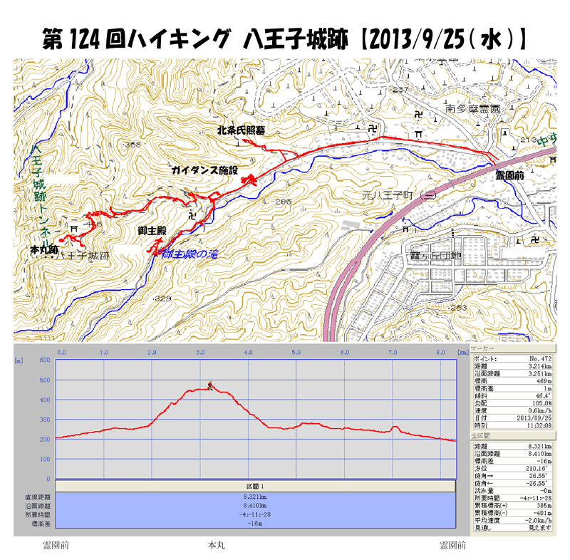 実施日 2013(H25)年9月25日(水) 天候 曇りときどき小雨 蒸し暑い行き先 八王子城址・城山(本丸跡:標高445.5m) コース JR高尾=バス=霊園前バス停9:10〜宗関寺9:18〜9:28北条氏照と家臣の墓9:36〜 9:44八王子城ガイダンス施設9:56〜管理事務所10:00〜10:10御主殿跡10:28〜管理 事務所10:35〜八王子城地形模型〜新道・古道分岐10:42〜10:47梅林〜10:51金子丸 10:55〜11:00柵門跡(古道・松竹バス停分岐)11:05〜11:16眺望の良い場所11:18 〜11:22八王子神社〜11:27本丸跡11:35〜11:38二ノ丸(松木曲輪)昼食11:56〜 12:25管理事務所12:30〜12:35八王子城ガイダンス施設13:05〜13:24霊園前バス停 =JR高尾駅 参加者 竹島 久雄、折本 文夫、杉田 勝行、前北 勝司、嶋崎 猛、三浦 繁雄、中島 征雄 合計 7名 概要 朝、JR高尾駅に集まっていると、登山家岩崎元郎氏が居られ、ご挨拶をし、「今日はどち らへ」とお聞きすると「若い人(あとで来られたが可なり美人)と景信から陣馬へ」とのこと。 9時2分のバスに乗り霊園前で下車。今日のコース(天候不順、山道が荒れていると思われ るので富士見台へは行かず、八王子城山頂上まで)の変更案内をし、9時10分出発。 八王子城址へのゆるやかな上りの道を進み、平安時代に開山、北条氏照が再興した宗関寺を 過ぎて行くと北条氏照の墓入口の標識に従い右の小道を入る。橋の先左の長い階段を上った所 に氏照とその家臣(氏照の重臣中山勘解由家範とその孫で水戸徳川家の家老となった中山信治) の墓があった。もとの道に戻り進むと八王子城跡ガイダンス施設という建物があり、八王子城 に関する展示物があった。 10時に管理事務所に着き御主殿跡へ向かう。見ものの曳橋が改修のため渡ることが出来ず 橋を潜って御主殿の滝の先から御主殿跡に入る。御主殿跡は建物の礎石や庭園・池跡、会所跡 等が復元されていた。管理事務所まで戻り、10時35分本丸跡へ登山開始。すぐ横の広場に 八王子城地形模型があった。 鳥居を潜り、新道を上る。(古道が倒木の為通行禁止) 途中、丁石(合目)を数え、梅林で景色を見、金子丸(金子家重が守備した曲輪)で休憩、 柵門跡(古道・松竹バス停分岐)で休憩し、11時22分に八王子神社に着き参拝。その上の 本丸跡(今日の最高地点445.5m)には11時27分に着いた。集合写真を撮り、下の松 木曲輪に下り(11:38)、南側が開けたベンチがある場所で昼食。 11時56分下山開始。古道が通行禁止の為上って来た新道を下り、上りでは見つけること が出来なかった「六合目」石を竹島さんが見つけ、皆歓声をあげる。12時25分には管理事 務所まで戻り、その先の朝立ち寄ったガイダンス施設で休憩し、30分程談笑した。 その後、霊園前バス停まで戻り(13:24)、JR高尾駅にて解散。 朝は大変蒸し暑く、10時に管理事務所に着いた時には着ているシャツは既に汗でぐっしょり の状態であった。 今日の標高差256m(霊園前バス停190m)にもかかわらず暑さの所為か疲れた。 以上