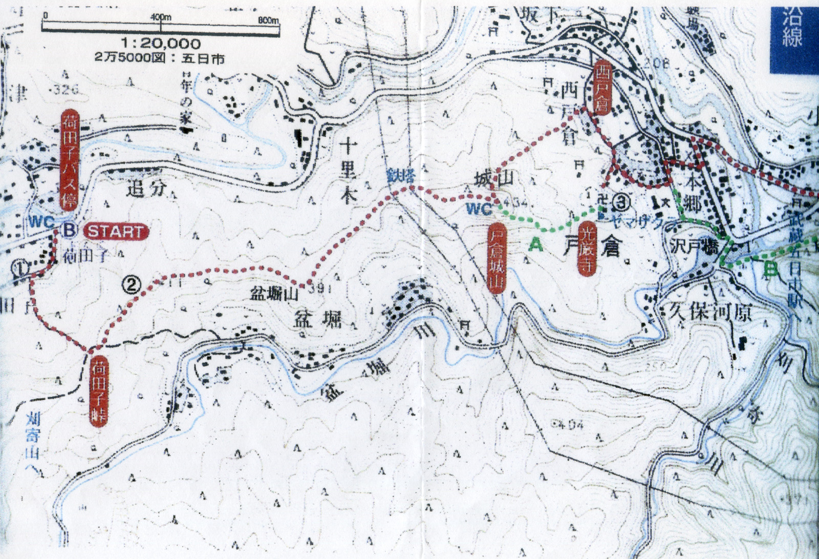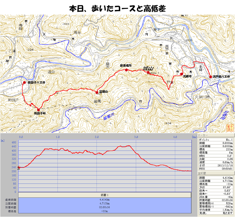 実施日 2013(H25)年12月18日(水)曇り のち小雨行き先 戸倉城山 コース JR立川9:06==9:38武蔵五日市9:48タクシー=9:58荷田子バス停10:04〜10:28 荷田子峠10:32〜11:05祠のあるピーク〜11:11盆堀山11:17〜11:30送電線鉄塔(十 里木分岐)〜11:35鉄塔先林内(昼食)11:52〜12:00城山山頂12:06〜12:30切通し 〜12:39光厳寺12:45〜12:55沢戸橋バス停13:07バス=13:15武蔵五日市駅 参加者 竹島 久雄、折本 文夫、前北 勝司、嶋崎 猛、中田 信義、宇山 治男、中島 征雄 計 7名 概要 今日は昼頃から雨が降るとのことなので、歩き始めを早くしたいので荷田子バス停までタク シーで行くことにした。荷田子バス停を10時4分に出発。登山道はバス停前方の信号を左折 し始まる。道標に従って鹿防除網をくぐり、ほぼ真直ぐに(細かくジグザグに)岩場のある山 道を上り10:28荷田子峠に着く。「城山1.9km、荷田子0.6km」とある。 一旦下って上ったピークに山々の展望図があり西〜北の展望が良い。急坂を下りた所で十里 木から来た嶋崎さんと合流。4個目のピーク(411m)も展望が良い。下りは急で両側が切 れ落ちている。次のピークからの下りも急で、上った「城山1.3km」表示の6個目のピーク の先の下りも急。UpDownを繰り返し「城山1.1km」表示の鞍部を上ったピーク(9個目?) に祠がある。岩と木の根の長い上り道の先が標高391mの盆堀山(ピーク10個目?)で「城 山0.9km、荷田子1.6km」とある。(11:11〜11:30) 盆堀山から左の直角に曲がり急坂を下り、UpDownして急な坂を下ると左に十里木への道を 分ける鞍部に出(11:30)、前の送電線鉄塔下は開けている。送電線鉄塔下から上りとなり、 2個目の送電線鉄塔の先から上り階段となるが、階段の手前の樹林の下で雨を避けて昼食にす る。 11:52長い階段を上ると出丸跡下の水平道に出る。出丸跡から城山頂上(本丸)まで0.2k m、尾根伝いに進み、西戸倉への道(旧大手道)を左に分けて段々状の郭(くるわ)跡を上る と城山頂上(本丸)に着いた。(12:00、標高434m)三等三角点のある頂上からは、東側が 開け、五日市の町並みが眼下に広がる。 集合写真を撮り、12:06山頂右奥(南東側)の左右が切立った岩の尾根の先から下山開始。 急坂で露岩をお尻を使って下りた先も石積みの段もある急坂が続くが道は厚い落葉で隠れど こに足を置けば良いのか分からない状態で注意しながらゆっくりと一歩一歩下りる。鞍部から 左へ切通しを下り、細いゆるやかな巻道を行くと光厳寺(こうごんじ)の門前に出(12:39)、 参拝する。 光厳寺から坂を下り、戸倉小学校横を通って下ると旧檜原街道に出、沢戸橋バス停に着いた (12:55)。雨も強くなってきたので駅まで歩く予定を変更。ここからバスで駅へ向かう。 雨も傘を差さずにすんだ小雨で歩くのに支障はなかった。今日の道は歩行距離4.4kmと短 かったが、荷田子峠から城山頂上まで大小15個くらいのピークと城山頂上からの物凄く急な 下りで低山にも関わらず筋肉を使うコースであった。 以上