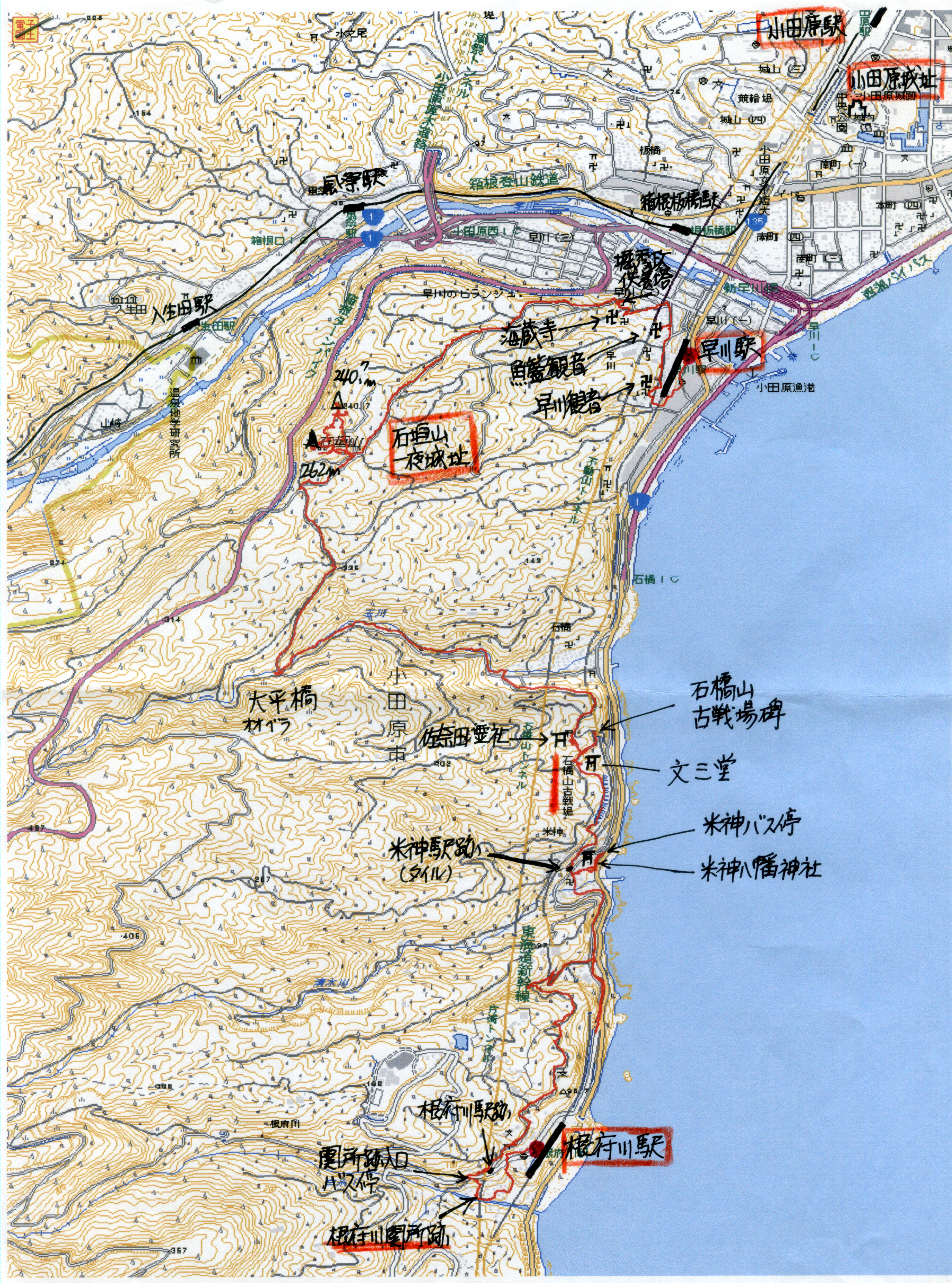 実施日 2014(H26)年5月28日(水) 天候 晴行き先 石垣山・石橋山古戦場跡 コース 早川駅9:17〜9:21真福寺・早川観音9:25〜9:30東善院(魚籃ギョラン観音)9:32〜 9:40海蔵寺(堀秀政供養塔)9:49〜[石垣山に参陣した武将たち]説明板〜10:24石垣山 一夜城(二の丸・馬屋曲輪〜井戸曲輪〜展望台〜二の丸〜本丸・本城〜天守台〜西曲輪〜 南曲輪)11:12〜大平橋(おおべらばし)11:31〜12:05佐奈田霊社(昼食)12:30〜ねじり 畑〜文三堂〜石橋山古戦場跡石碑〜豆相人車鉄道米神駅跡12:55〜牧谷川橋〜13:43根府 川関所跡バス停13:43〜根府川関所跡13:53〜14:00根府川駅14:17東京行 参加者 竹島 久雄、折本 文夫、前北 勝司、宇山 治男、中田 信義、野田 宏、杉田 勝行、 三浦 繁雄、古家 計、相原 教男、嶋崎 猛、中島 征雄 合計12名 概要 JR早川駅を9時17分に出発。裏道を通り霊験あらたかな早川観音をお詣りし、駅から見 えた白い観音様(魚籃ギョラン観音)が安置されている東善院に立ち寄り海蔵寺に向かう。 海蔵寺境内墓地にある秀吉の小田原征伐に参陣してこの地で没した堀秀政の供養塔に詣で てから石垣山一夜城公園への道に出、急な車道を上る。 右下には箱根登山鉄道の電車が通るの が見え、振り返ると相模湾、小田原市街そして小田原城が見える眺めが素晴らしい登り道をゆ っくりと休憩を取りながら上る。一夜城公園までの途中には「石垣山に参陣した武将たち」の 解説板(堀秀政、伊達政宗、宇喜多秀家、徳川家康、羽柴秀次、千利休、淀君、豊臣秀吉)が 順に設置されていて、これを読みながら上ると少し疲れも消えるようだ。 石垣山一夜城公園では二の丸・馬屋曲輪〜井戸曲輪〜展望台〜二の丸〜本丸・本城〜天守台 〜西曲輪〜南曲輪の順で見て回り、途中二の丸で休憩、11時12分佐奈田霊社・石橋山古戦 場跡に向けて出発。途中で“寿会ハイキングサークル”のメンバー?とすれ違う。 かなり広い舗装道路を下っていくと大平橋に着き、右に曲り橋を潜ってからの下り道は木陰 で涼しくほっとする。くだりきった石橋の集落に入ると今度は登りとなったが、登りきった所 からの展望(新幹線、東海道線そして相模湾)は素晴らしく、写真を撮っている人がいるくら いだ。佐奈田霊社の手前からは石橋山古戦場跡が一望でき、12時05分佐奈田霊社に到着、 昼食をとる。佐奈田霊社は源頼朝の家来でここ石橋山の戦いで討死した佐奈田与一が祀られて いて与一の塚もある。またこの霊社は喘息・のど・せきに霊験ありとのこと。 12時30分、米神・根府川に向け出発。佐奈田霊社の急な長い階段を降り、与一が討ち死 にした場所「ねじり畑」、与一の家来の墓である文三堂、石橋山古戦場跡石碑を見て下り、J R東海道線沿いの旧道(豆相人車鉄道線路跡)を通って米神集落に入り、豆相人車鉄道米神駅 跡に寄り旧道・豆相人車鉄道線路跡を進む。旧道は先で真鶴道路と合流する為歩くことが出来 ず山道を登ることとなる。 一気に標高100m位まで登り、旧片浦中、片浦小学校の脇を通って下って行くと根府川の 集落の旧道に合流(ここが豆相人車鉄道根府川駅跡)し、その先を左に降りた白糸川の岸に根 府川関所跡がある。関所跡から登り返して旧道に出て、14時のJR根府川駅に着いた。 一日上り下りを繰り返す舗装道路を14km位歩き、かなり疲れた。 以上
