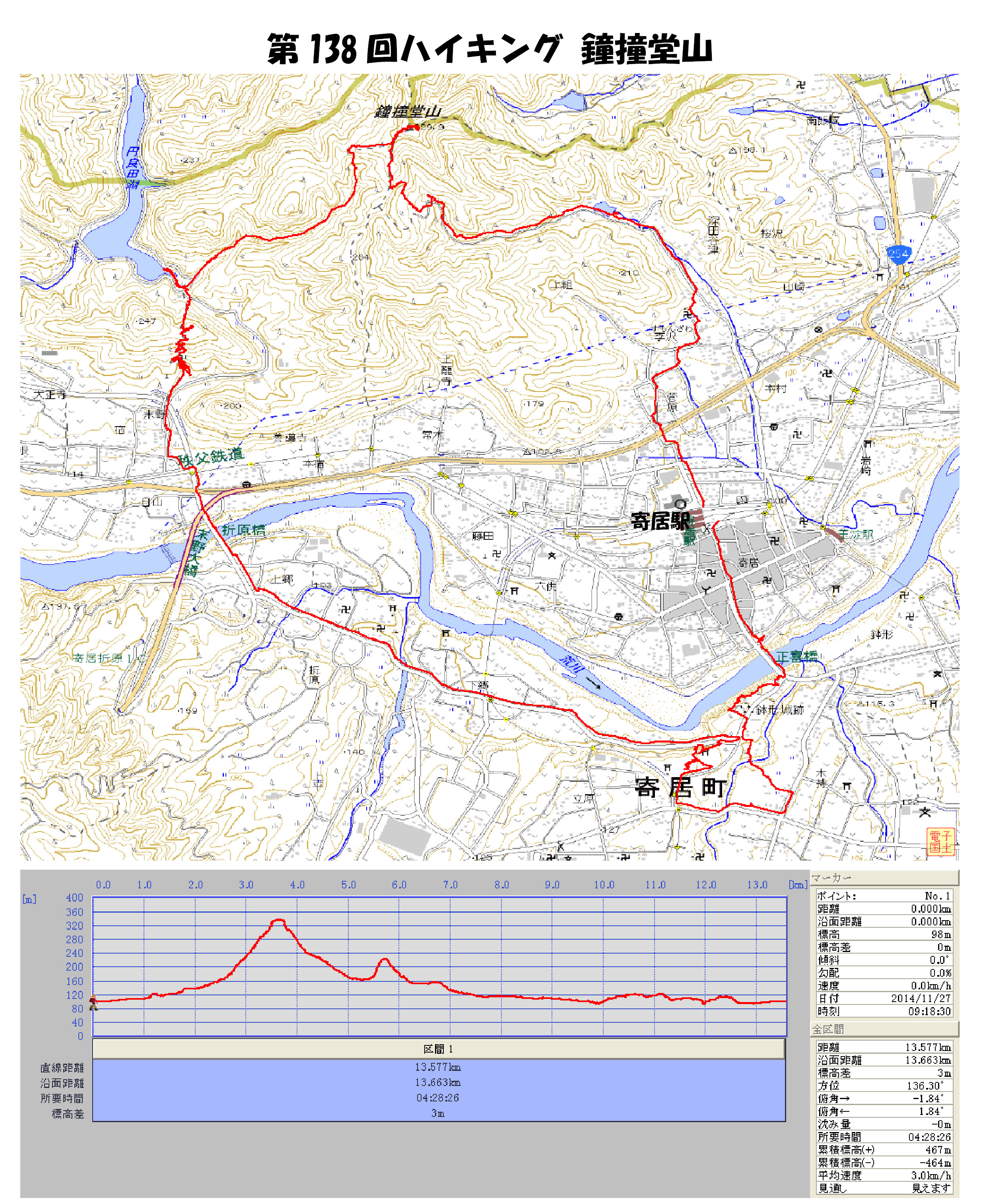 実施日 2014(H26)年11月27日(木) 天候 晴、 暖か行き先 鐘撞堂山 (標高 330.2m) コース JR八王子7:20=8:15高麗川8:20=9:14寄居 寄居駅北口9:20〜9:35天正寺9:38=9:46大正池9:50=9:58鐘撞堂山登山口(鐘撞堂 山まで1km)〜10:11高根山分岐〜10:19円良田湖分岐〜10:22鐘撞堂山頂上10:40 〜10:42大正池分岐〜10:05円良田湖湖畔〜羅漢山登り口11:08〜11:16羅漢山〜 11:32少林寺(昼食)11:54〜12:08折原橋〜12:43鉢形城13:35〜13:48寄居駅 JR寄居14:08=14:50高麗川14:55=15:32八王子 参加者 折本 文夫、野田 宏、嶋崎 猛、中島 征雄 計 4名 概要 寄居駅を9:20に出発し、道標に従って天正寺へ向かう。途中の民家の庭のモミジが紅葉 して綺麗。天正寺の中を通って進み、9:46に農業用水溜池の大正池に着く。これから行く 鐘撞堂山が見えるビュウポイント。林道を進むと「鐘撞堂山まで1km」の標識がある登山口 に着き、ここから山道となる。少し上り小さな畑の脇を通った先は鬱蒼とした、倒れてトンネ ルとなった竹林となる。先の雑木林を上り、円良田湖への分岐を過ぎ、最後の階段を上った 所が鐘撞堂山頂上。10時22分着。 三等三角点、あずまや、展望台のある頂上からの展望は低山にもかかわらず楽しめた。南側 は寄居の町、これから行く鉢形城址、奥武蔵・比企の山々、裏・北西側には榛名山が、東側で は関東平野が見える。 10時40分、鐘撞堂山頂上を後にし、下山。円良田湖に向かう。雰囲気の良い林道を下る と羅漢山登り口があり、右折して円良田湖湖畔に向かう。円良田湖は景色が良く、湖上では釣 をする人が見えた。羅漢山登り口まで戻り、羅漢山を急階段で上り尾根を左に行くと羅漢山に 着く。展望はない。羅漢山はを右に降りると五百羅漢が並び、左に降りると石塔が並ぶ千体荒神道で、今日は五百羅漢(510余体あるとのこと)を拝しながら少林寺まで下る。 11時半過ぎに少林寺に着き、あずまやで昼食を取る。11:54少林寺を後にして鉢形城へ向かう。秩父鉄道を横切り、荒川に架かる折原橋からは玉淀ダムを遠望し、河岸段丘の平坦な道を進み、八高線の踏切を渡って少し上ると鉢形城の本曲輪と二の曲輪の間に着く」(12:43)。 二の曲輪、三の曲輪、虎口、大手、外曲輪、土塁・堀、田山花袋碑、本曲輪、搦め手と城跡 を見て回る。13:35城跡を後に荒川に架かる正喜橋を渡り、市街を進み、寄居駅に13時 48分に着く。 14時08分の八高線に乗り、帰途についた。 以上