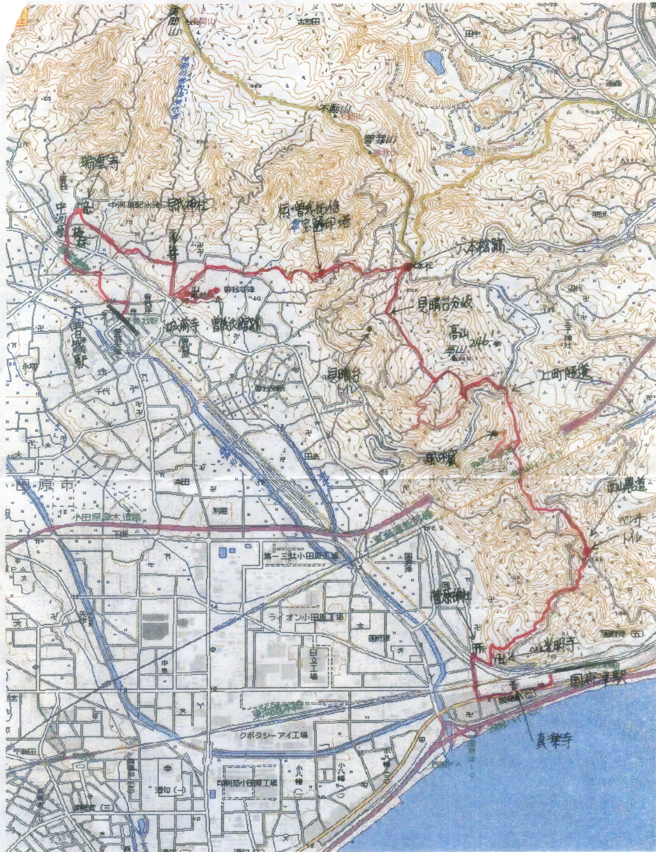 実施日 2015(H27)年2月25日(水)天候 曇り行き先 曽我丘陵 コース 国府津9:23〜9:35 菅原神社9:38〜陸橋9:56〜10:07 西山農道休憩所10:14〜10:22 五国峠碑〜10:35 風外窟分岐〜10:40 風外窟(横穴式古墳)10:45〜10:56 農道〜上町隧道 の道標11:03〜11:08 高山方面登り口〜11:15 高山傍(本日最高地点)〜11:25 見晴台分岐 〜11:32 昼食11:53〜12:05 六本松跡12:10〜12:19 伝・曽我祐信宝筐印塔12:22〜 五郎 の沓石〜12:41 城前寺12:49〜12:52 曽我氏館跡・物見古墳12:54〜13:04 宗我神社 13:12〜13:24 瑞雲寺13:40〜13:53 JR東海・下曽我駅14:09=14:20松田 参加者 竹島 久雄、折本 文夫、杉田 勝行、野田 宏、中田 信義、前北 勝司、宇山 治男、 相原 教男、三浦 繁雄、中島 征雄 計 10名 概要 国府津駅を9時23分出発、国道に出て小田原方面へ向う。岡信号を右折しJRガードを二つ潜り、 9:35菅原神社に着き、これからの登りに備え一枚脱ぐ。線路沿いに進み、光明寺の左の急坂をゆっ くりと上る。高度を上げるに従い小田原市街方面の視界が良くなるが雲が懸り富士山は見えない。 急坂を一気に標高90m位(標高差約80m)まで上るとなだらかになり、相模湾が見えるようになっ た。 また登りが続き、急に前方は開け、広い農道(西山農道)に出た。直ぐ先の農道建設碑の前にベ ンチ、そばにトイレがあったので休憩。広い西山農道から五国峠碑がある狭い五国峠農道を進むと 風外窟へ500mの道標があったので見に行く。下った先に禅僧風外慧薫が穴居した横穴式古墳が 何個も口を開けていた。 農道の戻り進むと標高246mの高山方面への分岐があり、長い急坂を喘ぎ喘ぎ上る。高山の傍 の今日の最高地点を過ぎると後はほぼ下りとなる。見晴台への道標を見落して後戻りして昼食予定 の見晴台に向かうが、見晴台はかなり下なので途中の眺望が良い所で昼食とする。眼下の別所梅 林は一面の白梅。 昼食後登り返して農道に出、六本松跡に向かう。枯れた松がある一本松跡の先に、昔は足柄道、 鎌倉道、大山道、箱根道が交わる重要な峠で六本の松があった所「六本松跡」に着いた。説明がに よると弓削道鏡も通ったらしい。ここから広い農道を下って約10分で伝・曽我祐信宝筐印塔がある。 城前寺への道標に従って満開の梅林を観ながらどんどん下り、五郎の沓石の先左に曽我兄弟ゆ かりの寺で兄弟、父曽我祐信と母満江の供養塔がある城前寺があった。また、城前寺の先に曽我 氏館跡と物見塚(古墳)があった。元に戻り進むと宗我神社の鳥居があり、潜って約250m上ると宗 我神社があり、参拝し休憩。 宗我神社を後にし、中河原梅林の中心の瑞雲寺に向かう。瑞雲寺の境内の梅林は紅白の梅の花 で一杯であった。曽我兄弟にまつわる絵を見たり、梅の木の写真を撮ったりした後、下曽我駅に向 かう。中河原梅林の中の御殿場線沿いに進み、13時50分過ぎに下曽我駅に着いた。 データ 歩行距離:12・9km、歩行時間:3時間25分、停止時間:1時間05分、 全体平均速度:2.87km/h、歩行平均速度:3.8km。 以上