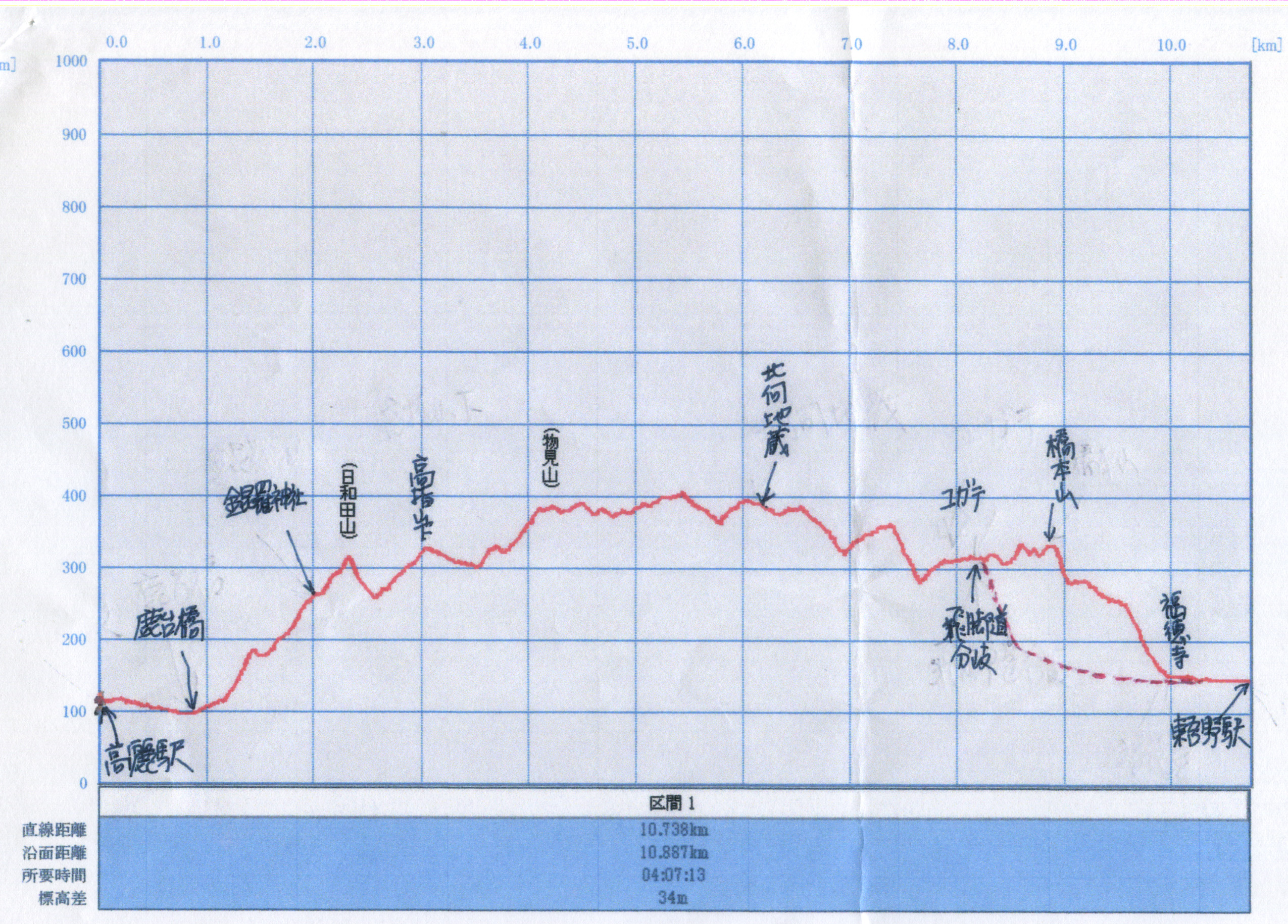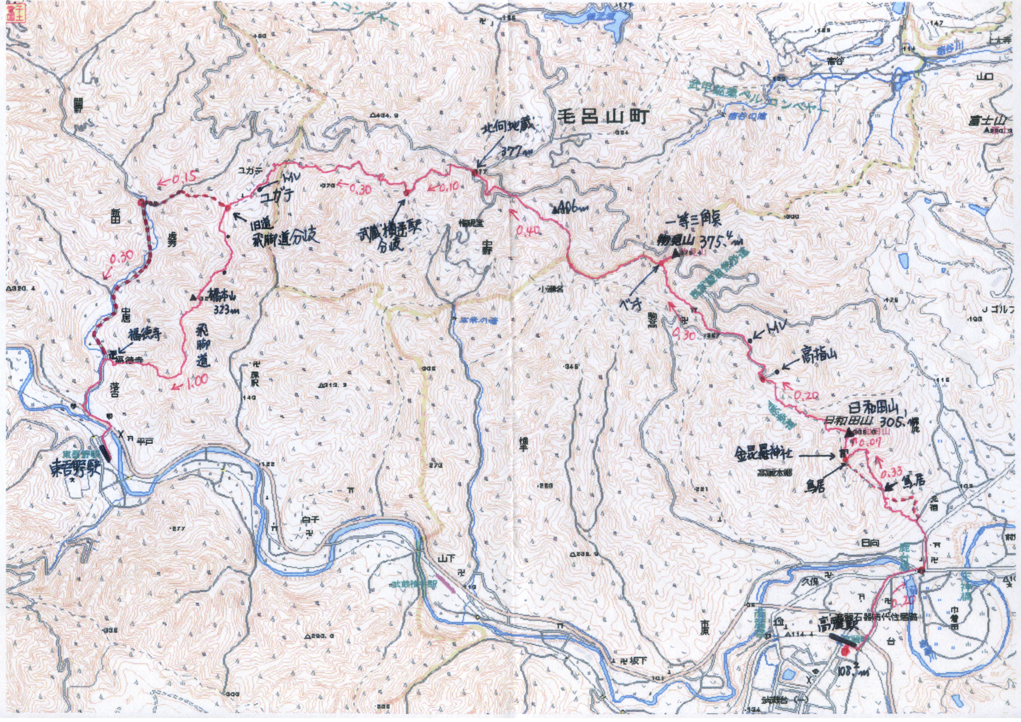 実施日 2015(H27)年3月25日(水) 天候 晴 風 少し強く寒い行き先 日和田山 コース JR八王子8:51=9:30東飯能9:34=9:40高麗 高麗駅9:45〜10:00高麗本郷交差点〜10:06登山口〜10:13鳥居(男坂・女坂分岐)10:17 〜(女坂)〜10:28金毘羅神社社前鳥居10:37〜(金毘羅神社)〜10:43日和田山10:52〜 11:09高指山下車道〜11:19物見山登山口〜11:33物見山12:00〜12:28北向地蔵12:32 〜12:40武蔵横手駅分岐〜13:10ユガテ13:23〜(古道飛脚道)〜13:39橋本山〜14:43〜 14:08福徳禅寺14:15〜14:28東吾野駅14:43=14:56東飯能15:06=15:42八王子 参加者 竹島 久雄、折本 文夫、杉田 勝行、野田 宏、中田 信義、前北 勝司、宇山 治男、 三浦 繁雄、中島 征雄 合計9名 概要 高麗駅を9時45分出発、駅東側の踏切と国道299号線を渡り、その先の高札場跡の右の細い道を 進む。道なりに行くと鹿台橋の西詰に出、橋を渡った先高麗本郷の信号を左折し進むと左に日和田山 登山口がある。山道を登ると鳥居があり、そこで男坂と女坂に分かれる。女坂とはいえ岩もある急坂。 少し緩やかになったら急に開けて鳥居がある岩だらけの場所に出る。ここから見る眺望は、眼下に巾 着田、右から御前山、大岳山、富士山、大室山、檜洞丸・蛭ガ岳から大山までの丹沢山塊、関東平野、 新宿副都心、スカイツリー、埼玉新都心とすばらしい。 すぐ上の金毘羅神社の右から岩だらけの急坂を上ると大きな宝篋印塔がある日和田山山頂(四等三 角点、標高305.1m)に着いた。ここからは東側が開け、筑波山が見えた。 日和田山から急坂を一気に下り、緩やかに上って行くとアンテナの立つ高指山への車道に出る。車 道を下ると尾根上に民家がある駒高集落で、その先に物見山への登り口がある。上る途中に珍しい 三輪駆動の運搬車があり、持ち主から話を聞く。上りが続き少し開けてきた先に物見山があった。 (11:33)昼食とする。広場の東北の奥に一等三角点(標高375.4m)がある。 物見山からは少しづつ上り、今日の最高地点400m弱からは下り、車道を横切り、上りかえすと北向 地蔵がある。 北向地蔵から西への山道を下り、大きく3回ほど曲がると武蔵横手駅への分岐があり、ここから右に ジグザグに下る。沢を2度渡って上った竹林の先に桃源郷と言われるユガテ集落がある。ウメ、サンシ ュユ、アセビが咲く日当たりが良いこの場所でゆっくり休憩する。 ユガテからは尾根道の古道「飛脚道」を行く。小ピークの三つ目が橋本山で秩父方面の山が見える 好展望の場所。武甲山や雲取山が見える。橋本山から急坂を一気に下り、尾根道を緩やかに進んだ 後、急坂を下りきったところに県重文の阿弥陀堂がある福徳寺がある。トイレもあるので休憩。 ここから駅までは車道歩きとなる。14時28分東吾野駅に到着。 今日のコースは低山ながら所々での眺望は良かった。そしてアップダウンもあり意外とハードであっ た。 歩行距離: 11.1km。 歩行時間: 3時間34分。 以上