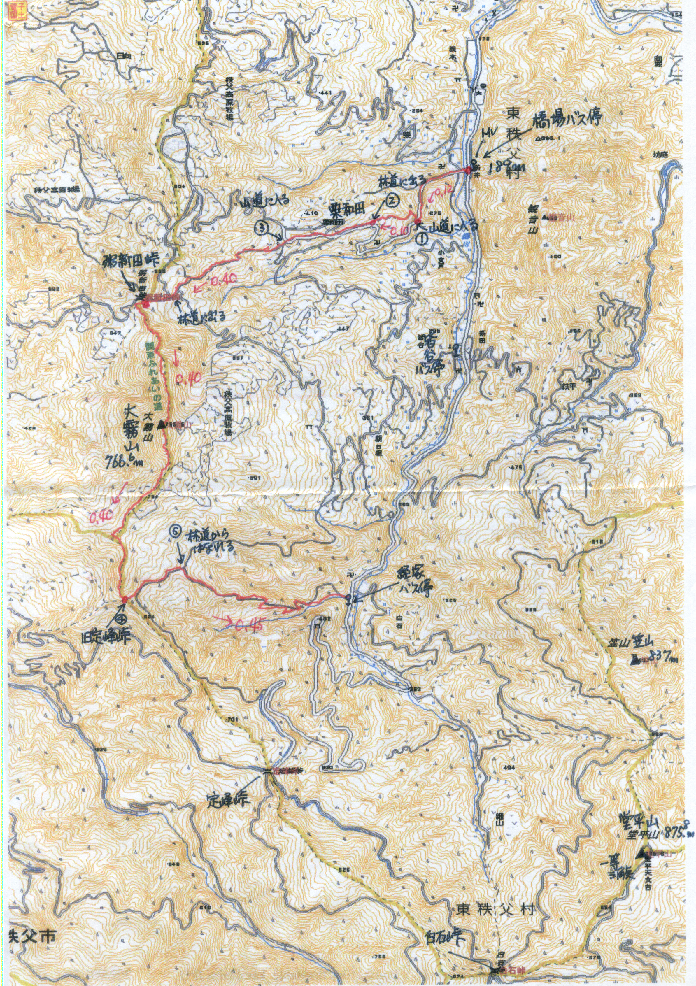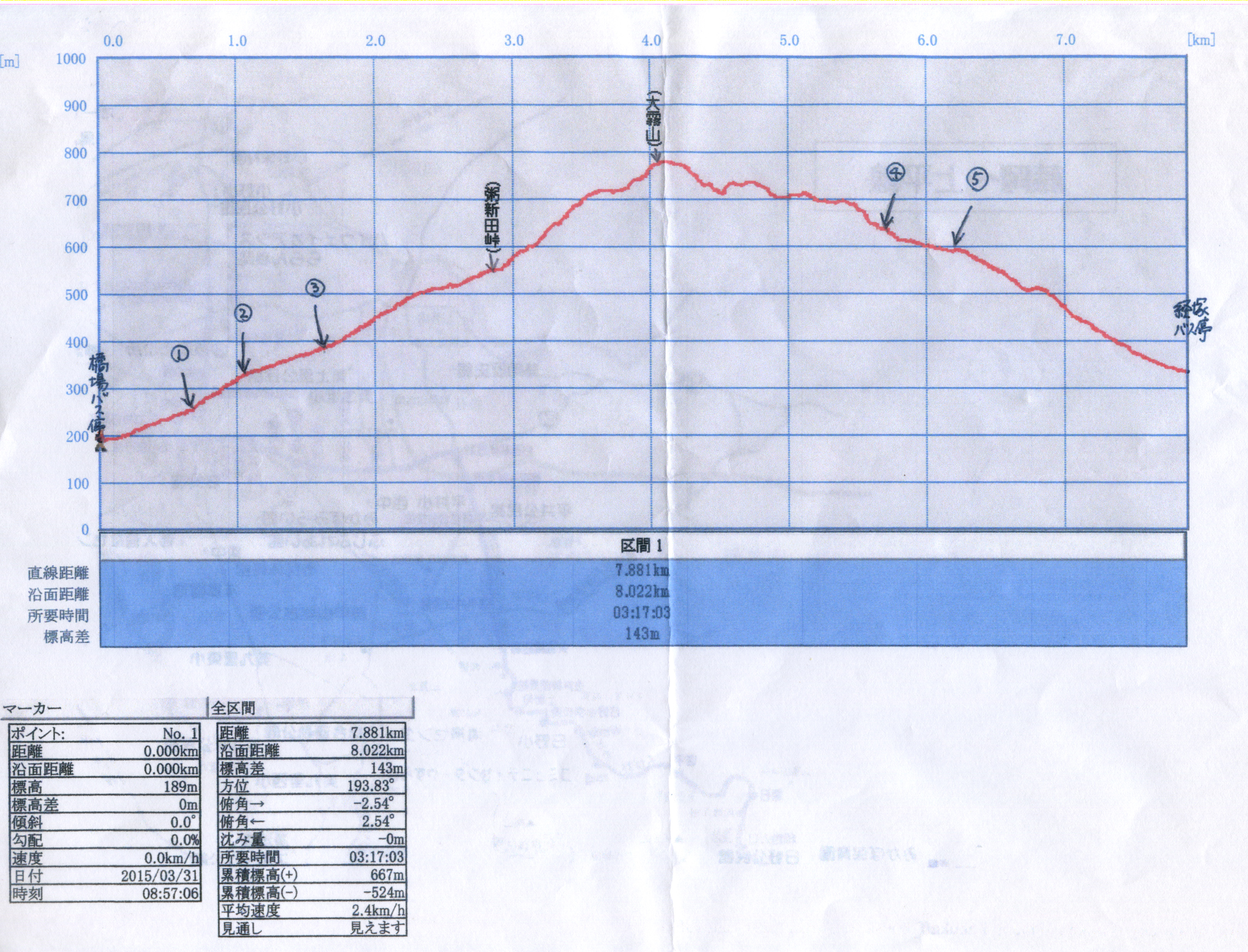 実施日 2015(H27)年4月22日(水) 天候 晴行き先 大霧山(標高766.6m) コース 八王子7:21=8:15高麗川8:20=8:46小川町 小川町駅9:27(皆谷行)―9:54橋場バス停(トイレあり)9:58〜10:06山道入口〜10:17林道 (栗和田集落)〜10:28民家前から山道〜10:50林道合流〜 10:56粥新田峠11:04〜11:40大霧山12:08〜12:44旧定峰峠〜13:35 経塚バス14:02―14:35小川町駅 東武東上線小川町14:52(快速池袋行)→朝霞台=北朝霞(武蔵野線)→西国分寺→府中本町 参加者 折本 文夫、杉田 勝行、野田 宏、中田 信義、前北 勝司、宇山 治男、三浦 繁雄、 中島 征雄 合計 8名 概要 橋場でバスを降り、準備をして9時58分出発。車道を横切り、槻川(つきがわ)を渡って思いのほか 急な車道を上る。10分程で右側に皇鈴山(みすずやま)への標識がある。ここが栗和田集落への近 道だ。細い山道を上っていくと先ほどの車道に合流する。ここから車道を約10分ほど集落の中を上 る。 集落の端から舗装された細い林道を上る。20分程上ると車道と合流する。車道を5分程上るとあず ま屋と粥仁田地蔵がある粥新田峠(粥仁田峠)に着く。バス停から約1時間、10時56に着く。ここが 大霧山登山口だ。 小休憩後11時4分の粥新田峠を出発。急登が続くが視界も開け始めたのでゆっくり登り展望を楽 しむ。休憩を入れ上ると少しなだらかになってきた。その先の目前に最後の急登があり、息を切ら して上りきると大展望の山頂に着いた。粥新田峠から約40分。三等三角点がある山頂からの眺望 は素晴らしい。景色を見ながら昼食を取る。 今日は霞んで遠くはぼんやりとしか見えないが、南西の武甲山は大きく、秩父の市街、西の両神山 はうっすらと、北西に宝登山、長瀞の町が見えた。 展望を楽しんで、12時08分下山開始。左に笠山・堂平山を見、高原牧場の鉄条網沿いに下る。 二度ほどの急な坂を下ると祠があり、定峰峠・白石峠、定峰集落・秩父市街、そしてこれから進む 経塚バス停への道と十字路となっている旧定峰峠の着く。横には「ダイダラボッチ伝説」の説明板が あった。旧定峰峠から下ると直ぐに舗装された林道に出た。林道を300mほど進むと右にバス停へ の案内板があり、ここから細い山道を下る。急な坂を下り、沢を小橋で渡って進むと車道に出る。 この角が経塚バス停だ。13時35分に着いて14時02分の小川町駅行のバスに乗った。 今日見た花:タチツボスミレ、ツボスミレ、アケボノスミレ、エイザンスミレ、ヒゴスミレ、 ヤマネコノメ、 セントウソウ、ニリンソウ、ヒトリシズカ、マルバコンロンソウ、クサイチゴ、シロバナエンレイソウ、 ヤマブキ、センボンヤリ、ムラサキケマン、ジュウニヒトエ、ミミガタテンナンショウ、桜、桃、 歩行距離:8.1km。総時間:3時間42分。歩行時間:2時間51分。停止時間:51分。 移動平均速度:2.85km/h。全体平均速度:2.19km/h. 上り標高差:約580m。 以上