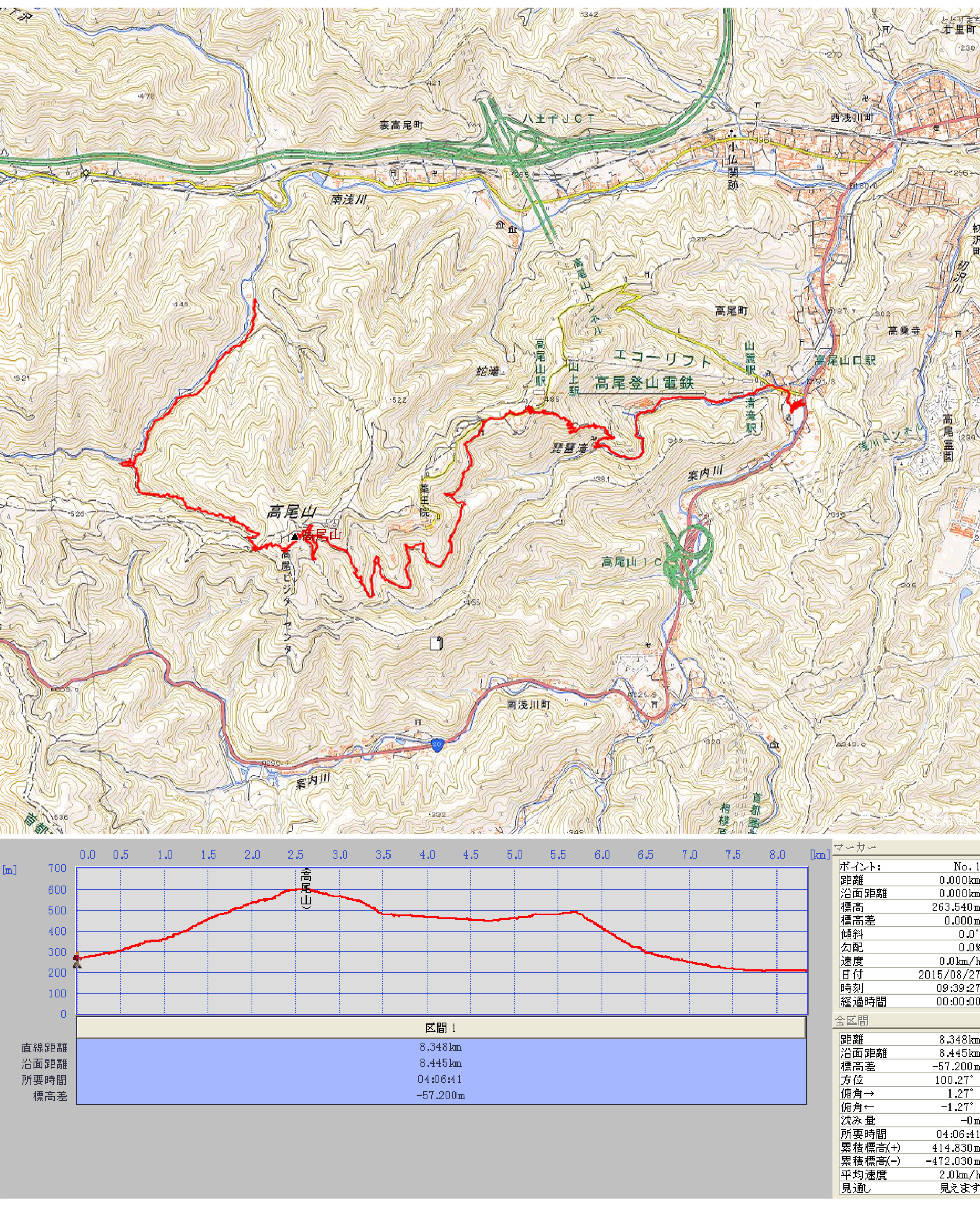 第147回ハイキングレポート記 中島 征雄 実施日 2015(H27)年8月27日(木) 天候 曇り 湿度 高い 行き先 高尾山 コース 高尾駅北口9:12(バス)−9:23日影バス停9:25〜9:39森の図書館・キャンプ場〜日影沢林道 〜10:02ポンプ場〜10:36もみじ台下6差路10:42〜10:50大見晴台〜10:53頂上休憩所 11:02〜3号路〜11:13薬王院分岐〜11:58浄心門・1号路合流〜12:03霞台(昼食)12:30 〜12:52病院分岐12:55〜13:00琵琶滝水行場〜13:11妙音橋〜13:19ケーブル清滝駅〜 13:25TAKAO599ミュージアム14:08〜14:15京王高尾山口駅 参加者 竹島 久雄、折本 文夫、杉田 勝行、野田 宏、中田 信義、前北 勝司、宇山 治男、 中島 征雄 合計 8名 概要 日影バス停を9時25分出発。旧甲州街道から日影沢林道に入る。森の図書館でいろはの森コース と分かれ日影沢に沿って林道を進む。マツカゼソウ、ハグロソウ、ノブキ、ミズヒキ、ヌスビトハギ等が 見える。日影沢のせせらぎの音を聞きながら登っていくが湿度が高く暑い。水飲み場の先のポンプ場 から左の山道に入り(10:02)、急な細い山道を登る(ヤマホトトギスが咲いていた)。湿度100%以上 (?)と感じられ、汗が噴き出す。 途中、休みを入れて10:36にもみじ台下6差路に着いた。休憩後(10:42)に石の階段を上り、大見 晴台に10:50に着き集合写真を撮る。標高599mの頂上のそばの休憩所で休み、まだ11時と早い ので霞台で昼食にすることに決め、3号路へと向かう。5号路から3号路へと進む。3号路は薬王院へ の道との分かれから何回もの階段がある下りが続く。下りが嫌になった頃にやっと水平な道になった。 道は殆ど上り下りが無く、薬王院の下・中腹を巻きながら橋を五つの渡って進むと、2号路とぶつか るところで左に上ると表参道1号路の浄心門に出る。(3号路の途中は樹林の中で視界は殆どなかった が、スカイツリーが見える場所があった。)ここからは表参道を霞台へと向かう。 12時に霞台の広場に着き、ベンチで昼食をとる。いつもは見える湘南方面も今日は見えない。12時 30分、琵琶滝に向かって下山開始。滑るごつごつとした山道を下り、途中病院への道を左に分け右に 琵琶滝に下る。琵琶滝から6号路を下る。ケーブル駅から商店街を通り途中から右折し今月中旬に開 館したTAKAO599ミュージアムに寄った。ミュージアムには高尾山の動物、植物、昆虫の標本が展示 され、NatureWallではプロジェクションマッピングの手法での映像の投射が行われた。ミュージアムを後 にして14時15分の京王線高尾山口駅に着いた。 今日は雨で中止になった寒い昨日と違って、蒸し暑い一日であった。 GPSが当初機能せず、スタートの日影バス停から約650n移動した 森の図書館から始まった。また TAKAO599ミュージアム内で終了させたのでミュージアムから駅まではデータは取れていない。 そのため、歩行距離はデータの8.4kmに約0.9kmをプラスした約9.3kmとなる。 また、高度は日影バス停の標高230mから始まります。 以上