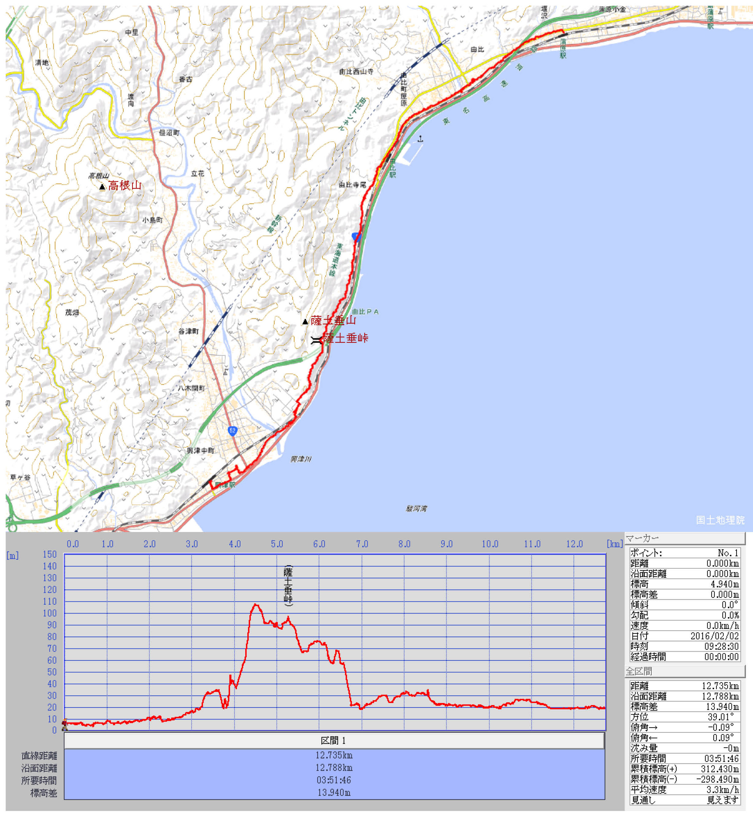 第153回ハイキングレポート記 中島 征雄 実施日 2016(H28)年2月24日(水) 天候 曇 行き先 薩埵峠~由比宿 (薩埵山の標高244m。薩埵峠の最高地点標高 約110m) コース 熱海8:23=8:41沼津8:44=9:21興津9:33~興津一里塚跡~身延路道標~伏見醤油館~9:45宗像神社9:47~浦安橋~10:15海岸寺10:18~10:23旧東海道合流~10:28薩埵峠登り口~10:35奥展望台~10:48展望台~11:00薩埵峠・山の神遺跡碑(昼食)11:23~西倉沢一里塚跡11:41~間の宿西倉沢~脇本陣柏屋~本陣跡~12:01名主小池邸12:10~12:22由比駅~由比川~入上地蔵~西の桝形跡~脇本陣~正雪紺屋~13:00本陣跡・東海道由比宿交流館13:14~お七里役所跡~東の桝形~由比一里塚跡~13:38蒲原駅 参加者 杉田 勝行、中田 信義、前北 勝司、古家 計、八木 閲三、中島 征雄 計 6名 概要 熱海発沼津行きの車内で集合したメンバーは興津駅で下車。今日の行程で由比宿も行く変更案内をしていたところ、「実は」ということで、杉田さんから、由比に実家があり、生まれてから高校(清水東)卒までここ由比で暮らしていた、今日は実家に寄って帰るとの話があり、皆、びっくり。 駅から国道1号線に出て左折、旧東海道江戸から41番目の一里塚の跡(石柱のみ)を過ぎ、身延路標で左折し、伏見醤油館を見て小学校脇を通って興津の地名の由来となった宗像神社へ行く。国道に戻り、大きな戦いが三つもあった上流右手の薩埵山を見ながら興津川に架かる浦安橋を渡る。先で左に入り、東海道線を渡ると上りが始まる。坂の途中にある海岸寺で100体の観音を見て上り続ける。 旧東海道と合流し、右折し上るとトイレ・あずまやがある薩埵峠への登り口に着いた。墓地の間の階段の道を上ると、段々と視界が開け、伊豆半島・駿河湾・美保の松原が見えてくる。階段は直ぐに終わり、薩埵峠の西の端に出る。天気が良ければ富士山が目に飛び込んでくるのだが、今日は雲が懸り全く見えない。残念。 ここからは、両側がみかん畑のゆるやかな道を行く。木造の展望台からは「薩埵峠からの富士山」の写真と同じ場所にいることが確認できる。富士山は見えないが、下には東名高速道路、国道1号線、JR東海道本線がまとまって走っている。先に進むと数分で駐車場・トイレと山の神遺跡碑がある展望の良い場所(薩埵峠)に着いたので、昼食休憩とした。 ここからは舗装の下り道で、途中、薩埵地蔵道道標を見て、江戸から40番目の西倉沢の一里塚 (石柱のみ)で間の宿西倉沢の集落に入る。脇本陣柏屋、本陣跡を過ぎ、名主小池邸で休憩する。小池邸から由比駅までは10分強。12:22に着いた。 由井駅から由比川まではたんたんと歩き、由比川を渡ると由比宿になる。橋の右手の入上地蔵地 蔵、西の桝形跡、三軒の脇本陣と由比正雪の生家と言われる紺屋、その向いの本陣跡を見、本陣跡にある「東海道由比宿交流館」で休憩。ここで実家に寄る杉田さんと別れ、先に進む。紀州徳川家が七里毎に置いた通信の為の中継ぎ役所である「お七里飛脚の役所跡」(説明板のみ)、東の桝形跡、江戸から39番目の一里塚跡(石柱のみ)を見て、13時38分蒲原駅に到着。 切符を買わずにホームに着いていた列車に飛び乗った。薩埵峠はやはり、富士山が見えないと詰まらないが、旧東海道由比宿を歩けた ので少しは良かったのではないか。 歩行距離:11.3km。移動時間:2時間55分。 停止時間:1時間15分。全体所要時間:4時間10分。 移動平均速度:3.9km/h。 全体平均速度:2.71km/h。 以上
