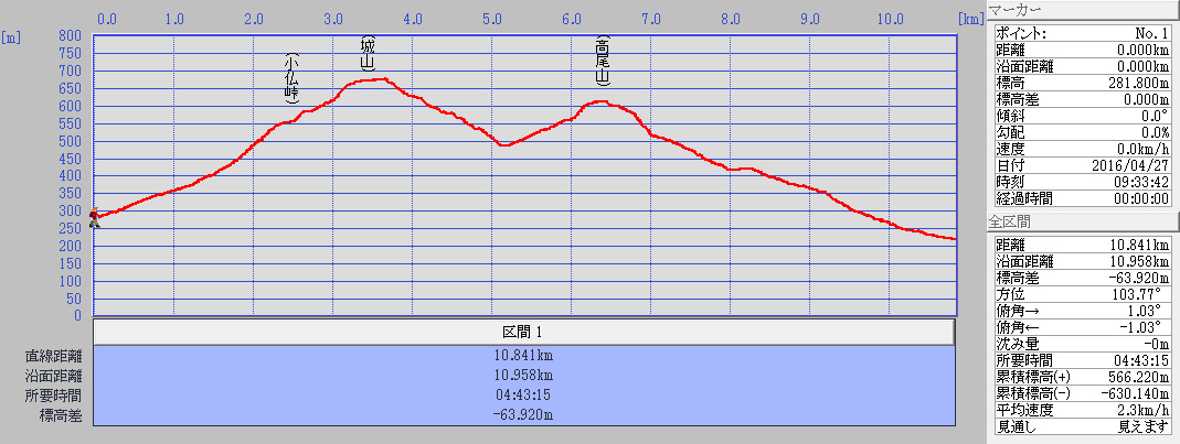 第155回ハイキングレポート記 中島 征雄 実施日 2016(H28)年4月27日(水) 天候 曇 行き先 小仏城山・高尾山 コース 高尾駅北口バス停9:12-9:30小仏バス停9:37~10:24小仏峠10:30~ 茶店跡10:33~ 10:57小仏城山(昼食)11:27~11:45一丁平~12:01大垂水峠分岐~ 12:21高尾山下6差 路12:26~12:31高尾山大見晴台・山頂12:47~5号路~6号路 ~ケーブル清滝駅~14:17 高尾山口駅 参加者 折本 文夫、杉田 勝行、中田 信義、前北 勝司、宇山 治男、野田 宏、中島 征雄 計7名 GPSデータ 歩行距離:10.8km。全体所要時間:4時間43分。移動時間:3時間36分。停止時間:1時間7分。 移動平均速度:3.01km/h。全体平均速度:2.30km/h。 概要 小仏バス停で登山の準備をし、9時37分出発。いつ降り始めてもおかしくない空模様。車道を左に 宝珠寺を見、高度を上げて右に景信山への道を分けて、車道終点から砂利道の林道を進む。水場を過 ぎ、小沢から離れると山道となり急坂となる。ジグザグ道を上って行くと小仏峠の広場に出た。久し振り に汗をかいた。ここで小休止。 少し休んでいると掻いた汗で寒くなってきたので出発。旧甲州街道を右に分け、すこし上った茶屋跡で 相模湖方面を眺め(曇っていて富士山は見えない)、先に進んでY字路は階段から木の根の急坂を上っ た。平らな尾根上からすぐに小仏城山の山頂に着いた。少し早いが昼食とする。登山客は少なくちらほ らという感じ。ゆっくり休んで11時27分、高尾山に向かって出発。 以前は滑り易かった山道は一変し、木道と木の階段等で整備され良くなったが、余りにも綺麗で町中 の庭園を散歩しているような感じで、少しつまらない。だが道端にイカリソウが沢山咲いていて山中であ ることを思い出させてくれる。 一丁平の先の分岐では右の巻道を行く。途中左の崖にホタルカズラが10株ほど可愛く咲いていた。 高尾山下の6差路で休憩し、山頂には階段をゆっくりと上る。着いた見晴台、山頂広場はさすがに人で 一杯。少し休んで下山。5号路から6号路に入り、急な長い階段を、沢は石を伝って下る。右に稲荷山コ ースへの道を分け下って行き、大山橋で休憩。この後、セッコクが咲いていないかと上を見上げながら 下ったが、一か月ほど早く全くなく、ケーブル清滝駅ホームの木にも無かった。14時17分、高尾山口駅 に着き解散した。 緑も濃くなり、初夏を感じる季節。心地よいハイキングでした。 今日見た花。 スミレ各種、ネコノメソウ、イチリンソウ、ニリンソウ、ツルカノコソウ、ニガイチゴ、ヤマブキ、チゴユリ、 ウワバミソウ、ウワミズザクラ、ホウチャクソウ、ミミガタテンナンショウ、ホタルカズラ、ジュウニヒトエ、 ヤマルリソウ、イカリソウ 以上