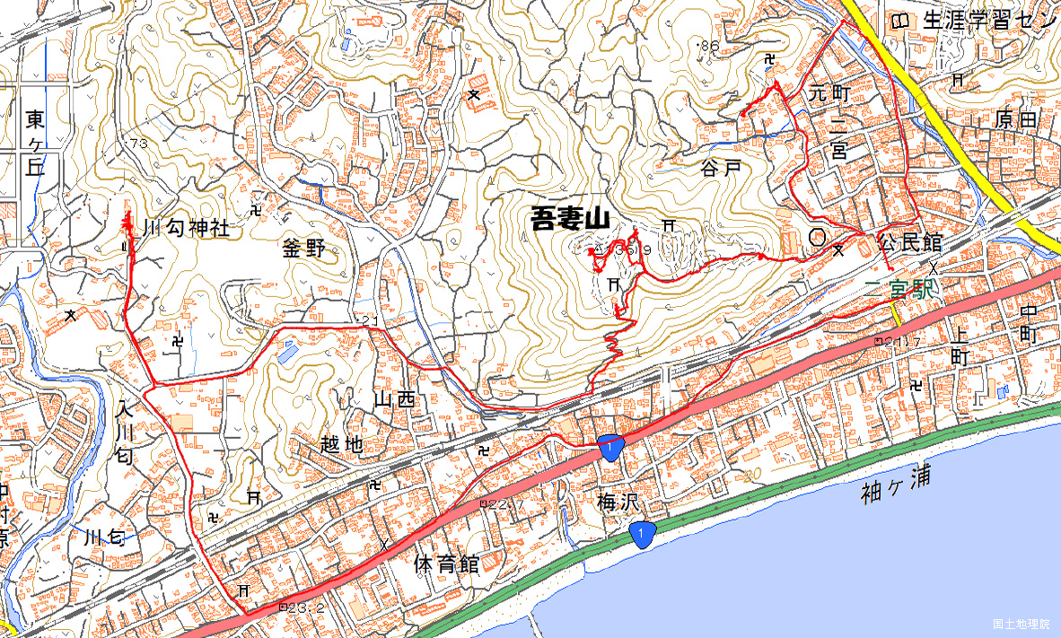 第162回 吾妻山記 中島 征雄 実施日 2017(H29)年1月25日(水) 天候 快晴 微風 暖かい 行き先 吾妻山(二宮町) コース 東海道線二宮駅10:32~10:48知足寺(曾我兄弟の墓)10:59~11:10役所口登り口~ 11:13第2展望台(休憩)11:19~11:25浅間神社参道入口~11:31吾妻山頂上(昼食) 11:58~12:08吾妻神社12:13~12:22吾妻神社参道入口~12:44川勾神社13:02 ~13:17茶屋の薬師堂~東海道川勾神社入口交差点(押切坂一里塚跡)~13:42二宮駅 参加者 折本 文夫、杉田 勝行、中田信義、宇山 治男、野田 宏、古家 計、中島 征雄 計 7名 GPSデータ 歩行距離:8.1km、全体所要時間:3時間10分、移動時間:2時間21分、停止時間:49分、 移動平均速度:3.46km/h、全体平均速度:2.56km/h 概要 10時過ぎの二宮駅改札口はごった返していた。皆、吾妻山に登るのだろう。10時半に集合したが、駅に置いてあった「吾妻山公園案内図」を見たら、ただ吾妻山に登るだけなら1時間半で終わってしまうようだ。そこで、曾我兄弟の墓がある「知足寺」と二宮の名の元となった「川勾神社」にも行くことにした。 案内図と案内板を見ながら知足寺に向かう。葛川に架かる花月橋を渡った先に曾我兄弟の姉は開基した知足寺があり、墓地の一番奥に曾我兄弟と二宮朝定と夫人(曾我兄弟の姉で知足寺に開基)花月尼の自然石の暮石があった。(写真の暮石 右2基が兄弟、左から朝定、花月尼)知足寺から吾妻山の登り口・役場口に向かって山麓を曲がりながら進む。二宮町役場のある道路に出て右折して登ると吾妻山公園の入口があり、ここから長い急な階段(山頂まで300段とのこと)を上る。 あまりにも急階段であったので展望台らしいところで休憩。穏やかな相模湾が、また大島が遠望できた。この先も階段が続き、浅間神社の先に頂上からの長いローラーすべり台があり、すぐに頂上に到着。(標高136.2m) 人で混雑していたが、ベンチを確保して昼食とする。 展望台からの展望は、南から大島、利島、大室山、初島、天城山、箱根・二子山・駒ヶ岳・明星・明神・金時山、富士山、その手前の矢倉岳、御正体山、丹沢の山々、大山。東では湘南海岸、三浦半島、房総半島がよく見え、雲一つない冬晴れの素晴らしい眺望を堪能した。 満開の菜の花と富士山の写真を撮って吾妻神社に向かう。すぐに着いた吾妻神社は日本武尊の妃の弟橘姫を主祭神です。参拝して長い急な参道を下り川勾神社に向かう。 川勾神社は相模国の二之宮で、式内社で、さすがに厳粛な気になる名社です。参拝者は我々だけであったが、甘酒を振る舞われた。 川勾神社からは以前、東海道ウオークで寄った「茶屋の薬師堂」で東海道に出、国道の反対側にある「押切坂の一里塚跡」を眺めて、二宮駅にむかった。 以上
