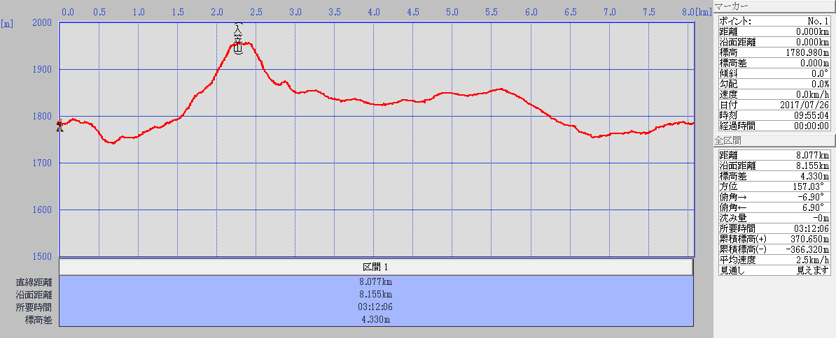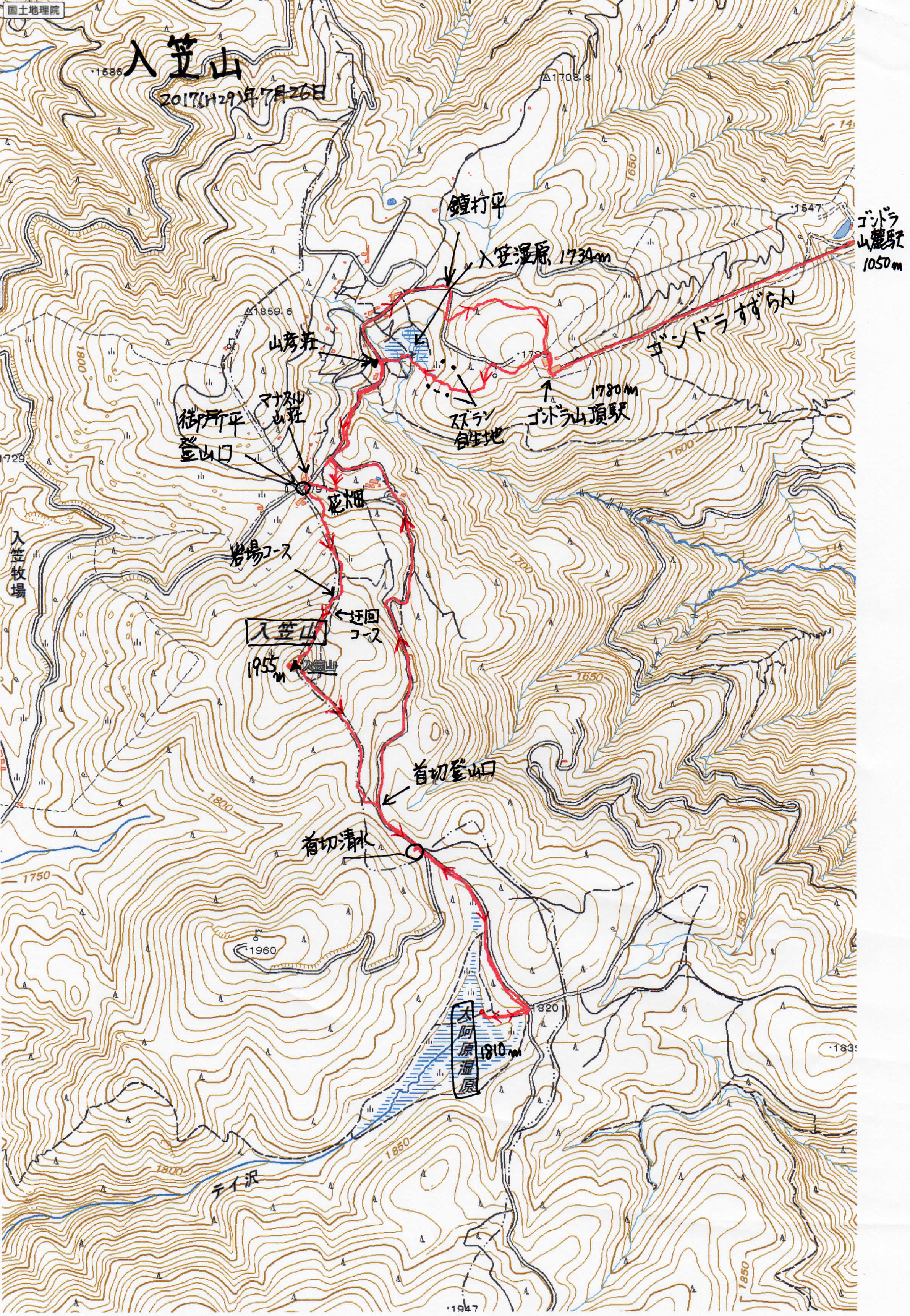 第168回 入笠山(標高1955m)写真撮影&記 中島 征雄 実施日 2017(H29)年7月26日(水) 天候 曇り一時雨 行き先 入笠山(標高1955m) コース JR八王子6:33-9:10富士見9:15⇒タクシー⇒9:25富士見パノラマリゾート9:30~9:35ゴンドラ山麓駅9:36⇒ゴンドラ⇒9:52ゴンドラ山頂駅9:53~10:02入笠湿原分岐~入笠湿原~10:16林道(山彦荘前)~10:26花畑~御所平峠登山口10:32~岩場・迂回コース分岐10:46~11:02入笠山山頂(昼食)11:23~11:42首切登山口11:42~11:45首切清水~11:56大阿原(おおあはら)湿原入口~12:00大阿原湿原展望台12:01~湿原入口12:04~12:33花畑入口~12:46入笠湿原入口(山彦荘前)~鐘打平~林道分岐(山道)~13:05ゴンドラ山頂駅13:06⇒ゴンドラ⇒13:18ゴンドラ山麓駅13:25⇒タクシー⇒13:35JR富士見駅 参加者 折本 文雄、杉田 勝行、宇山 治男、中島 征雄 計4名 GPSデータ 歩行距離:8.1km。 全体所要時間:3時間12分。 移動時間:2時間36分。 停止時間:36分。 移動平均速度:3.12km/h。 全体平均速度:2.53km/h。 概要 八王子発6:33松本行に乗り、9:10富士見に着き、タクシーで富士見パノラマリゾートに向かう。ゴンドラの切符を買い、500m程離れたゴンドラ山麓駅へ向かう。ゴンドラは標高1050m~1780m高低差730m。距離2km強。前方の八ヶ岳は雲がかかり見えないが富士見の町が眼下に見えた。 ゴンドラ山頂駅(標高1780m)から車道を進み、途中から入笠湿原へのカラマツ林でクマザサの山道を進み、鹿除けフェンスの出入口から木造階段を入笠湿原へ下る。6月中旬までは、ここの左右一面にスズランが咲く。今は、ウツボグサ、クガイソウ、キリンソウ、キバナノヤマオダマキ、カラマツソウ、キバナノカワラマツバ、カワラマツバ、ノハナショウブ、コバギボウシ他色々な花が咲いていた。 鹿除け柵をくぐって山彦荘前に出て、車道を御所平峠に向かう。国道20号線からの車道と合流したところで、花畑に入る。ハクサンフウロ、ヤナギラン、ウツボグサ、クガイソウの群生。キリンソウ、ヨツバヒヨドリ他まさにお花畑。 花畑を出、御所平峠の入笠山登山口からは急なカラマツ林の山道となる。15分程で岩場コースと迂回コースの分岐に着き、岩場コースを登る。岩だらけの急坂を15分程登り、最後の木の階段を上ると、開けた頂上に出た。頂上からは360度の大眺望で、八ヶ岳、甲斐駒ヶ岳、富士山、中央アルプス、北アルプスが見られるはずが、今日は一面の雲で何も見えない。 昼食をとり、写真を撮って、大阿原湿原に向かってカラマツ林の中を下山。下ってすぐに迂回コースと合わさるが右の山道を進む。15分程で首切登山口の車道に出た。車道を3分程進んだ右側に「首切清水」の説明板があり、その奥に水が湧き出していた。更に10分程車道を進むと大阿原湿原があった。湿原の一角にある展望台で広大な湿原を見て引き返したが、雨が降り始めた。大阿原湿原から車道を入笠湿原に戻る。 途中、車道の最高地点にある展望台でも雲の中で何も見えない。また、カラマツの木の枝から見たこともない量のサルオガセが垂れ下がっていた。花畑入口から車道の脇の歩道を進んだ。入笠湿原入口(山彦荘前)から車道を進み、学校の寮や別荘がある鐘打平を通り、入笠湿原からの道と出会い左折して山道を進み、釜無ホテイアツモリソウの育成地を過ぎるとゴンドラ山頂駅である。ゴンドラとタクシーで富士見駅へ向かう。 予定の13:51発の列車が12分程遅れて来たため、高尾着が50分も遅くなったが無事に着いた。 今日見たほかの花:アワモリショウマ、コウリンカ、カワラナデシコ、キツリフネ、シシウド、シナノオトギリ、シモツケ、ノコギリソウ、ノアザミ、ヒヨドリバナ、ヤマホタルブクロ、ウマノアシガタ 以上