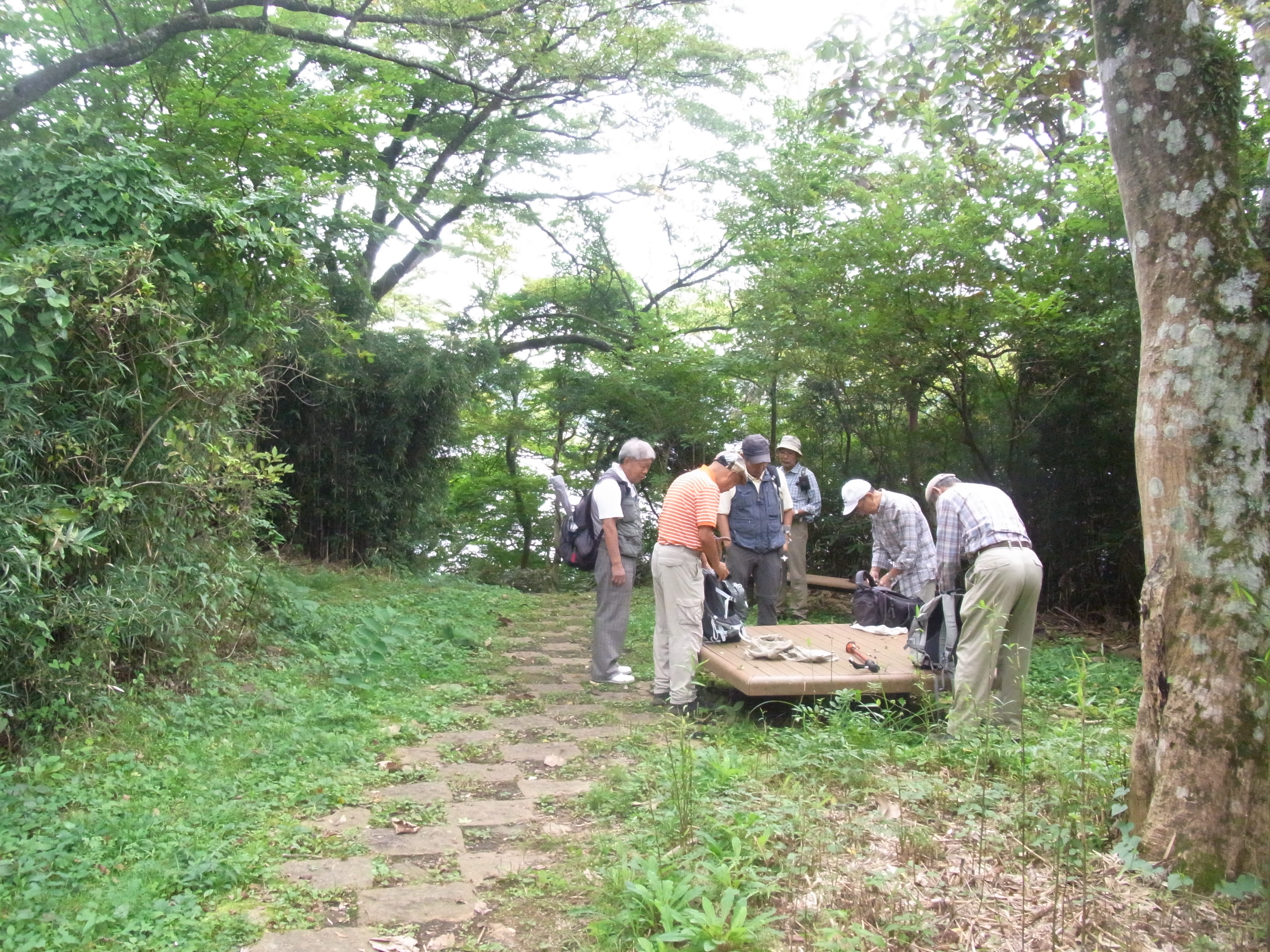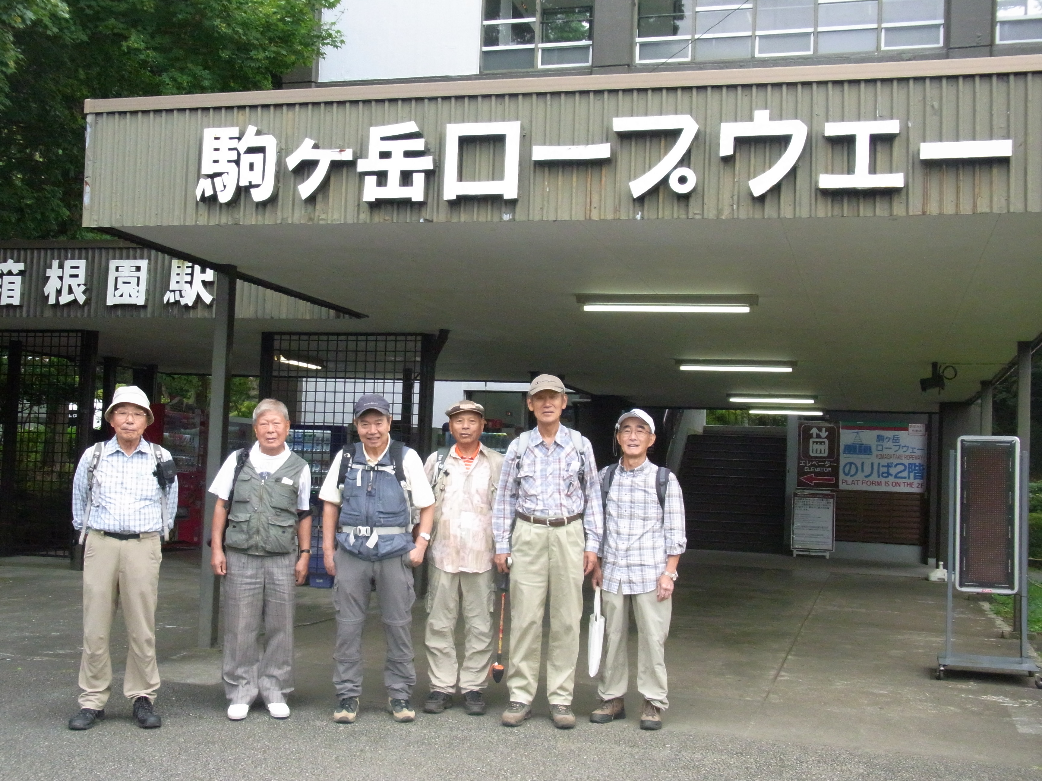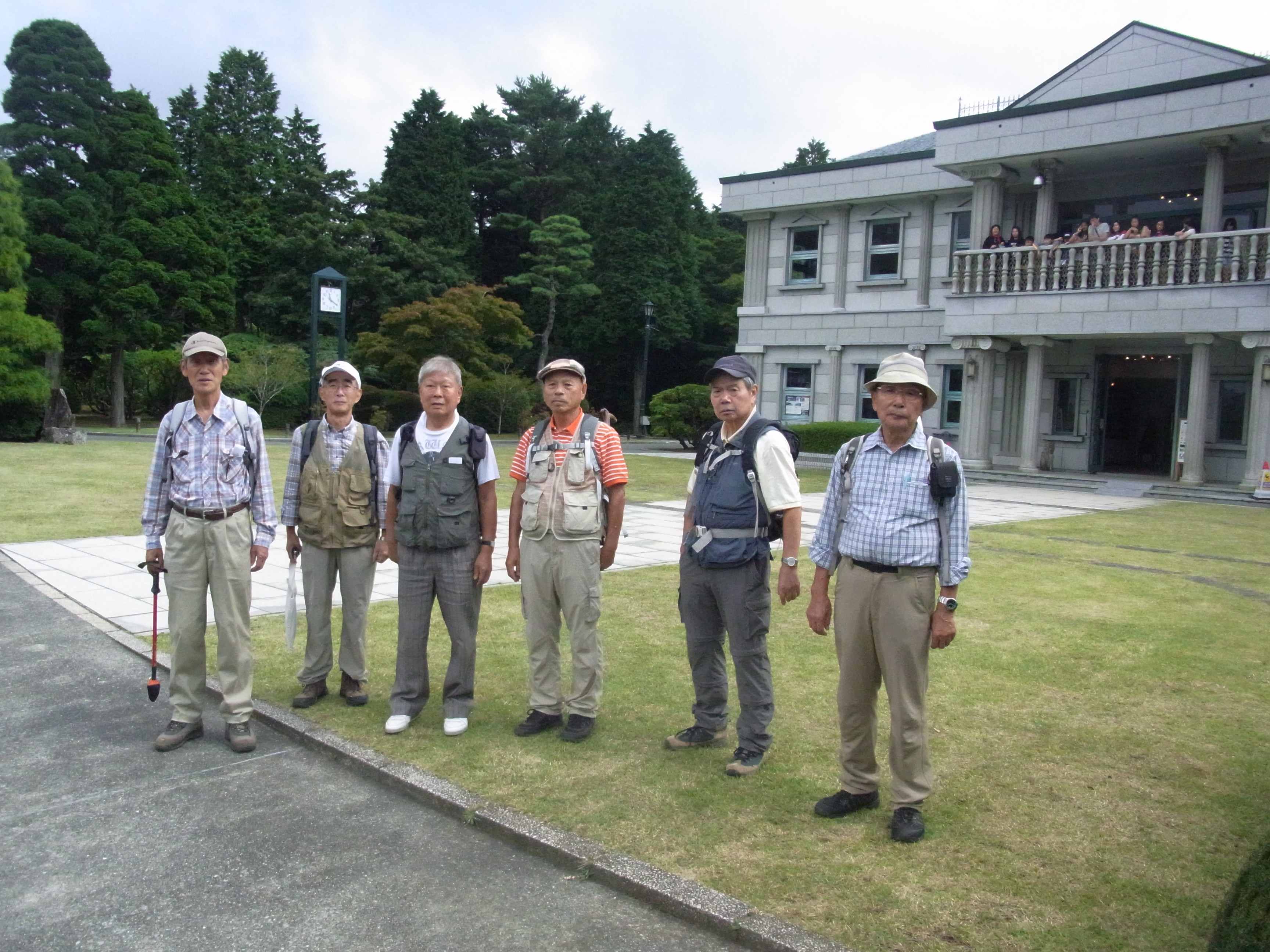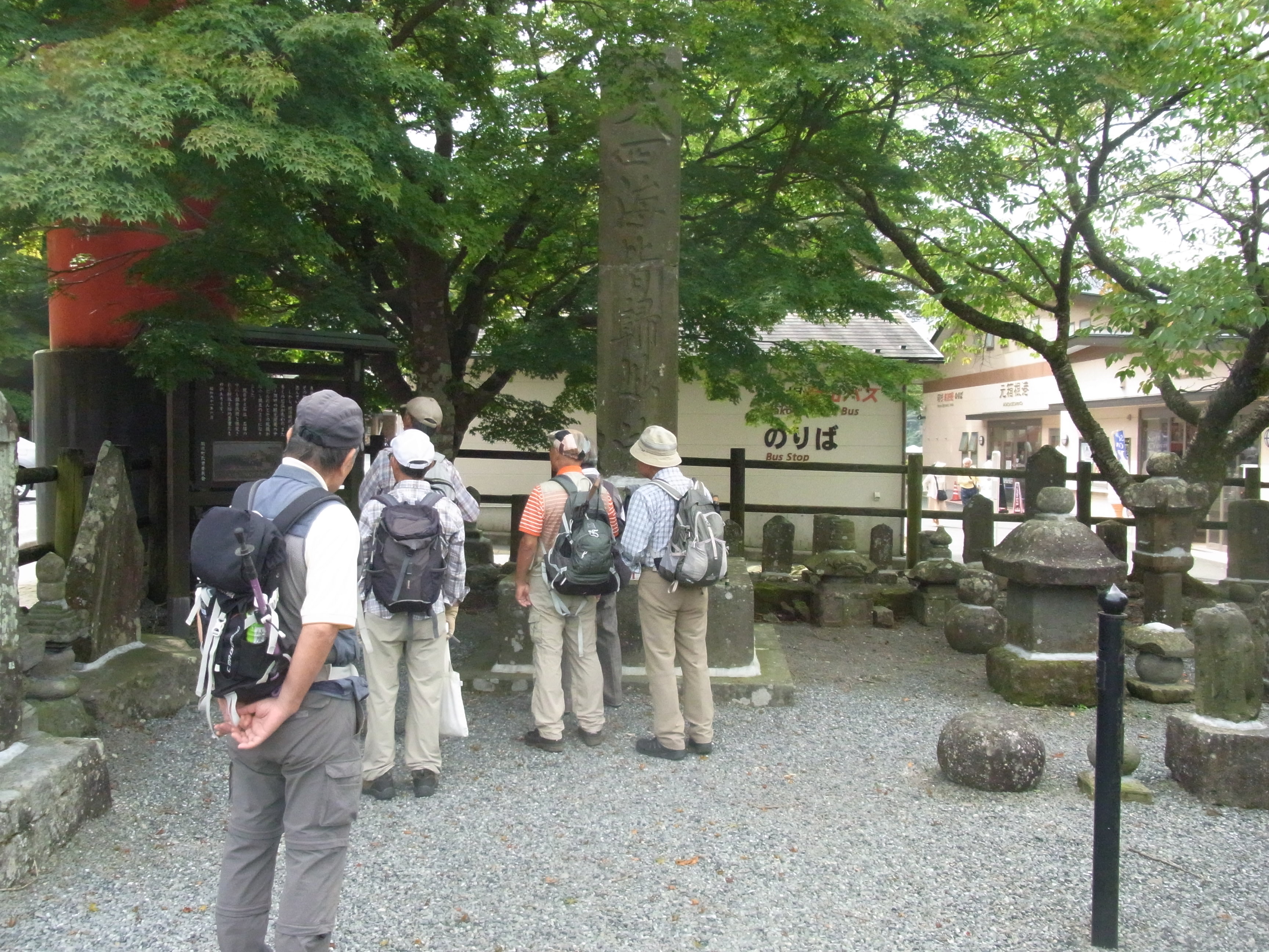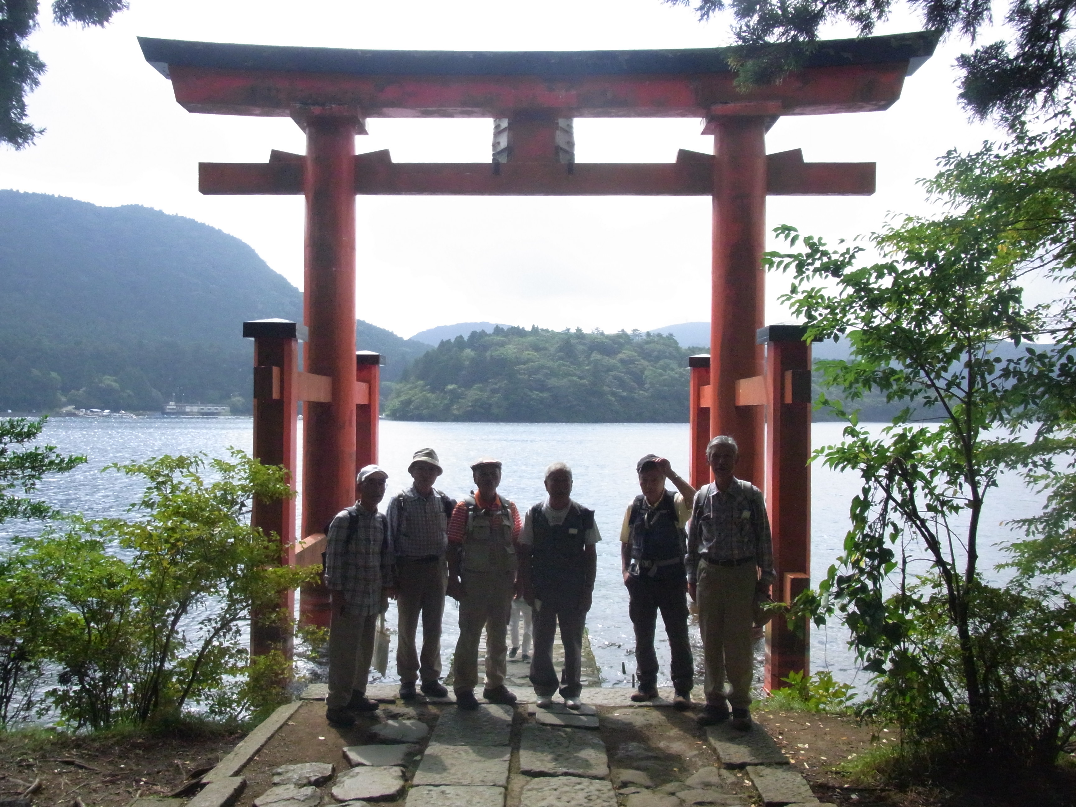 第169回 箱根・芦ノ湖湖畔散策写真撮影&記 中島 征雄 実施日 2017(H29)年9月27日(水) 天候 曇り 行き先 駒ケ岳・神山から箱根・芦ノ湖湖畔散策に変更 コース 小田原駅東口バス停⑤8:10⇒9:22箱根園~駒ケ岳ロープウェイ乗り場9:27~湖畔遊歩道~10:10箱根神社下湖上鳥居前~船庫~湖畔遊歩道~10:33賽の河原・一の鳥居10:35~10:47恩賜公園入口~10:55あずまや(昼食)11:20~恩賜公園バス停11:45⇒小田原駅 参加者 折本 文雄、古家 計、中田 信義、宇山 治男、杉田 勝行、野田 宏、中島 征雄 計 7名 GPSデータ 歩行距離:5.0km。 全体所要時間:2時間8分。 移動時間:1時間35分。 停止時間:33分。 移動平均速度:3.14km/h。 全体平均速度:2.34km/h。 概要 今日は、久しぶりに古家さんが参加。相変わらずお元気。小田原から1時間以上バスに乗り、やっと着いた箱根園で駒ケ岳へロープウェイで登ろうと乗車券売り場に行ったところ、「駒ケ岳からのハイキングコースは全て閉鎖されている」とのことで、急遽行き先を変更。芦ノ湖湖畔を歩くことにした。 元箱根に向かって車道を進み、途中から始まる石畳の遊歩道を歩く。箱根神社に近づくにつれ、観光客が増えてきた。箱根神社下の湖上鳥居(平和の鳥居)前で集合写真を撮り、湖水祭で使用する三艘の御船を収めた船庫を見、更に湖畔を進んで、芦川橋を渡り、恩賜箱根公園に入り、200段の石の階段を上り、広場にあるあずまや(休憩所)で昼食。昼食後、恩賜公園前バス停から小田原駅に戻った。 事前の調査が不十分であったため、登山道が全て閉鎖されていることを把握できなかったことは、世話役として参加した皆様にお詫び申し上げます。下見をしておればと悔やんでいます。 以上