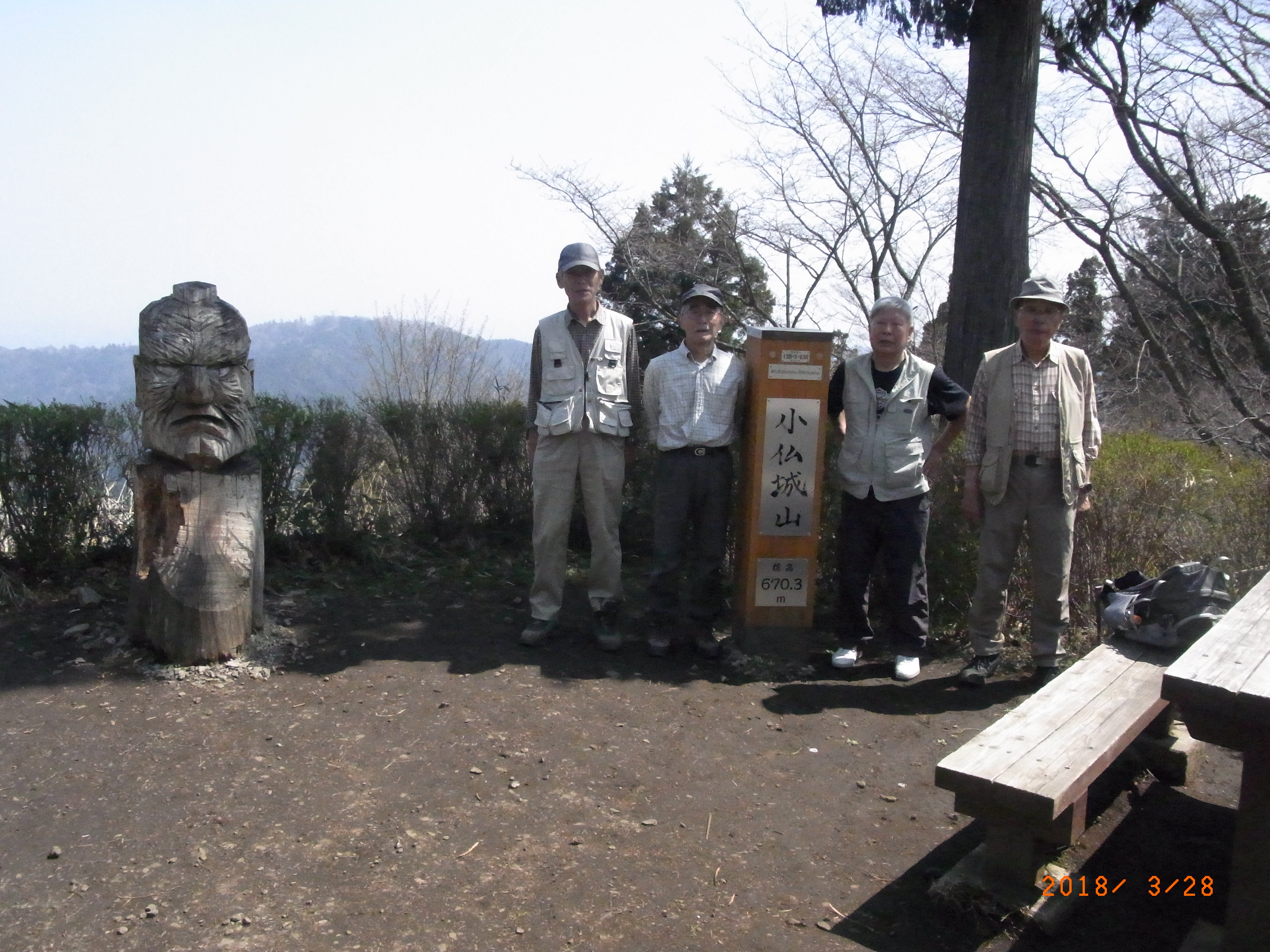 小休止を2度入れ、歩き始めてから2時間強で小仏城山頂上に着き昼食をとる。今日は霞んで眺望は良くない。桜の開花はまだまだ先のようだ。南斜面にはスイセンが咲いていた。暖かく、のんびりしていると眠くなってくる。