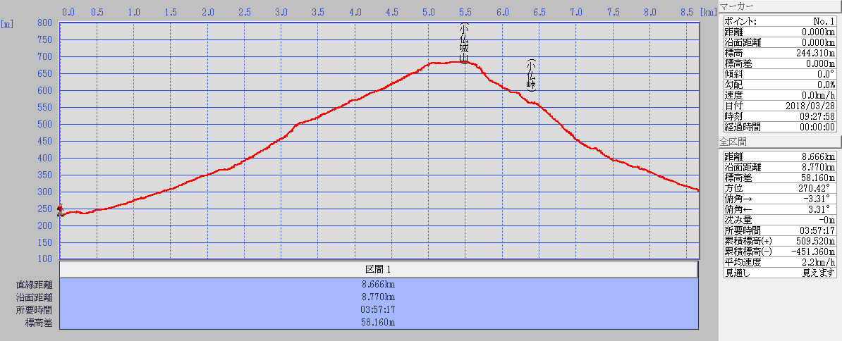 歩行距離:8.7km。 全体所要時間:3時間57分。 移動時間:3時間03分。 停止時間:54分。 移動平均速度:2.84km/h。 全体平均速度:2.19km/h。