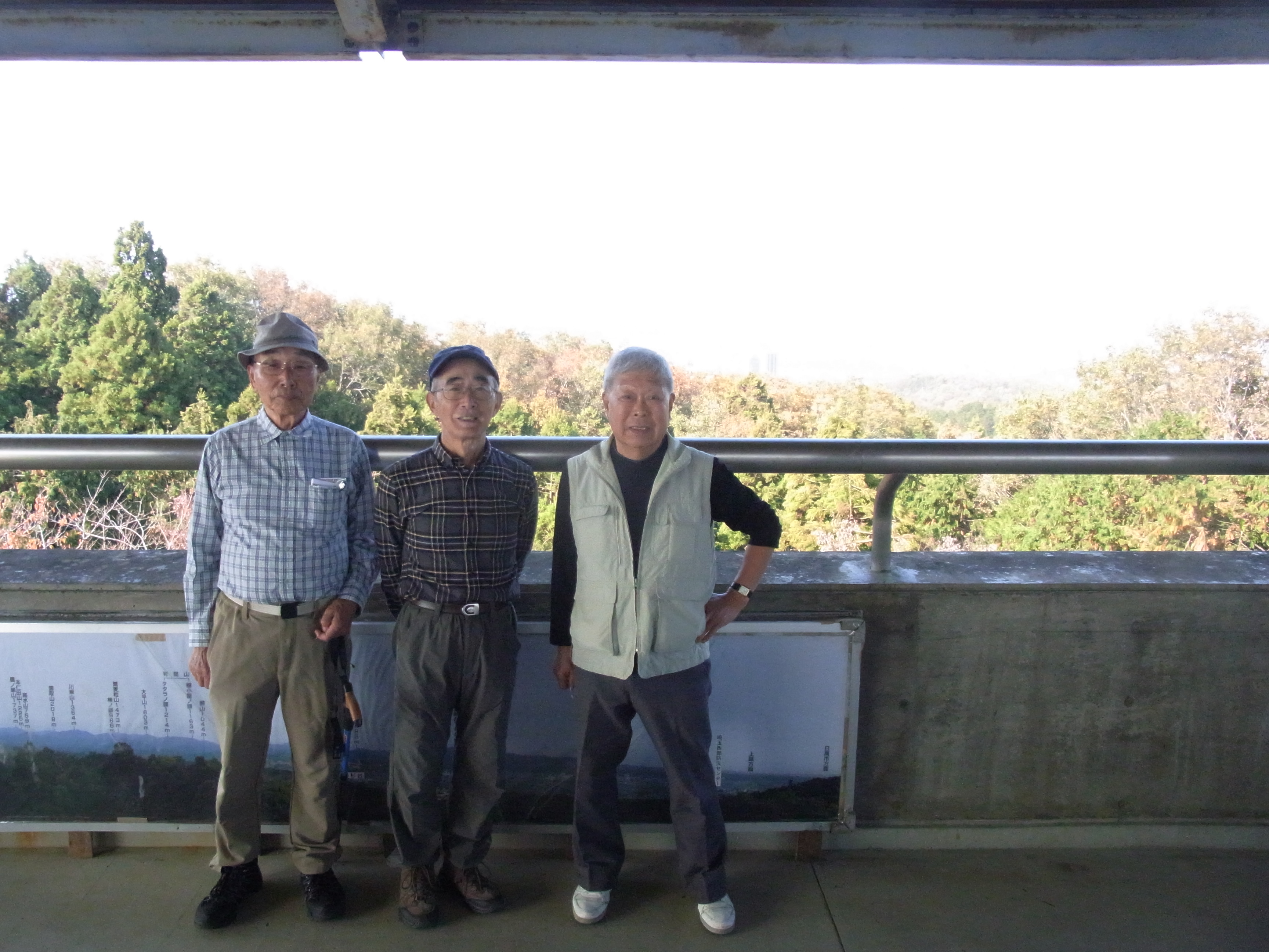 昼食後、高さ20mの展望台に上る。360度の展望だが、今日は霞んで遠くは見えない。大岳山は霞みの上に頭を出していた。