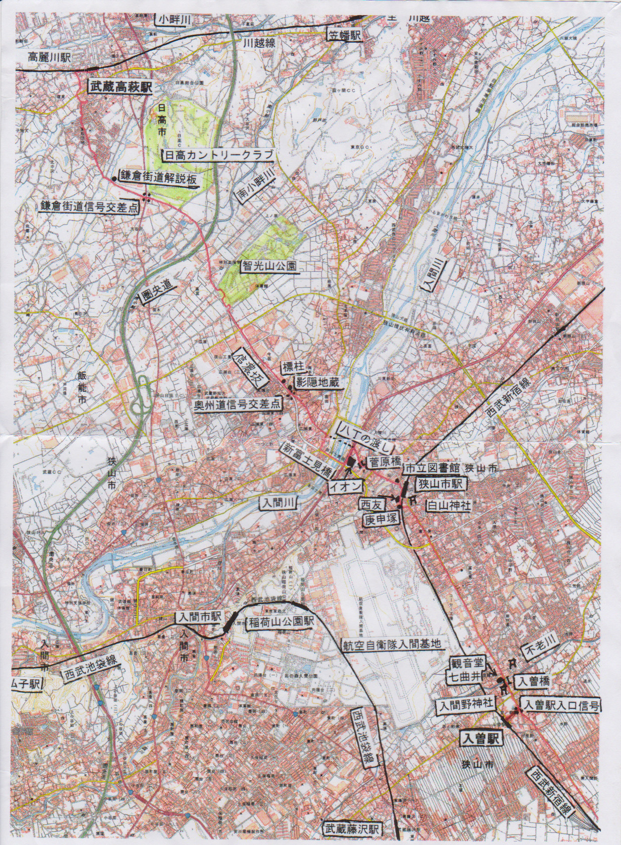 概 要 武蔵高萩駅を10時38分に出発。川越線に沿って進み、踏切で旧鎌倉街道に合流し左折(南下)する。200m程進んで右手の小道に入るのが旧街道に近い道だが、喋って見落とし直進してしまった。が、なんとかその先で旧街道に戻し進む。住宅地の細い道を右・左と曲がるので確認をとりながら注意して進まないととんでもない所にいってしまう。