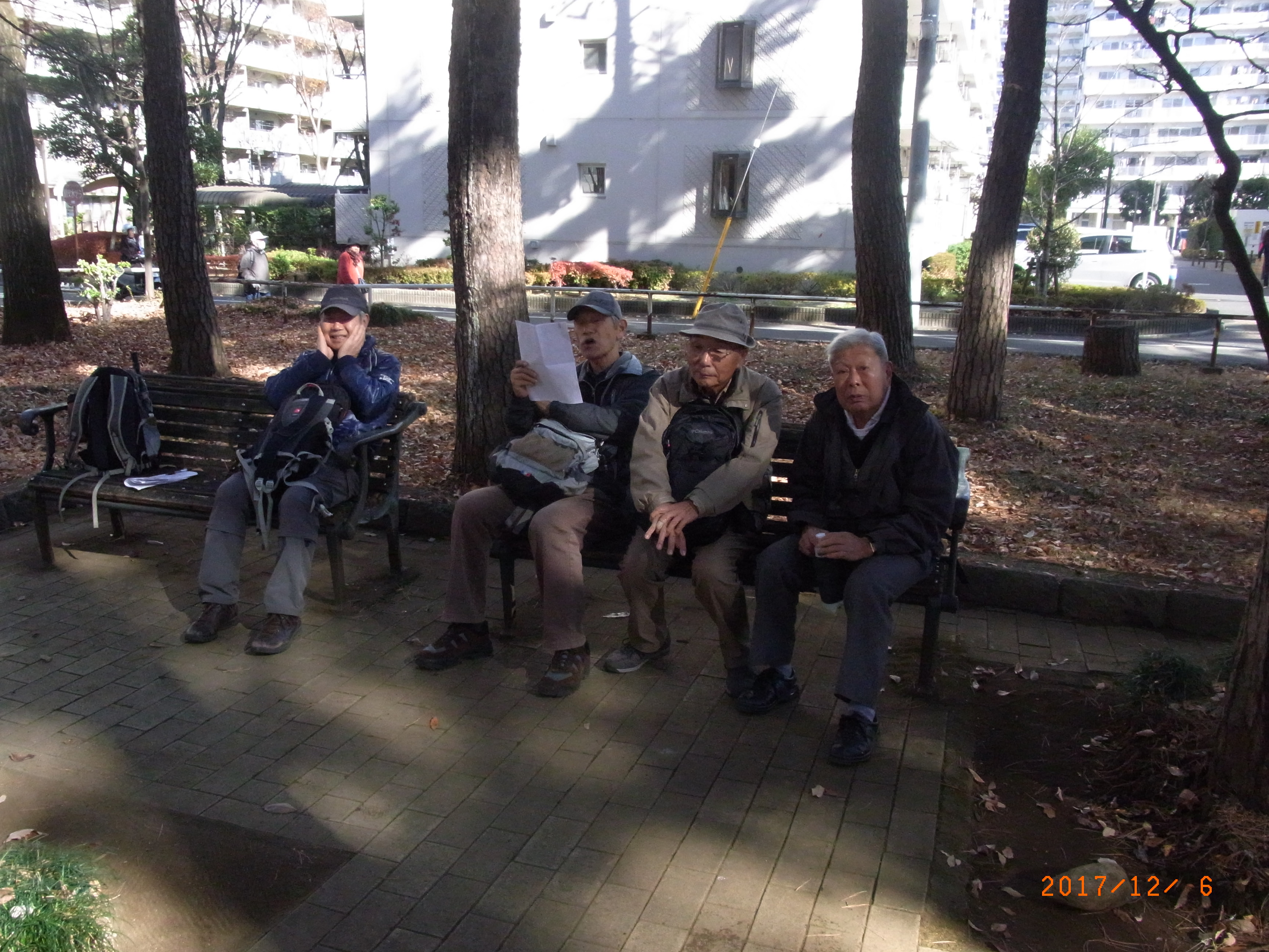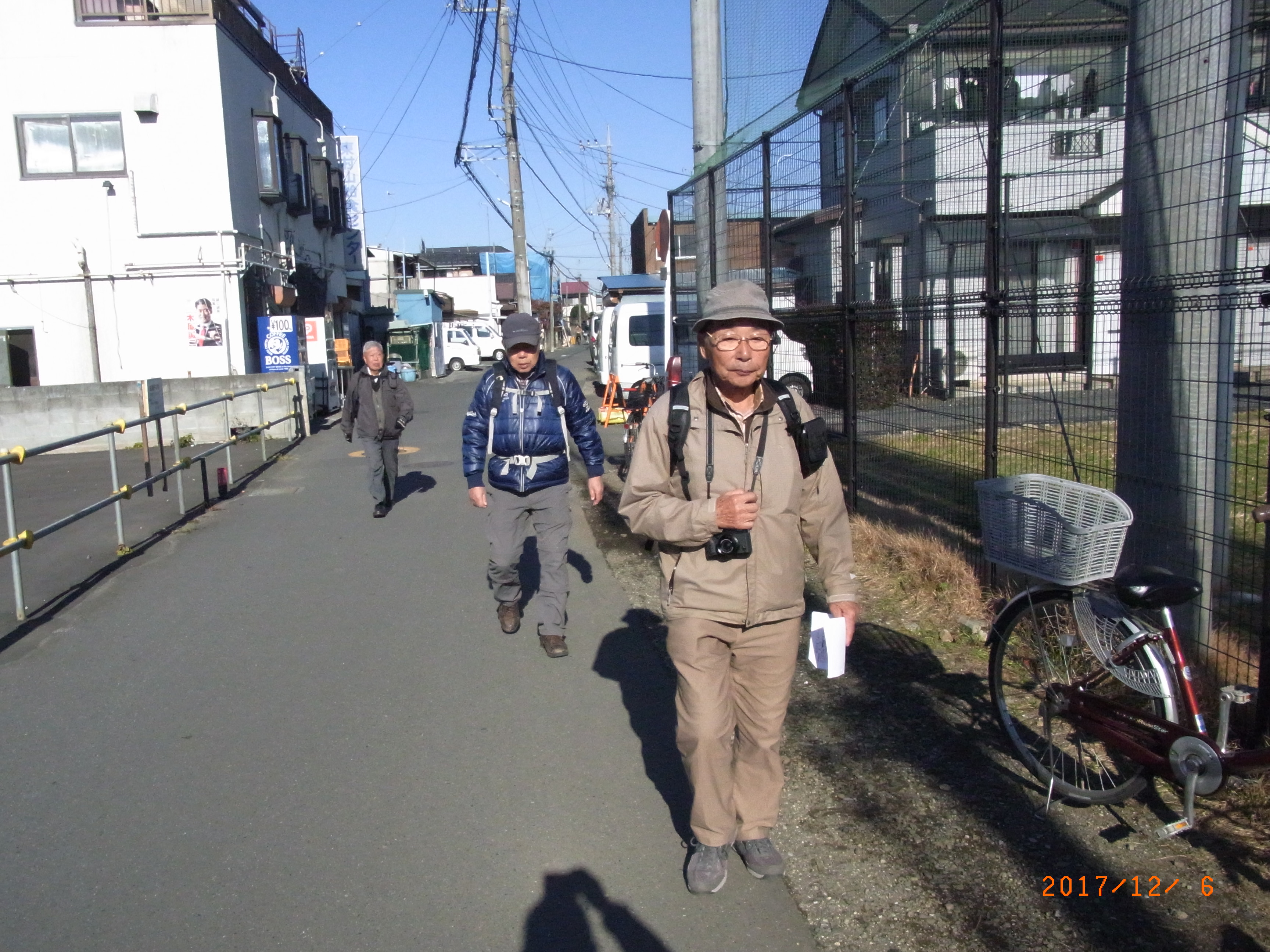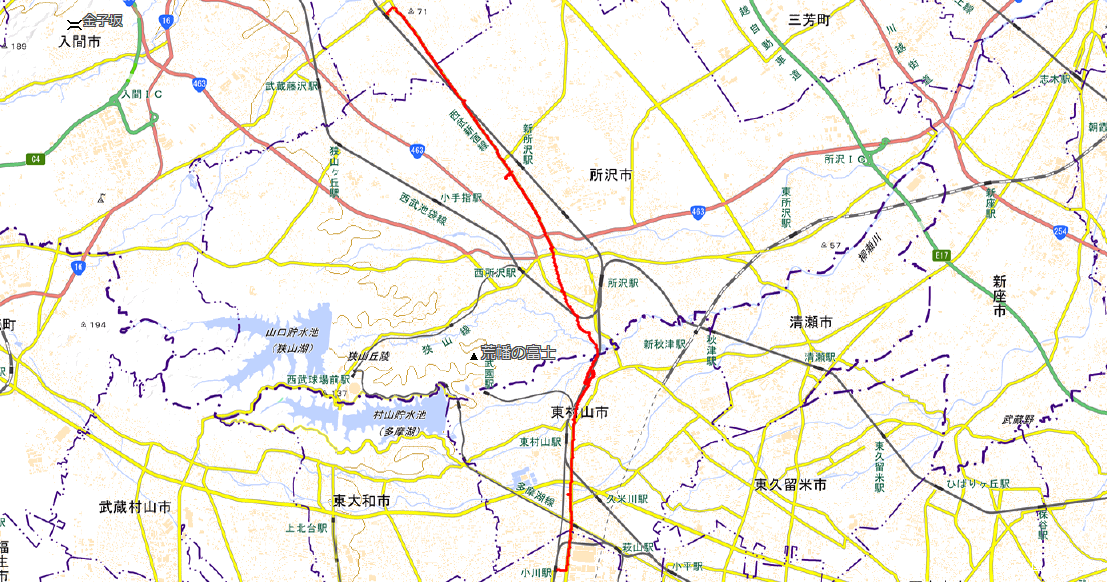 概 要 入曽駅に参加予定者が揃ったので計画よりも早く10時06分出発。県道50号線出て右折し、真直ぐな県道を只々進む。右に西武新宿線の操車場を見て進み、踏切を渡る。その後、県道50号線に続いて真直ぐな県道6号線を進んだ先の新所沢駅西入口交差点で腰痛の前北さんはここで中止し左手の駅へ、我々はは右手の公園に向かい休憩。(11:10~17)
