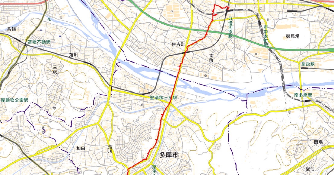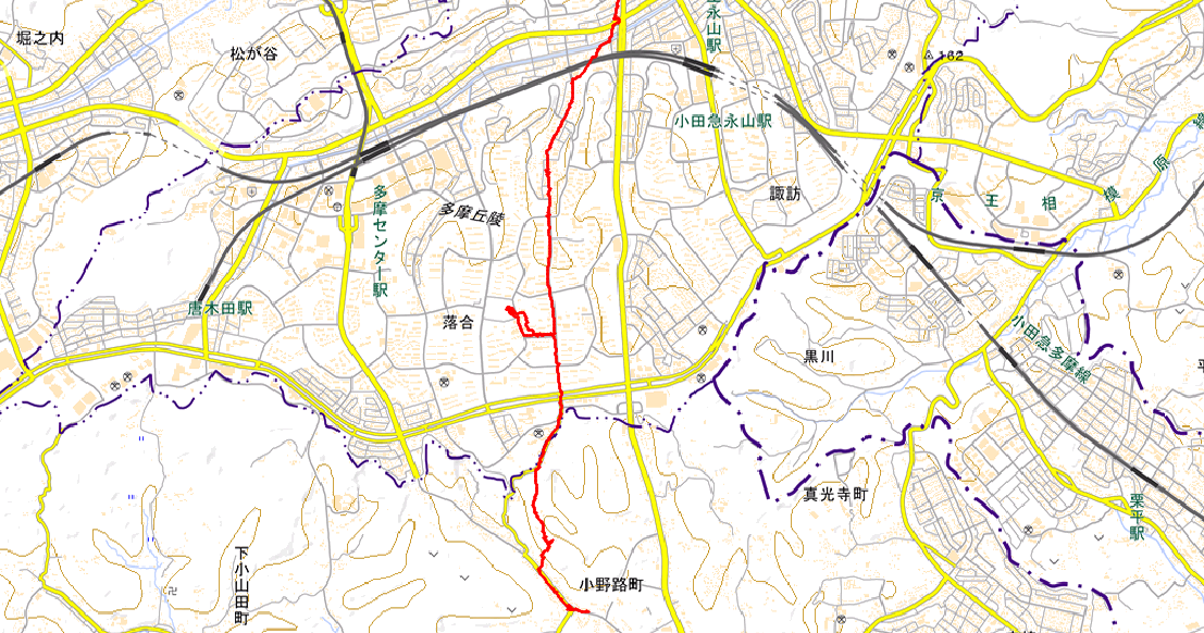 乞田五差路交差点で左折し、斜め右の道に入る。この道が旧街道で、先に見える尾根上に続いていたが尾根上には旧道は残っていないので、右側のバス通りを進む。道は上りが続く。ほぼ上り切った豊ヶ丘四丁目バスターミナルで右に入り豊ヶ丘南公園で昼食をとる。