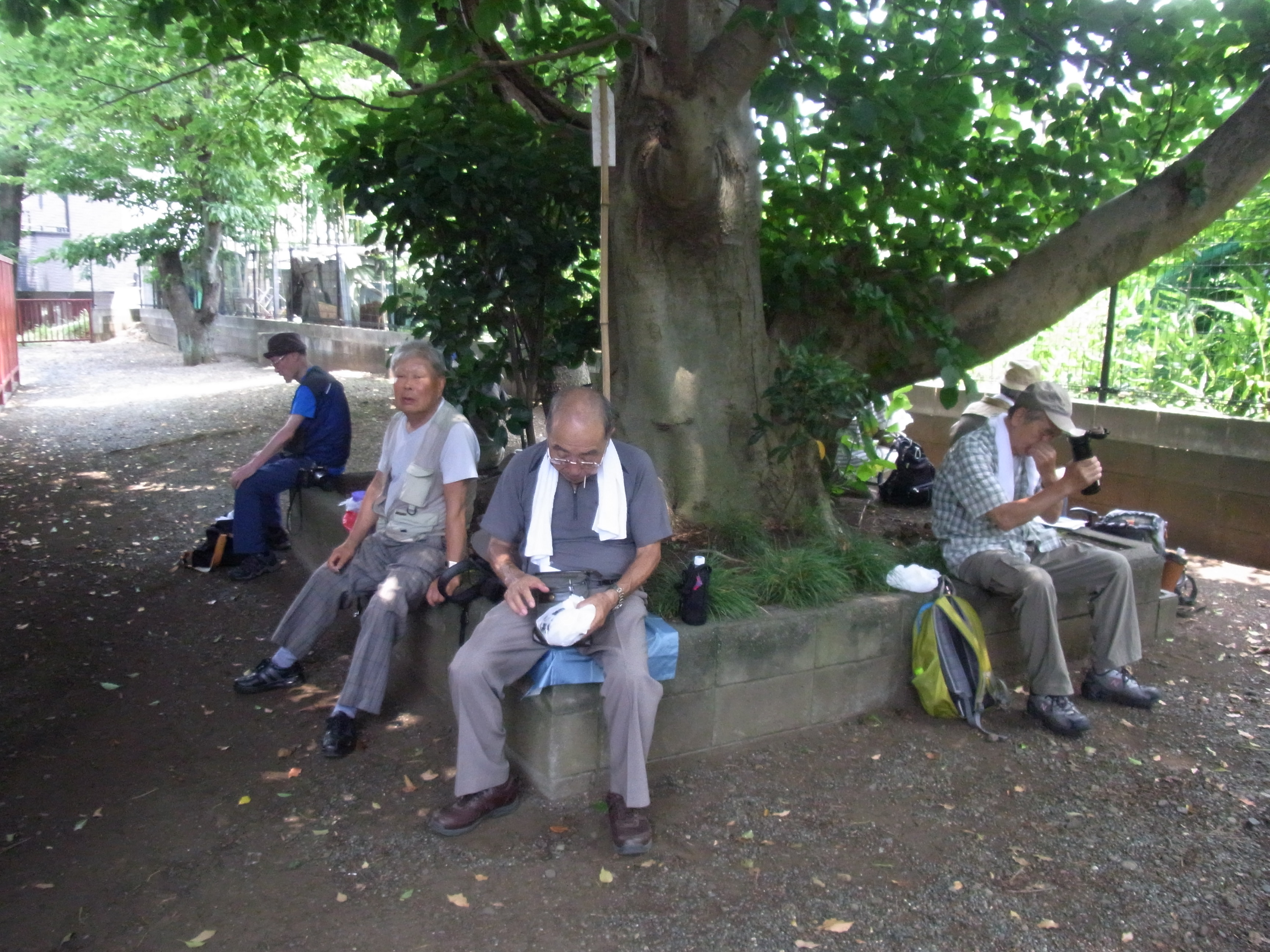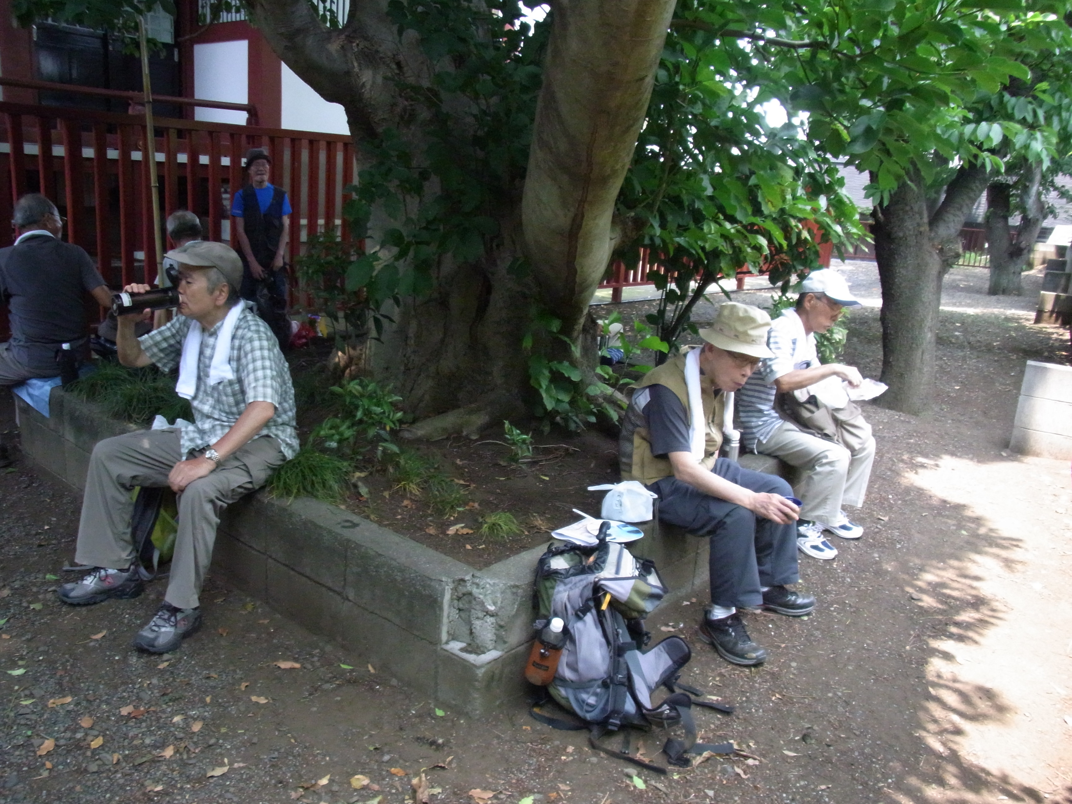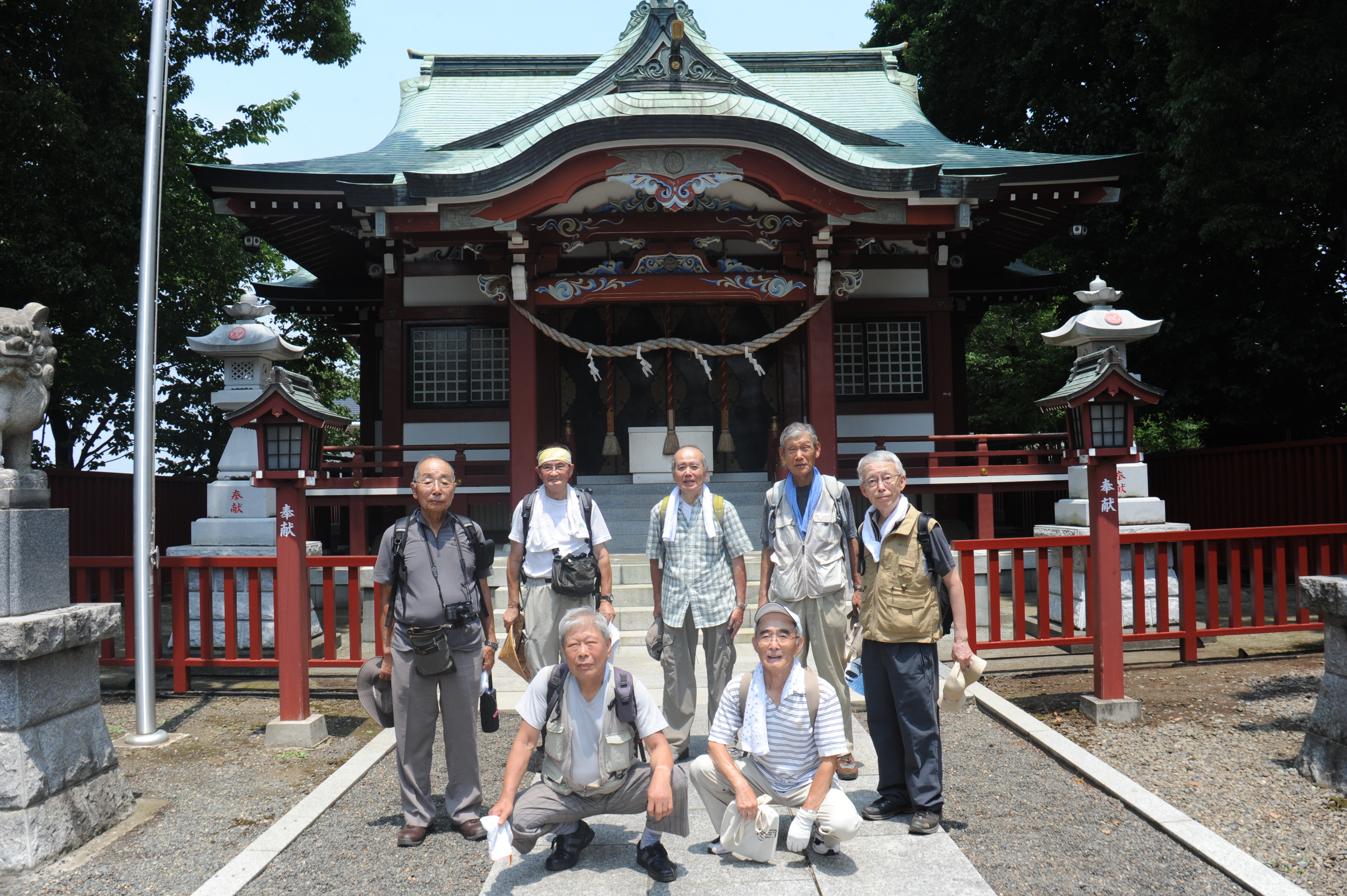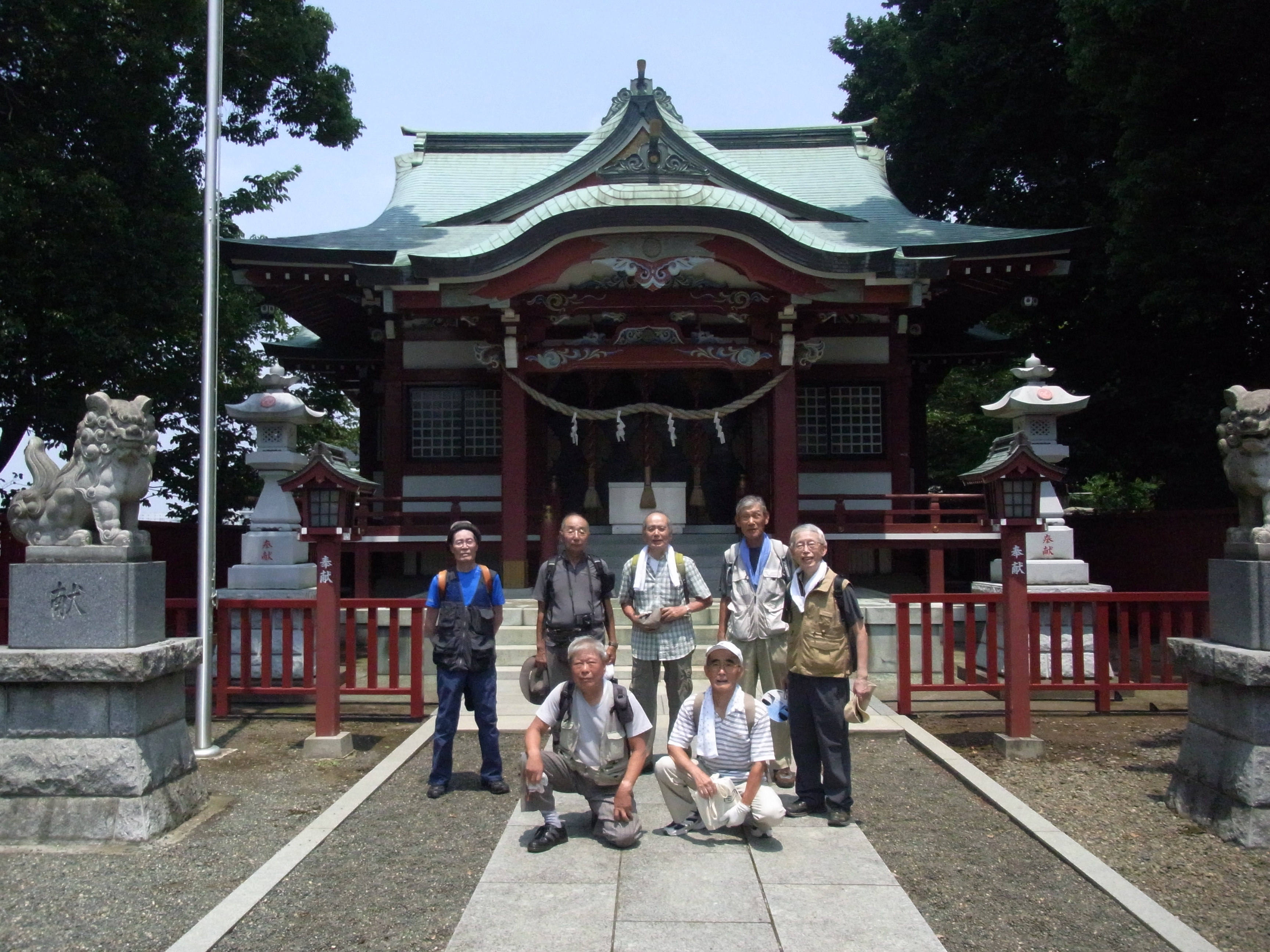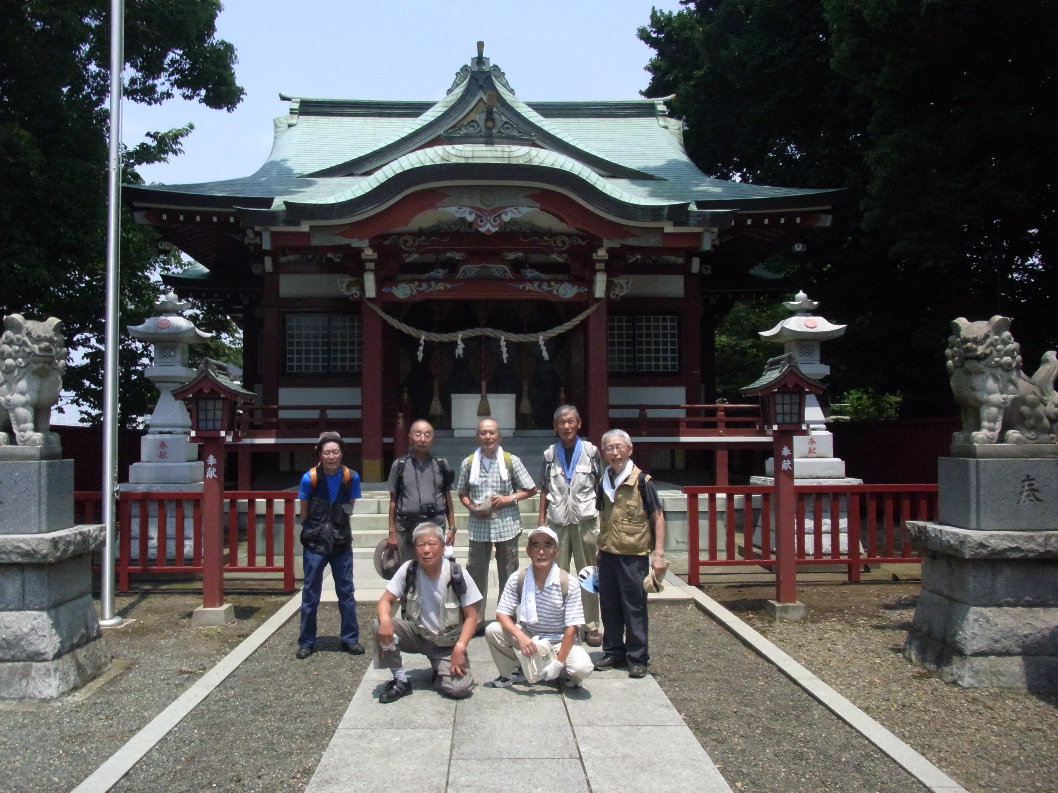10:36、都道を進み、鶴金橋信号の先で右斜めの細い道に入る。住宅地の中を進むと左手に「西田杉山神社」がある。休憩(11:00〜11:13)。西田杉山神社を左へ、先を右・左と曲がって進むと広い敷地の樹木販売「横田園」がある。都道56号線に出て右折、次の交差点を左折し、コンビニ・セブンイレブンのある交差点を右折する。(旧街道は西田杉山神社からこの交差点に続いていた)道を進むと左手に「熊野神社」があり、社殿横の木陰で昼食にする。(11:34〜11:58)涼しい風が心地良い。