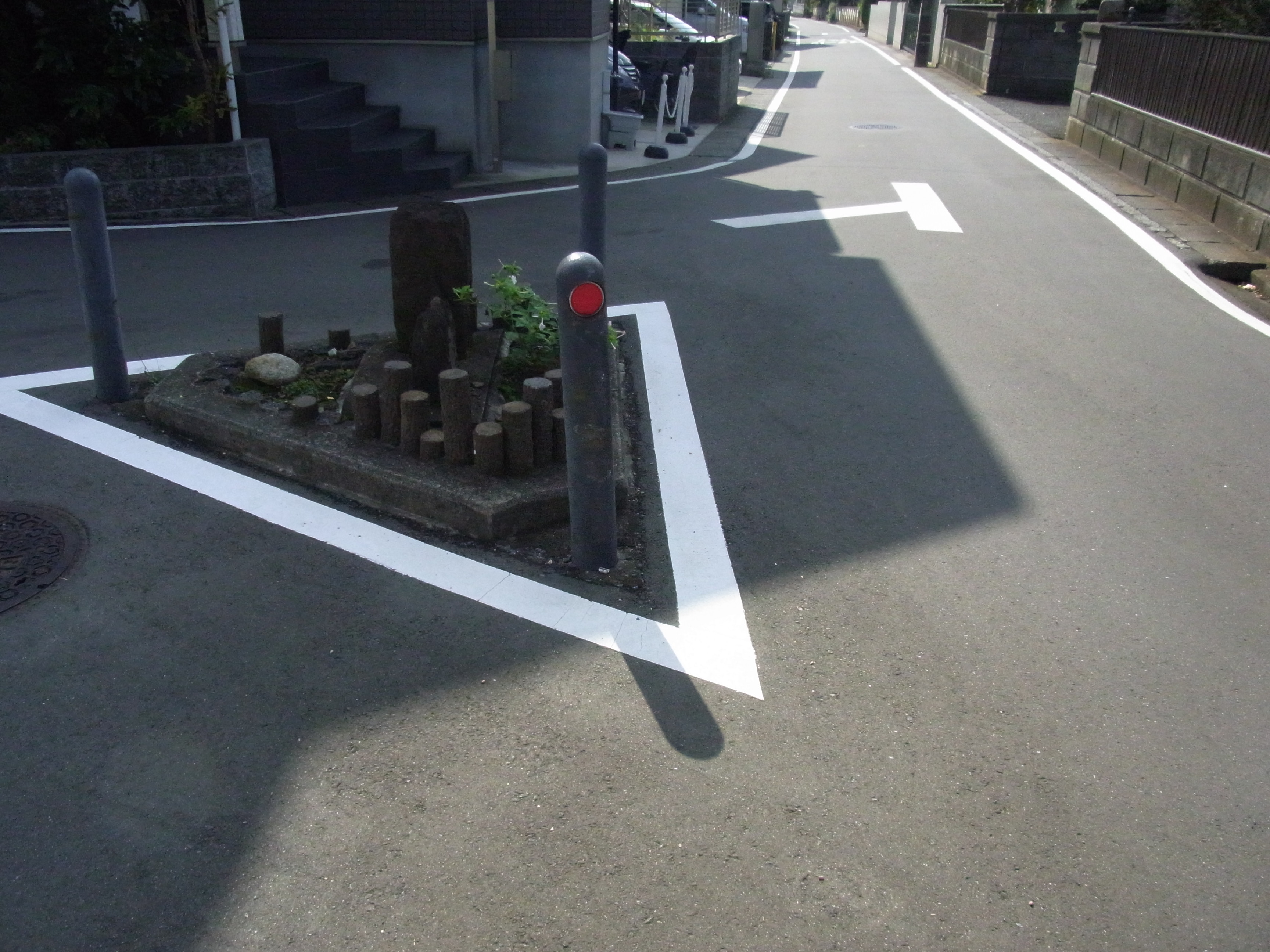 相沢川から離れ、神奈中上飯田車庫がある車道を横切り、細い道に入る。この辺りは昔は柳明(やなみょう)と呼ばれていて名主や代官の屋敷があったとのこと。今も大きな門と広大な敷地の家がある。左手奥に柳明神社があるので寄ってみる(12:09〜12)。神社の裏に八王子道(鎌倉道)と大山道の道標があった。
