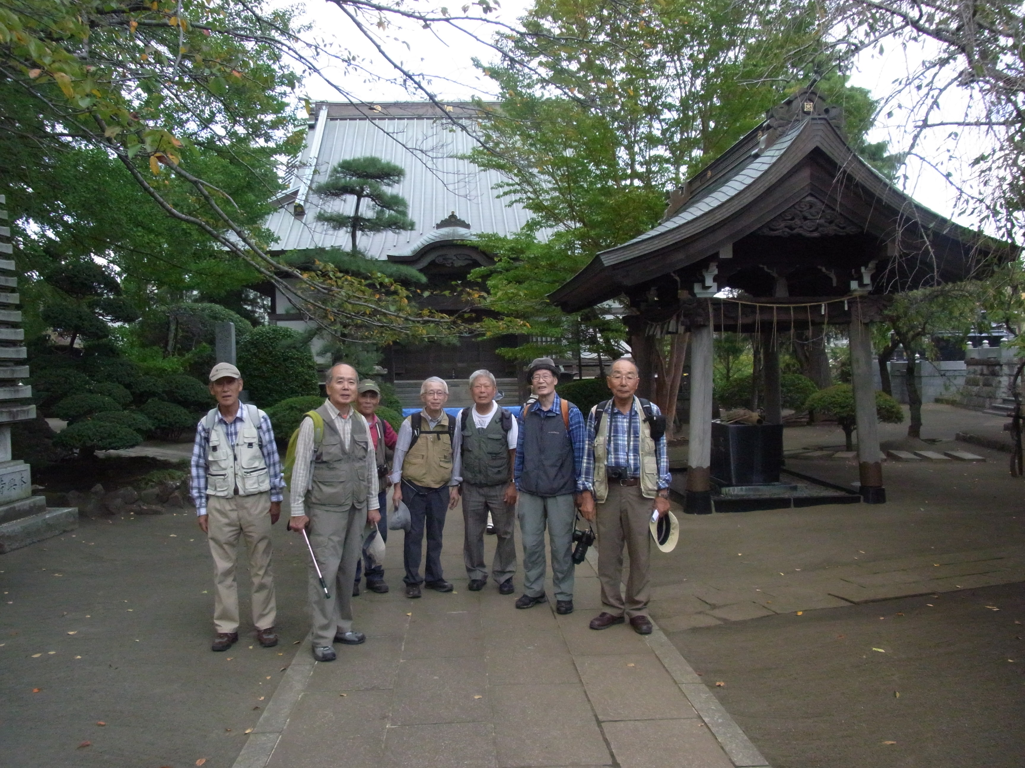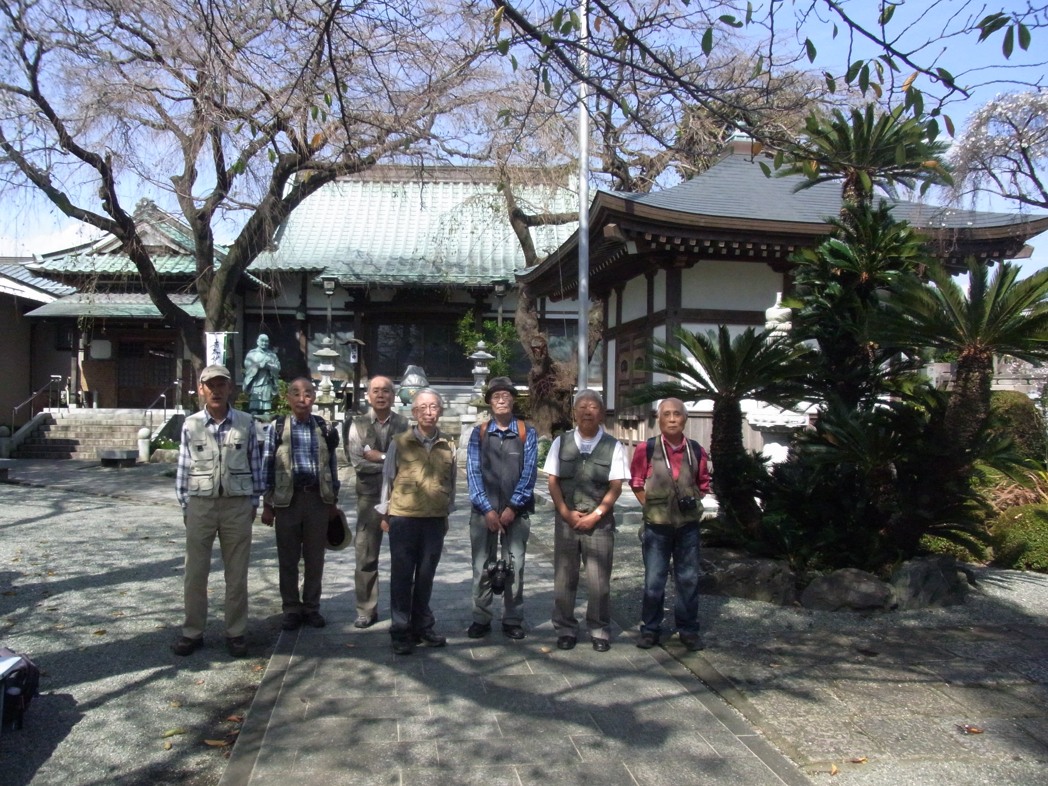羽太郷土資料館の辺りから約1.8km、県営いちょう団地の南端まで「せせらぎ緑道」として水路がある歩道がある。東海道新幹線のガードを潜り、いちょう団地脇のせせらぎ緑道を進む。県営いちょう団地は横浜市泉区と大和市にまたがる。両市合わせて80棟ほど、3592戸の県内最大の団地。左手に「本興寺」があり、立ち寄る(12:28〜37)。広大な敷地の本興寺は日蓮上人ゆかりのお寺。街道に戻り、団地沿いに左右にカーブし進むと車道に出る。右折しすぐの道を右折したところに今日のゴール「台村バス停」がある。12時53分到着。13時02分のバスに乗る。戸塚駅まで行く八木さんを除いて7名は泉区総合庁舎前で下車。相鉄線いずみ中央駅に向かう。