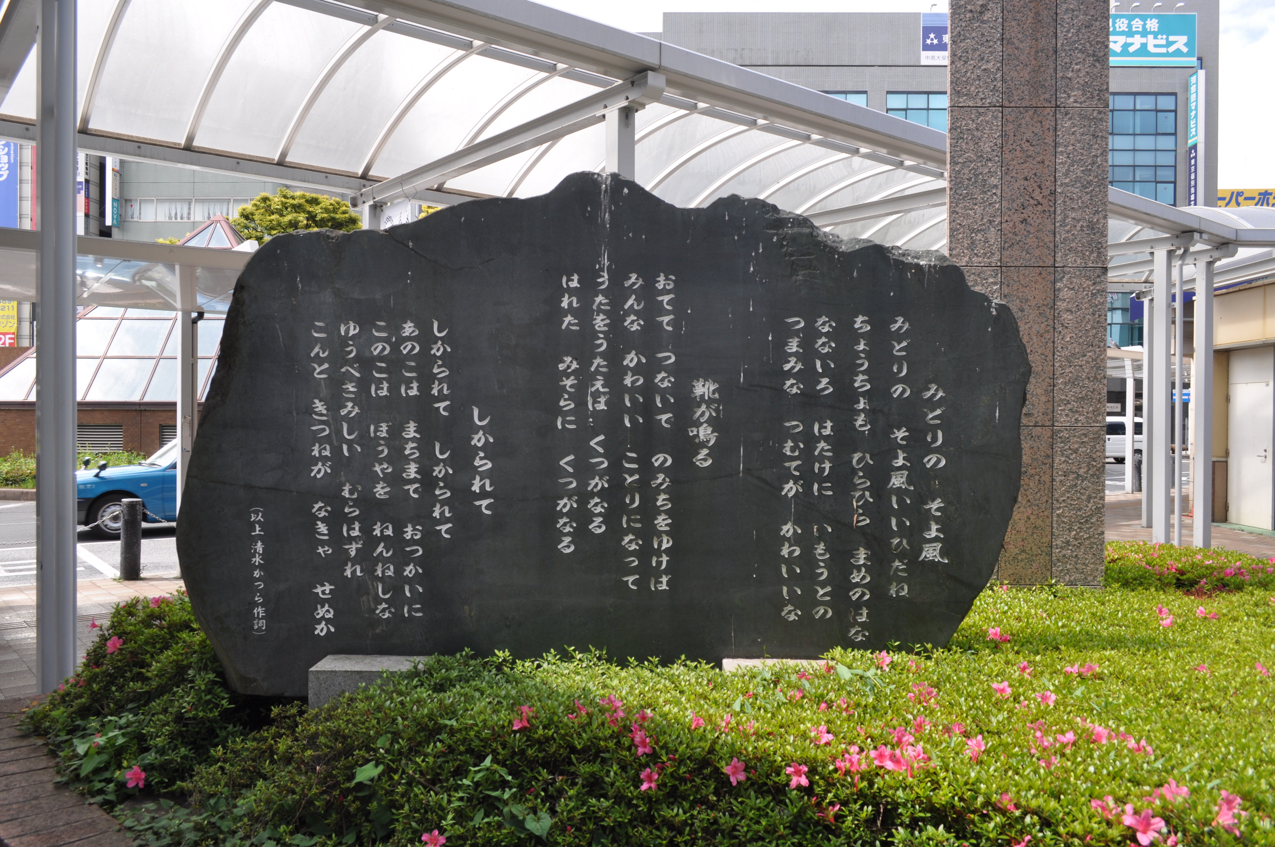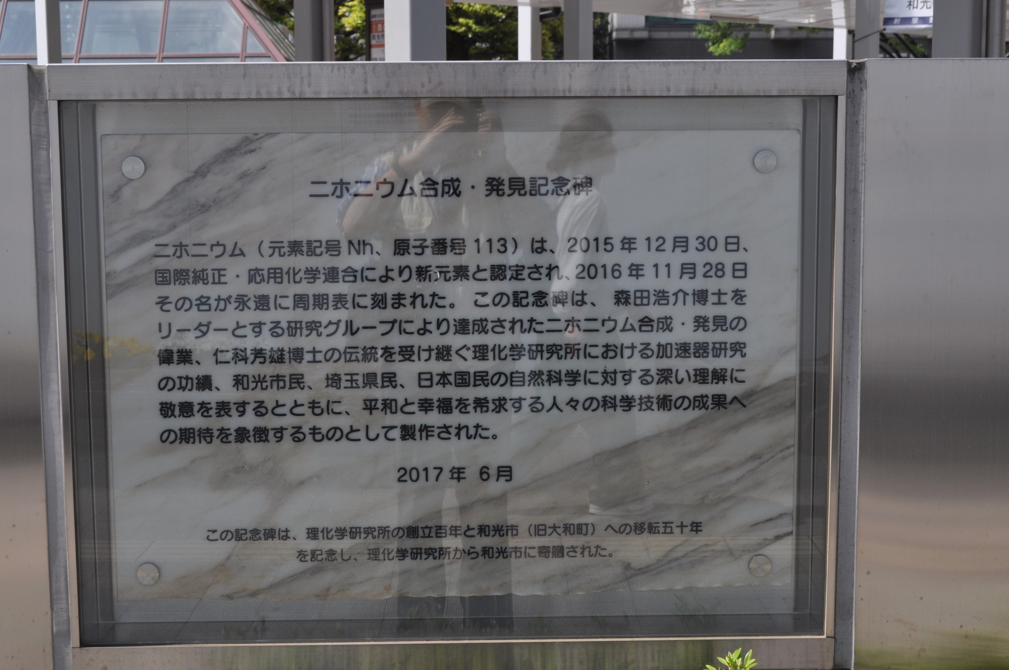 和光市駅前に「清水かつら」の童謡が彫られた石碑と「ニホニウム合成・発見記念碑」がある。