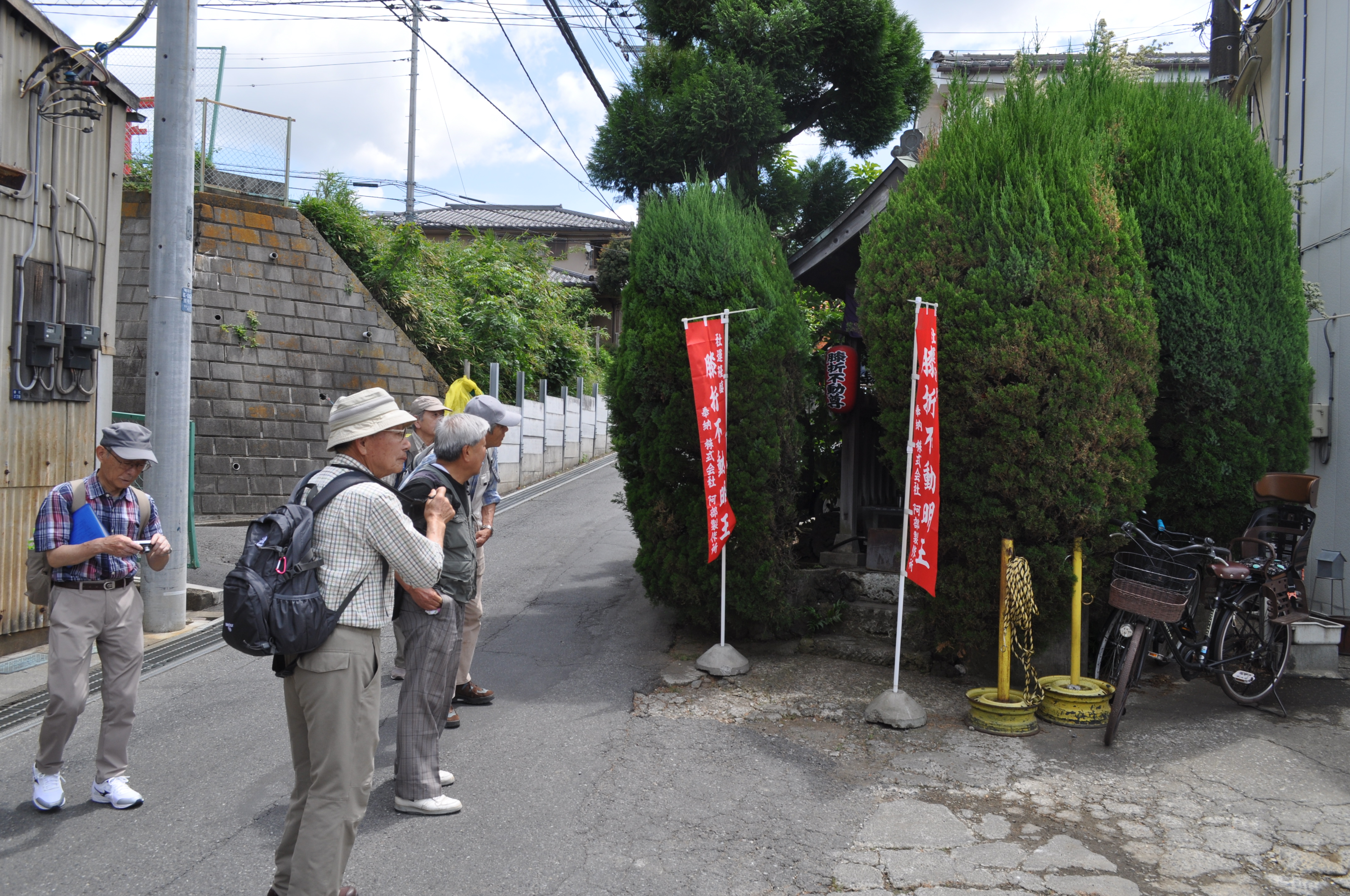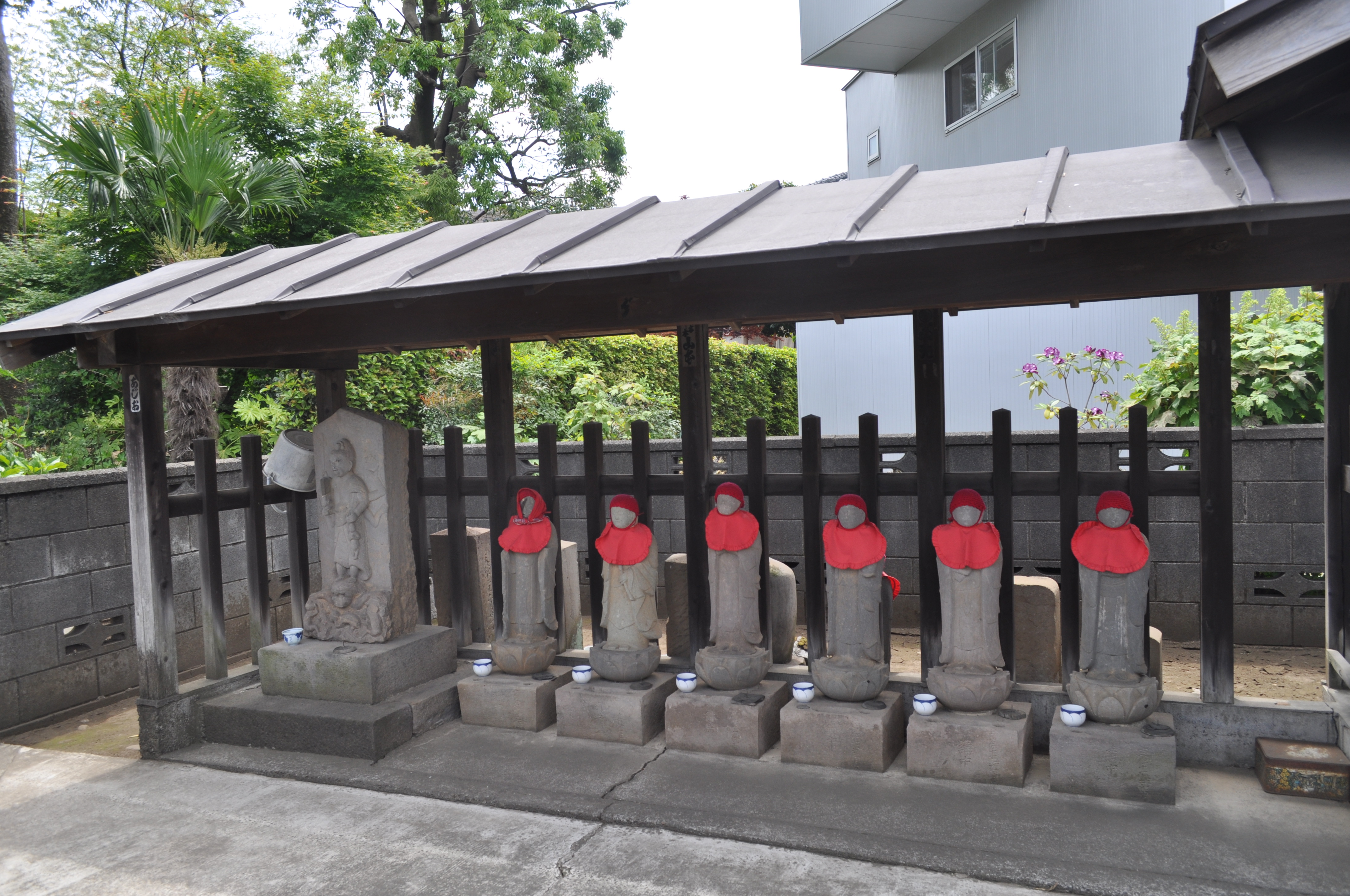 交差点に戻り、県道109号線を横切って進み、黒目川を大橋で渡る。次の交差点の先にY字の三叉路があり、分かれる角に「庚申塔」がある。Y字の左の急坂は「たびやの坂」と呼ばれている。上りきって台地を行くと県道109号線に合流。5〜60m行くと左に「横町の六地蔵」が祀られている。六地蔵の他に青面金剛庚申塔や地蔵尊像が祀られている。