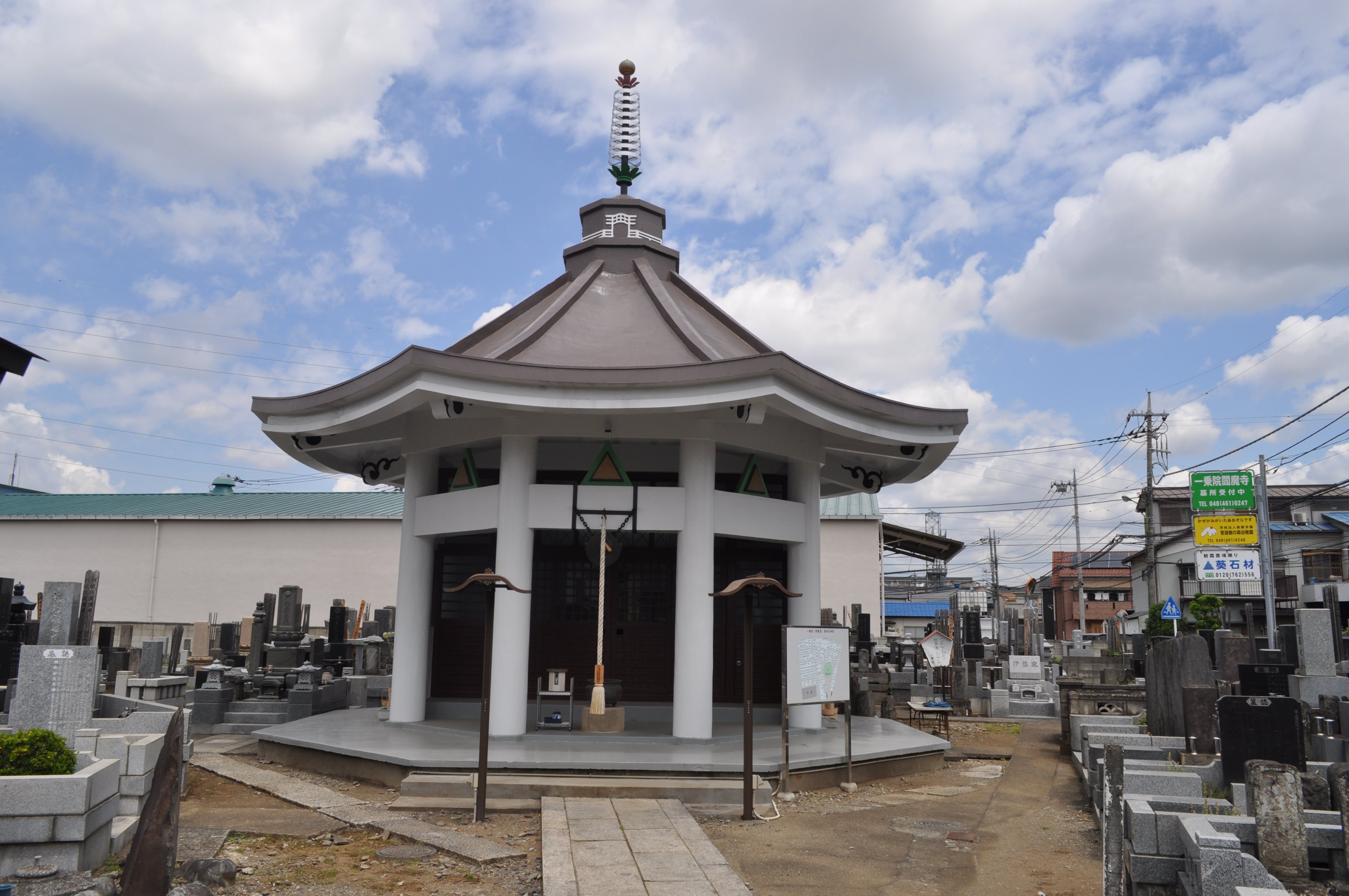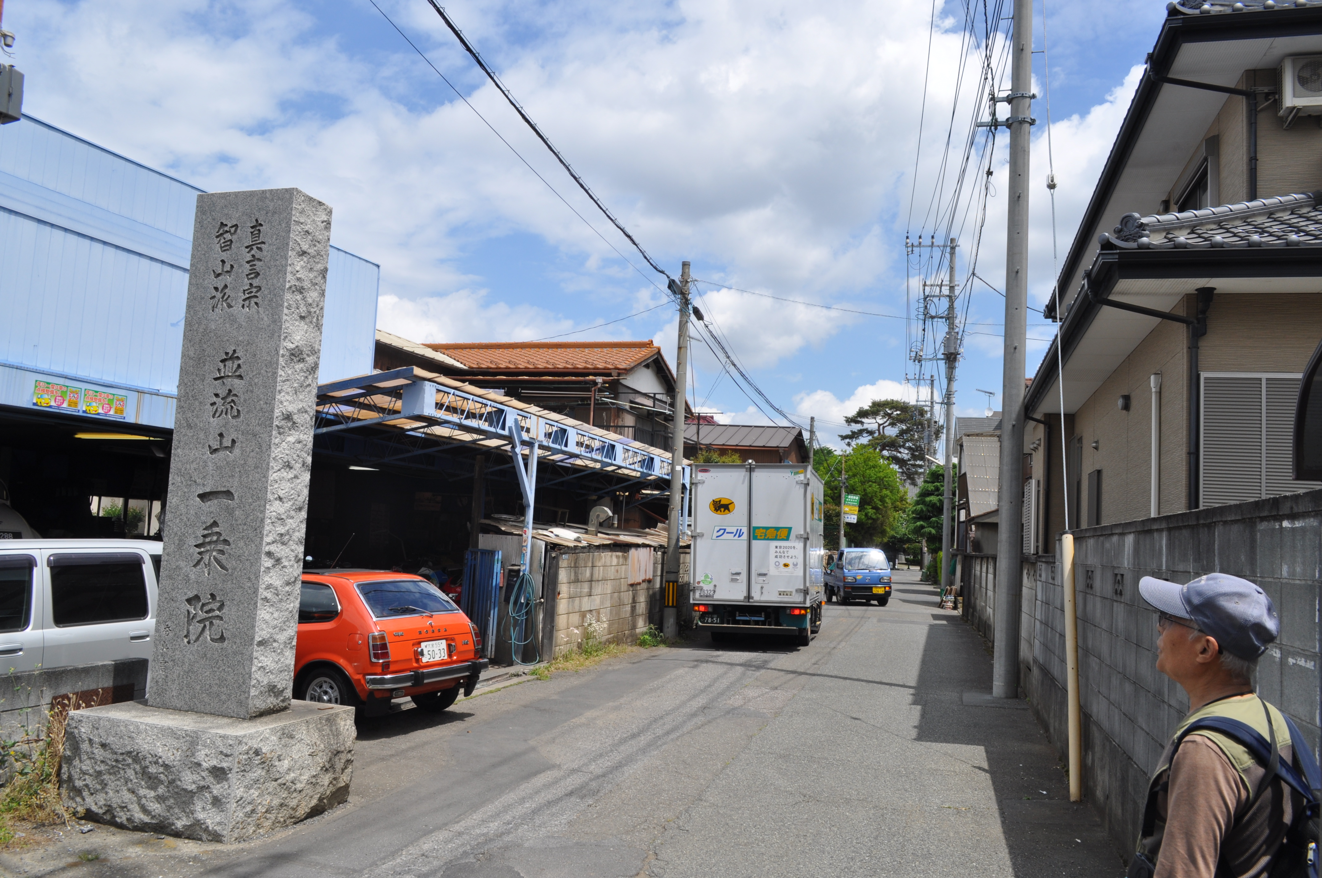坂を下りて県道と合流した辺りから「膝折宿」が始まる。宿の範囲は、黒目川の手前辺りまで。県道との合流点から100m程の右側に「並流山 一乗院」の院号石柱があり、その奥に「一乗院(朝霞観音)」がある。(10:53)