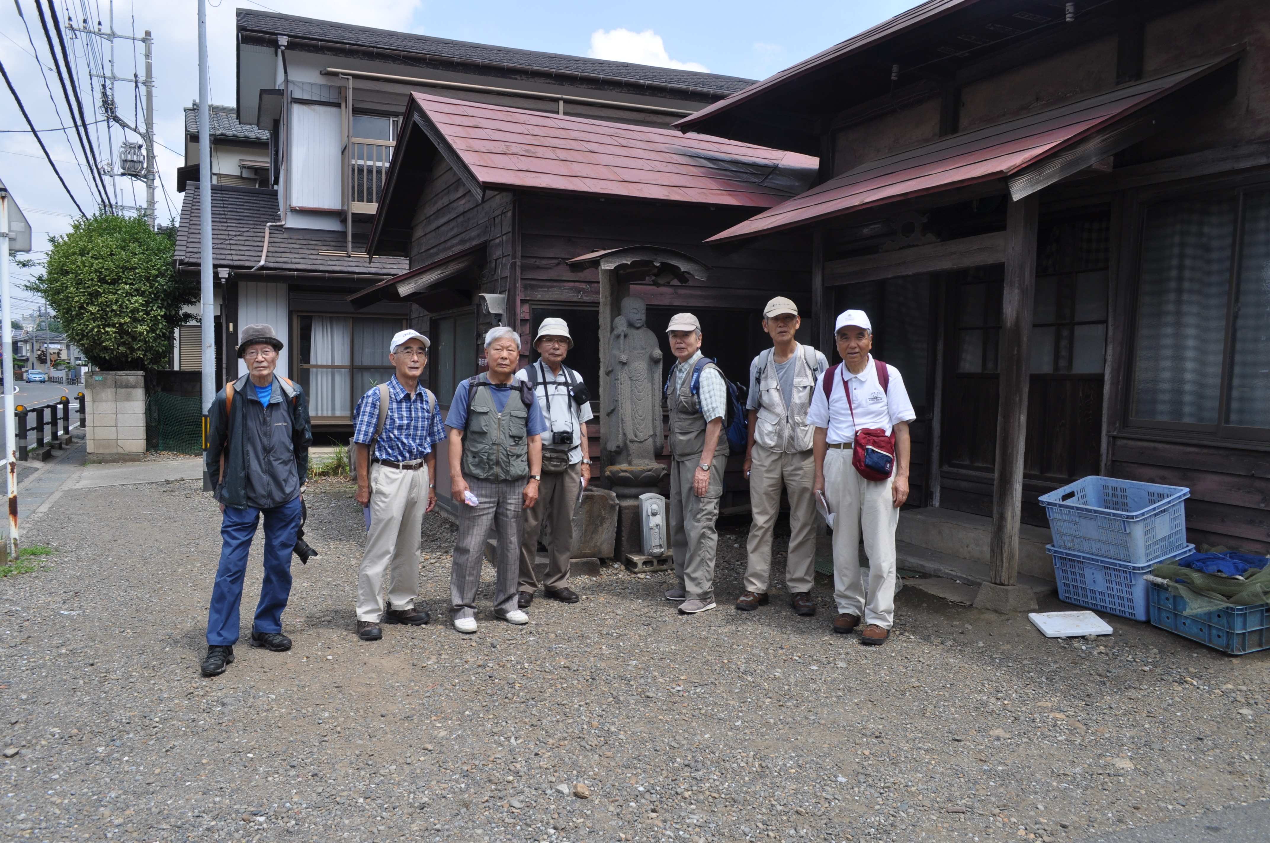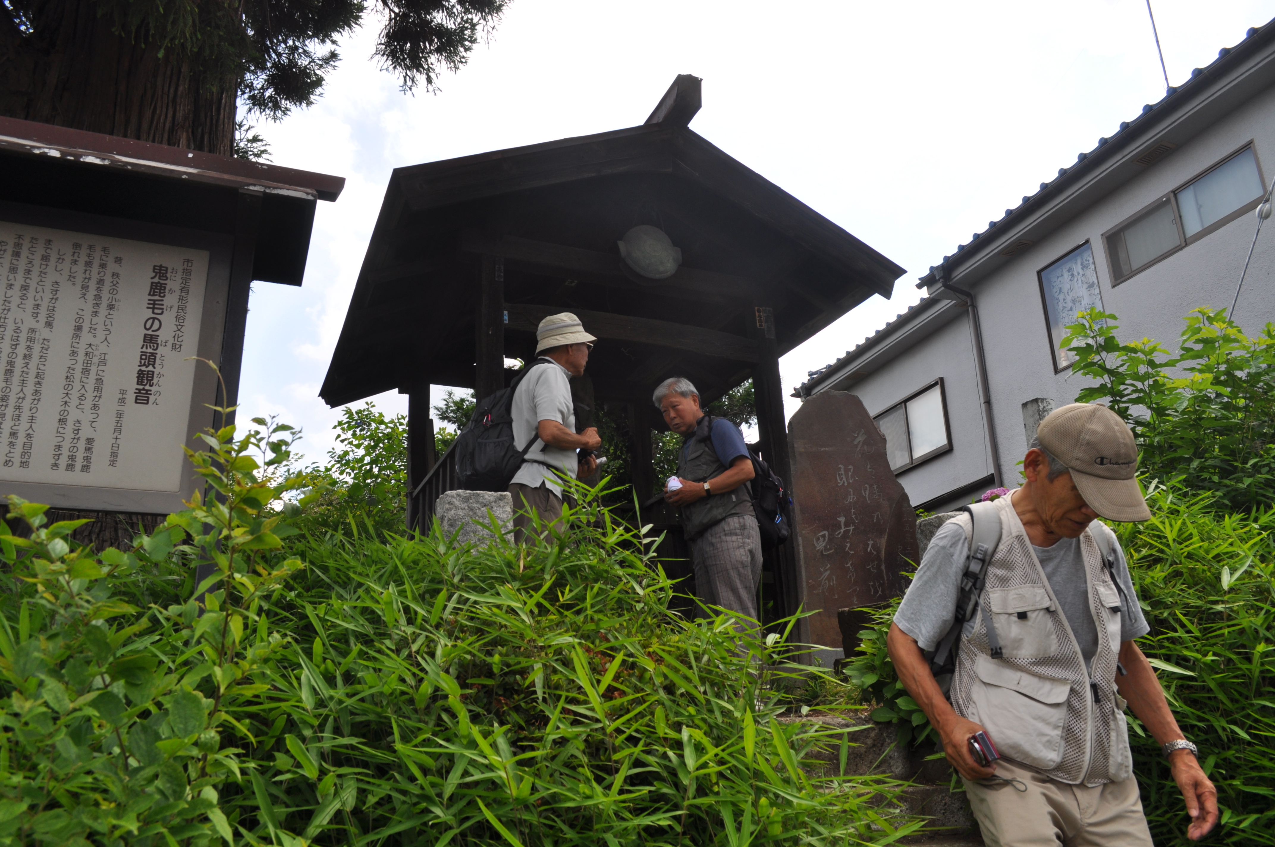 新座駅を9時41分に出発。今日は、大和田、大井の2宿を歩きます。ジョナサンの先で左折し、武蔵野線を潜って旧川越街道(県道109号線)に出て左折。鳥居が4基も連なっている「神明神社」に寄る。大和田地区に入り、坂を下り始めた右の高台に「鬼鹿毛の馬頭観音」が祀られている。かたわらに「馬頭観世音拝禮塔」や『花は賤乃 眼にもみえけり 鬼薊』の芭蕉の句碑、「鬼鹿毛の馬頭観音」・「川越街道」の説明板もある。(10:00)少し下った左手の奥に「石造の地蔵菩薩立像(高地蔵)」と庚申塔、六地蔵がある。高地蔵は、大和田地区の両端に一体づつあって、この高地蔵は、大和田地区の江戸よりにあったものがここに移された。