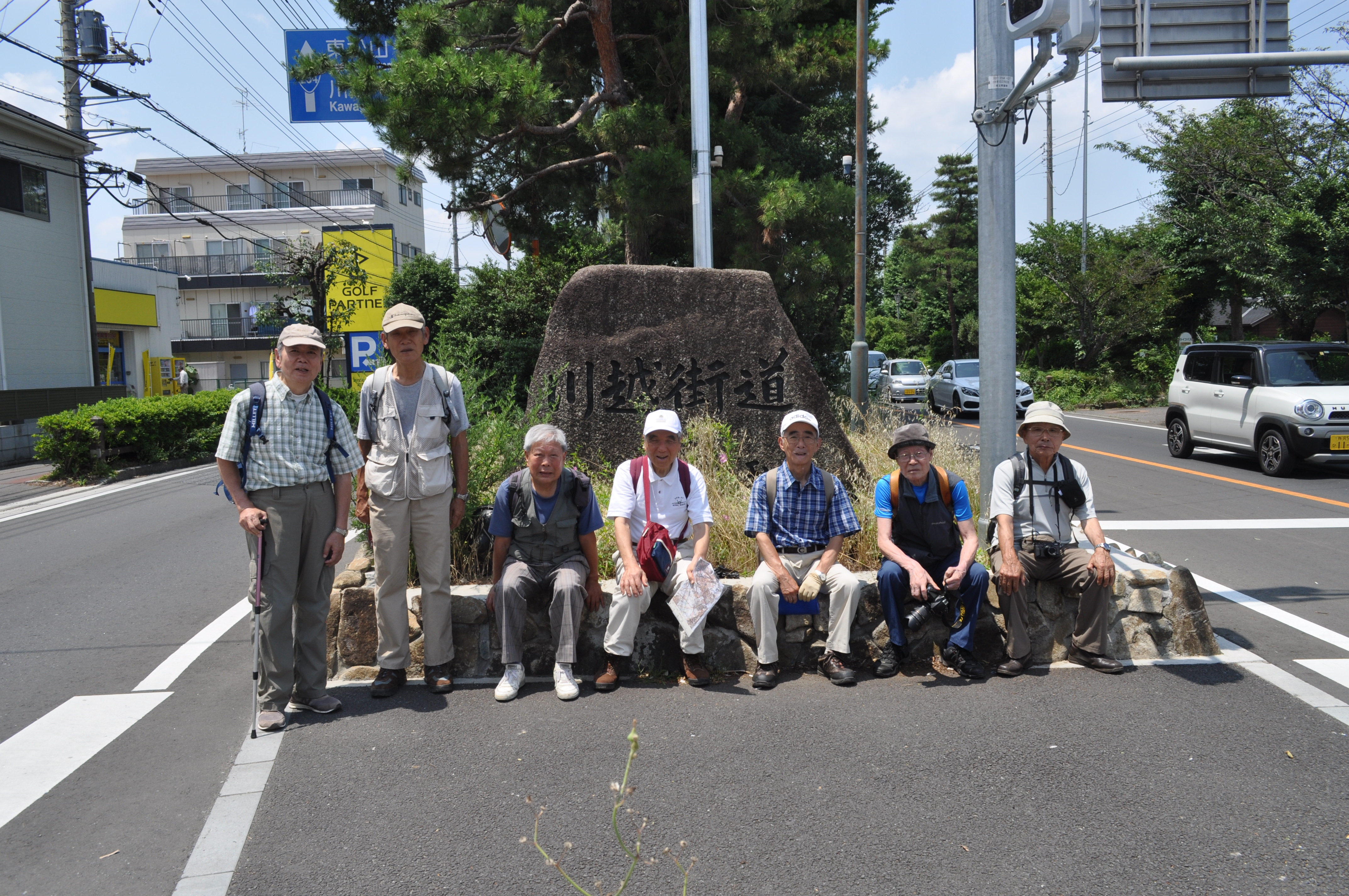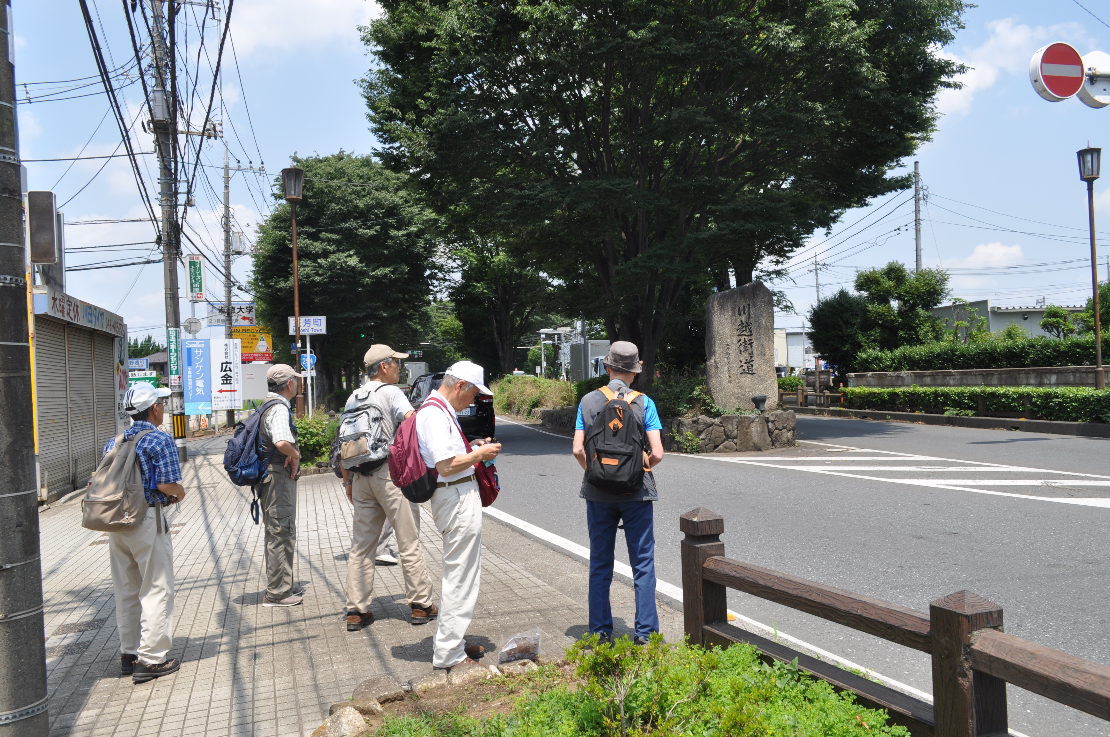 急な階段をやっとの思いで降り、上り坂を進むと「跡見学園」の入口があり、そこから400m程進んだ辺りからケヤキ並木が始まり、国道の分離帯に「川越街道」と刻まれた大きな石碑がある。(10:50)続くケヤキの影で涼しく、ホッとする。