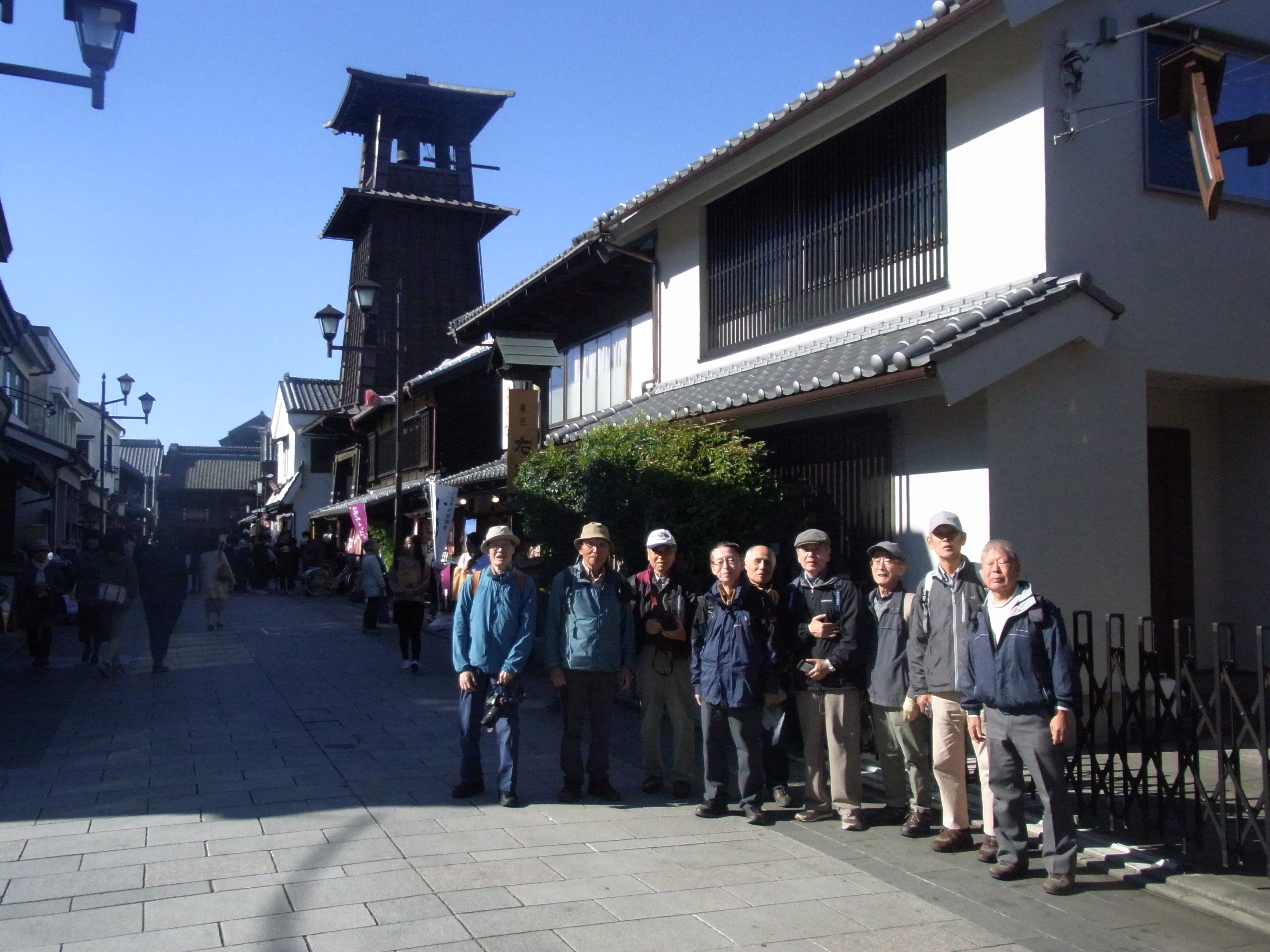 蔵造りの街並みの重要文化財の「大沢家住宅」から女性に人気の稲荷小路で「本宗稲荷」と「稲荷の井戸」を見て、有名な「時の鐘」に向かう。いつもは観光客でごった返している「時の鐘」周辺は、今日は空いていて、集合写真を撮ることが出来た。ラッキー。(12:10)
