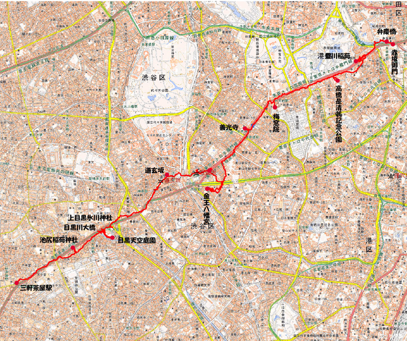 第1回 大山街道ウォークレポート記 中島 征雄 第1回 赤坂御門~三軒茶屋駅 街道距離 10.7 km ★ 実施日 H 27年10月21日(水) ★ スタート場所・時刻 地下鉄永田町駅5番出口(地上) AM 10時 参加者 竹島 久雄、折本 文夫、杉田 勝行、山岸 雅明、中田 信義、前北 勝司、宇山 治男、野田 宏、 八木 閲三、相原 教男、三浦 繁雄、伊藤 泰弘、中島 征雄 合計 13名 コース 永田町5番出口10:00~赤坂御門~弁慶橋~豊川稲荷10:27~牛鳴坂~高橋是清翁記念公園10:50 ~11:06梅窓院~善光寺~12:00金王八幡宮(昼食)12:25~御嶽神社・宮益坂~道玄坂~上目黒大 坂~上目黒氷川神社~目黒天空庭園~目黒川大橋~池尻稲荷神社~14:18東急田園都市線三軒茶屋駅 今回歩く大山街道は江戸時代に整備された脇往還の一つで赤坂御門を出発して青山、三軒茶屋より瀬田を経て、多摩川を二子で渡り、溝口、長津田、厚木、愛甲、伊勢原、板戸、善波、千村、神山、松田惣領、関本、矢倉沢関所から足柄峠を越して駿河方面へ達する矢倉沢往還の途中の伊勢原から大山へ向かう参詣の道である。江戸時代半ば以後、江戸庶民の大山詣りの道として盛んに利用された。 矢倉沢往還は大山街道・大山道と呼ばれるようになった。他の大山へ向かう道を総称して大山道と呼んでいた。 以下詳細はレポートPDFをご参照ください。 以上