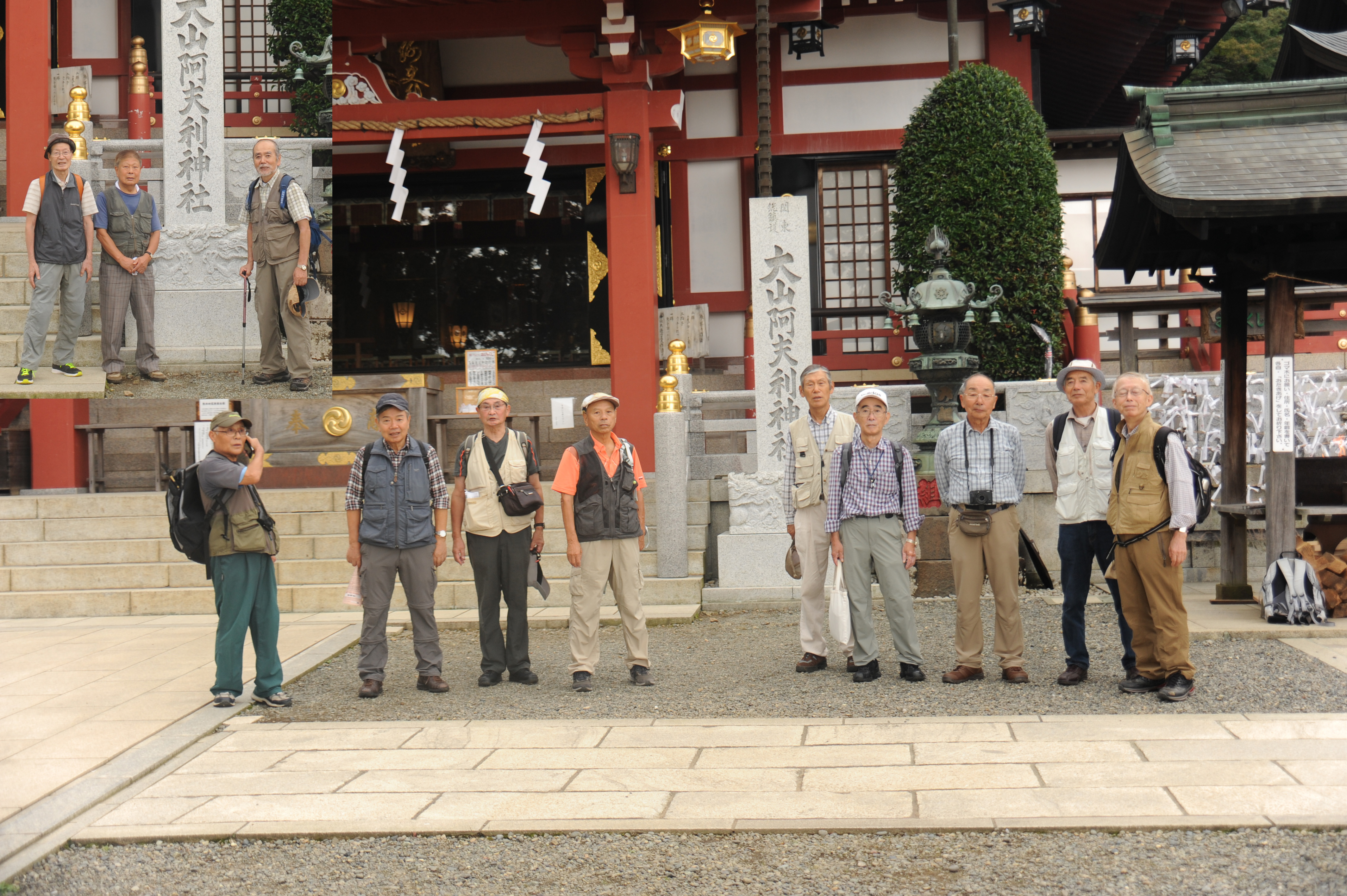 最終回(第9回) 石倉橋バス停~大山阿夫利神社下社 ★ 実施日 H 28年10月19日(水) ★ スタート場所・時刻 小田急線 伊勢原駅 AM 10時00分 参加者 折本 文夫、杉田 勝行、宇山 治男、中田 信義、古家 計、野田 宏、八木 閲三、相原 教男、三浦 繁雄、 伊藤 泰弘、前北 勝司、中島 征雄 合計 12名 平成27年10月21日(水)に赤坂御門から出発して9回に分けて歩き、本日、大山阿夫利神社下社に無事到着しました。大山街道ウオークの総距離は、95.1kmです。(第1回 13.9km、第2回 14.1km、第3回 8.9km、第4回 9.6km、第5回 8.8km、第6回 9.8km、第7回 12.4km、第8回 9.6km、第9回 8.0km) |