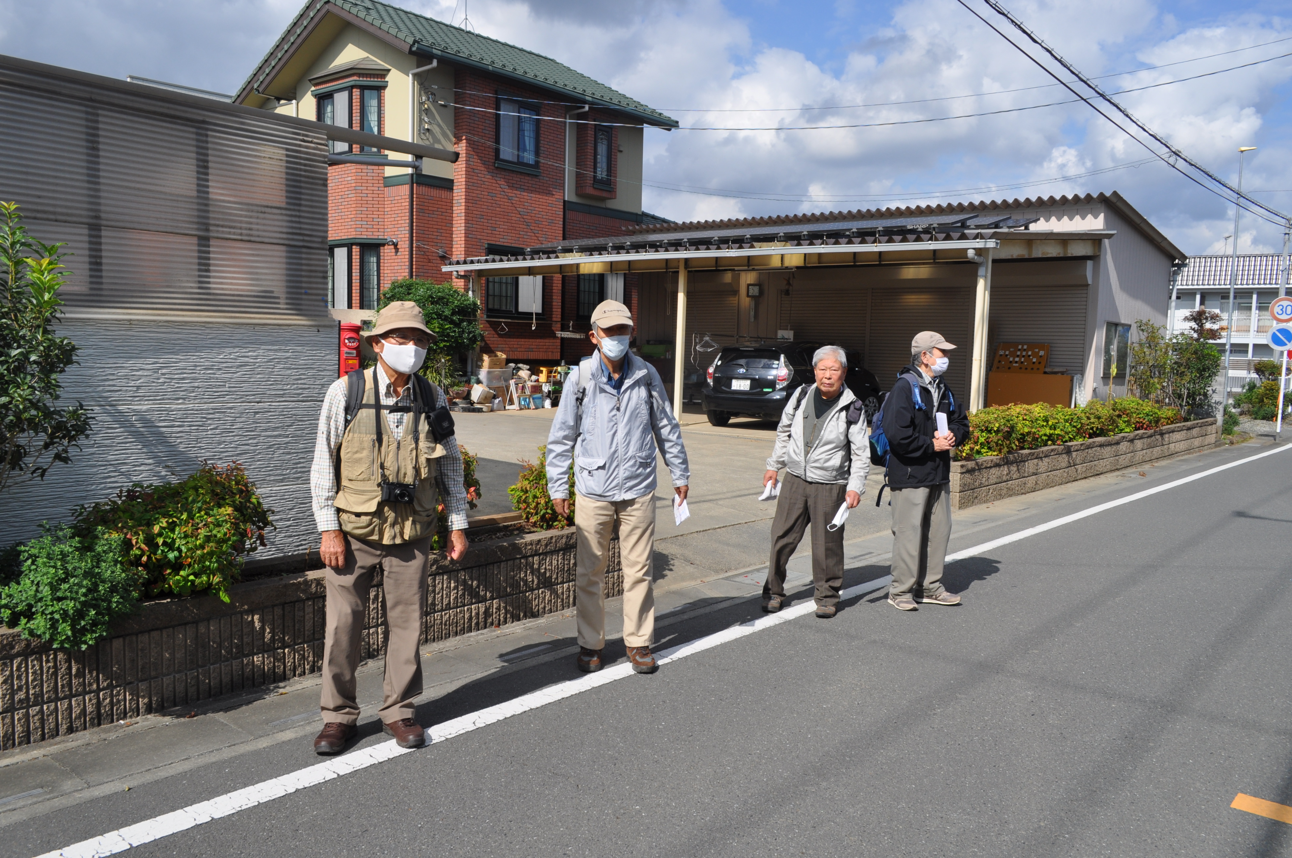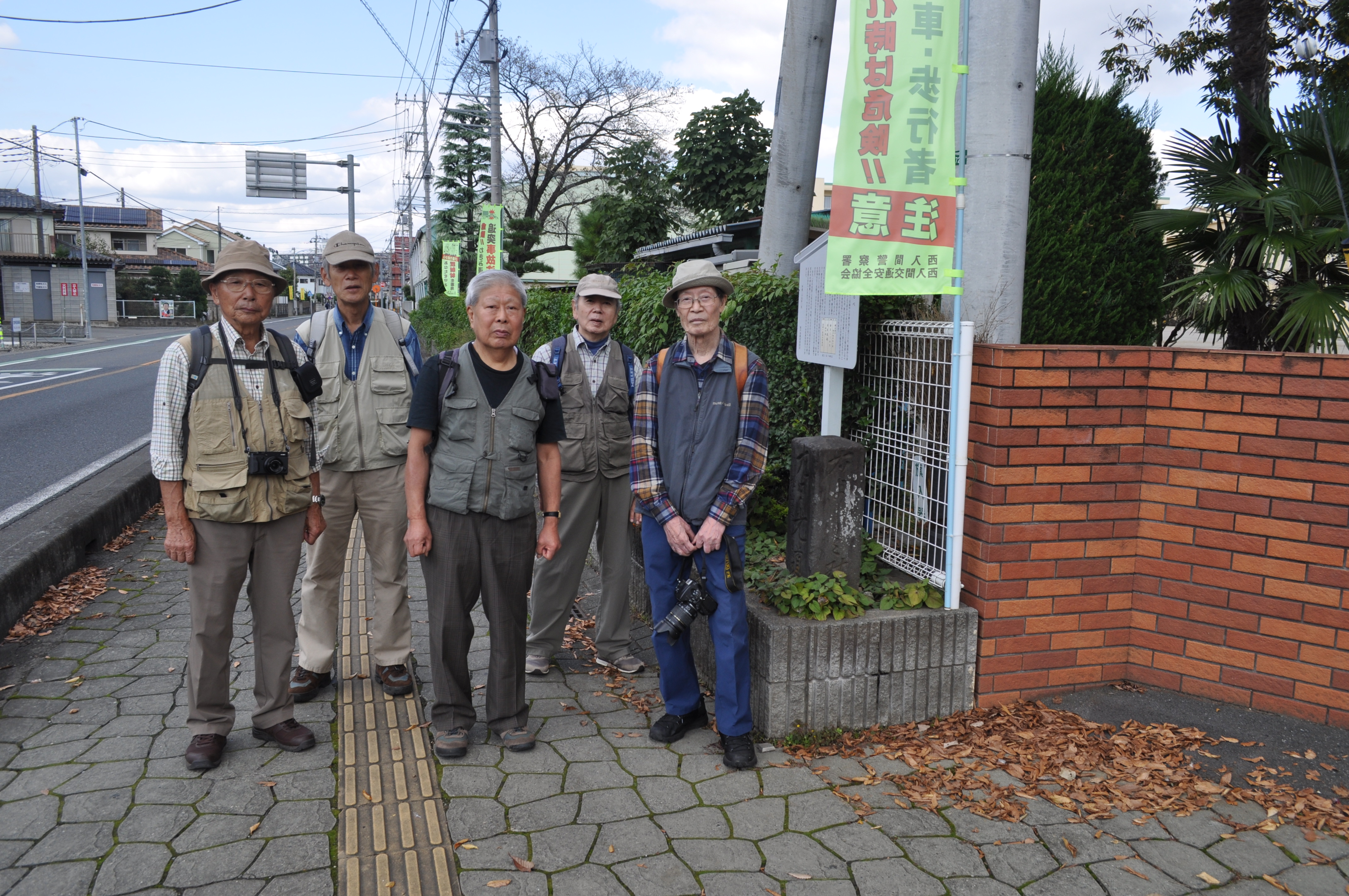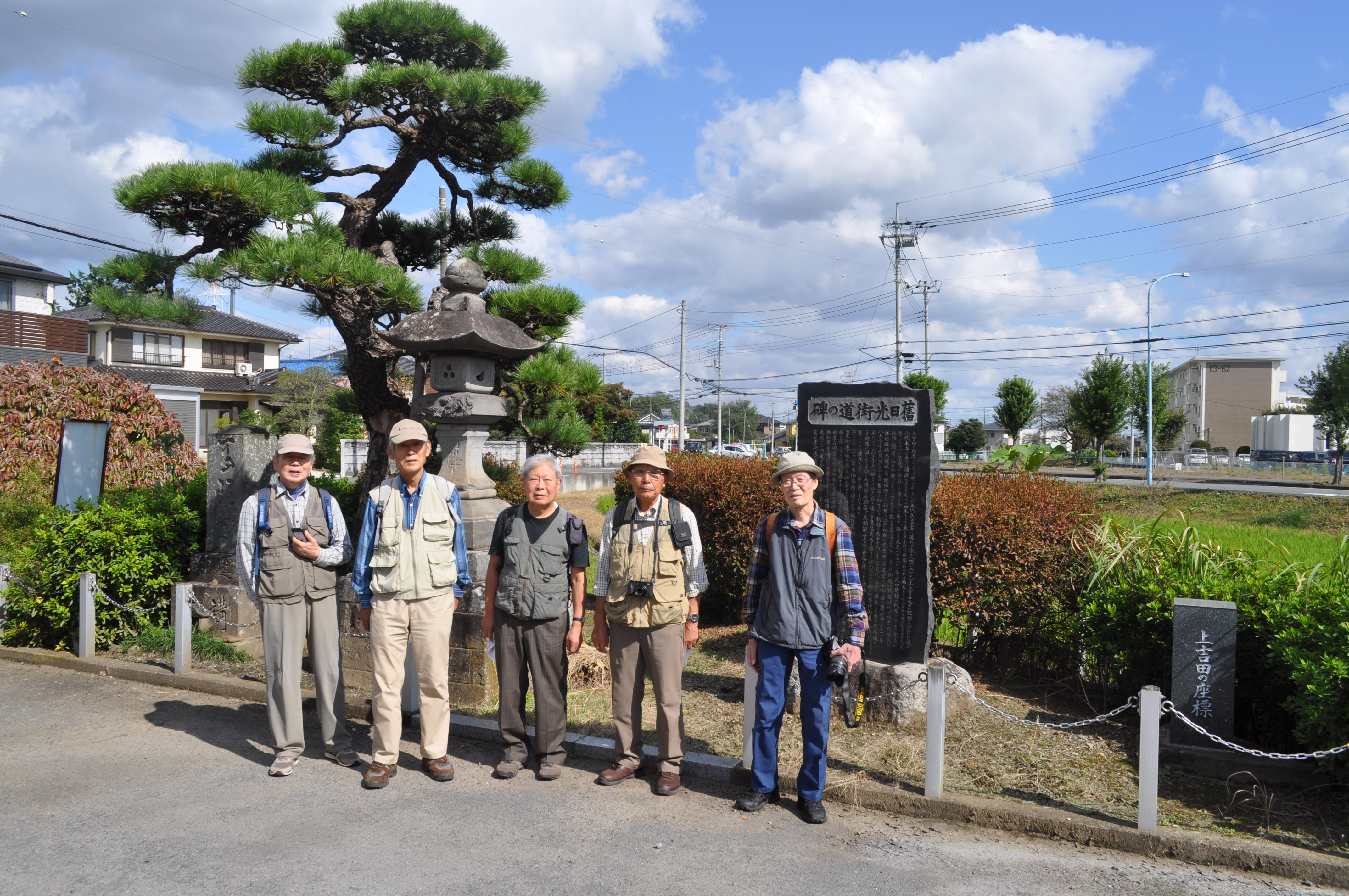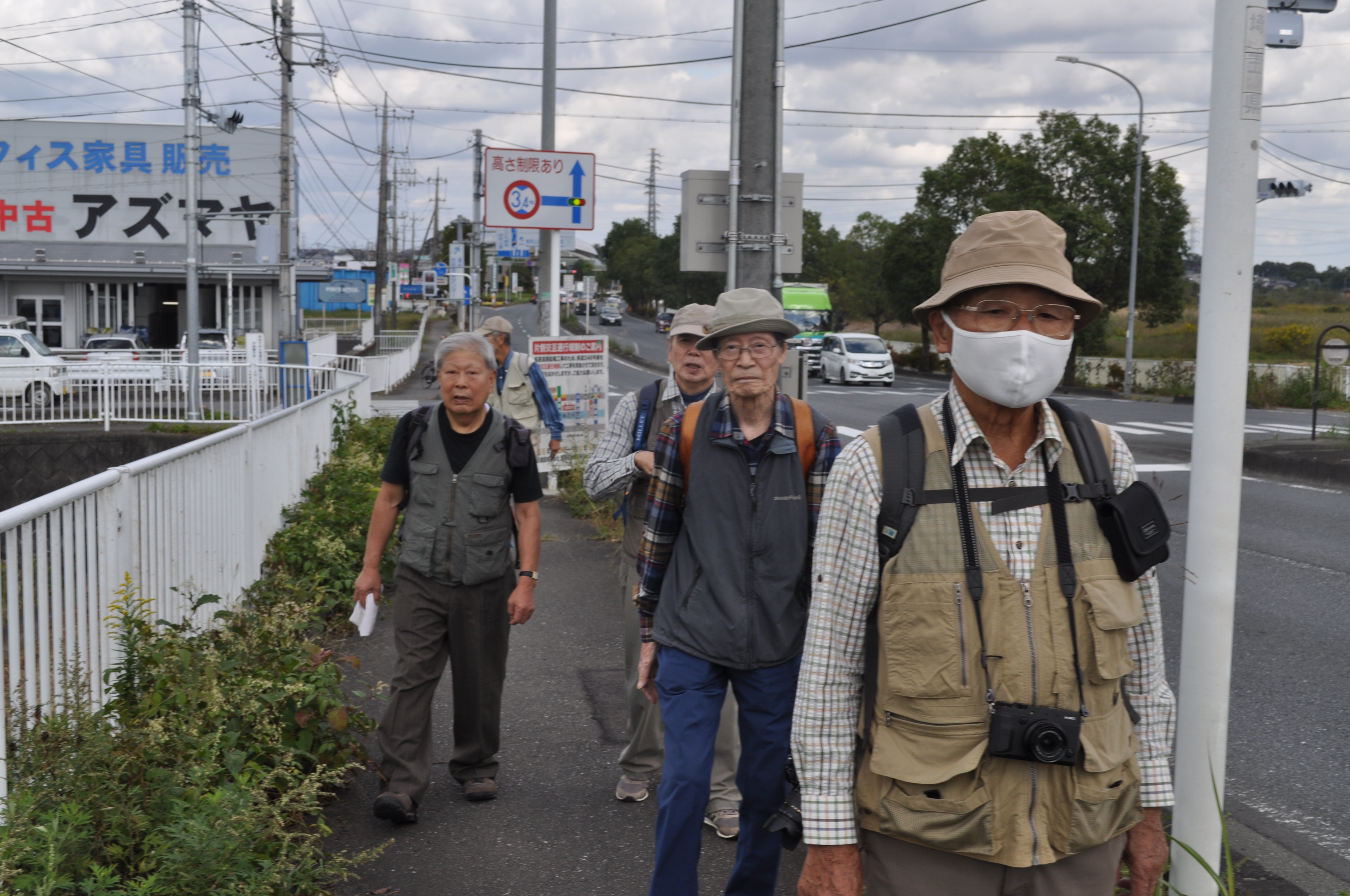 高坂駅で集合時に全員検温をし体調を確認。東口を10時12分に出発。(ウオークガイドには西へ330m程と記したが東への間違いでした)東へむかい前回曲がって駅に向かった高坂郵便局がある交差点を右折し旧街道を進む。少し進んだ県道との交差点あたりが昔の高坂宿の中心であったとのこと。