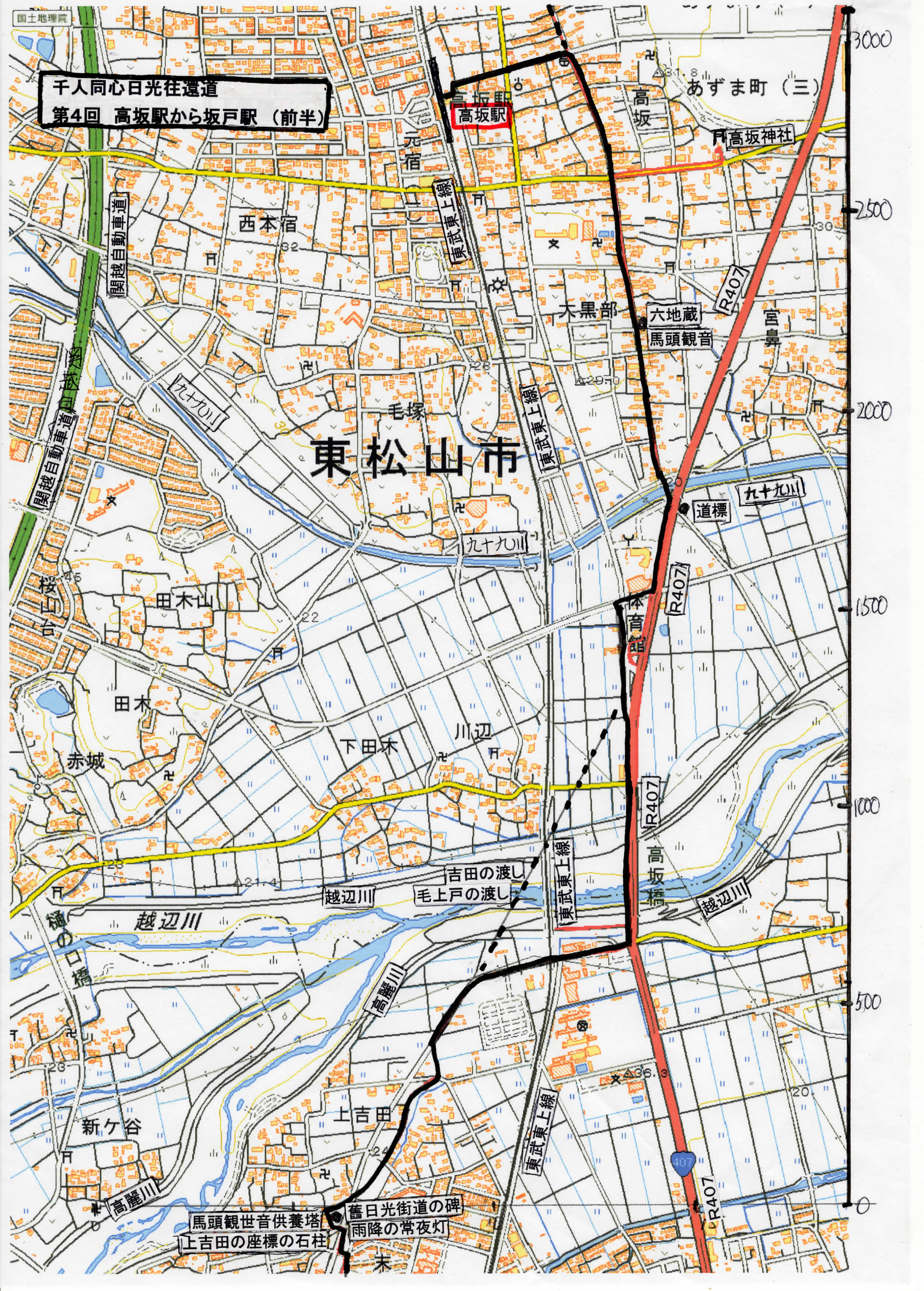 街道を進み、東武東上線の踏切を渡り、すぐ左折して、もう一度東武東上線の踏切を渡ると坂戸駅に12時53分に着き、13時07分池袋行の急行に乗る。