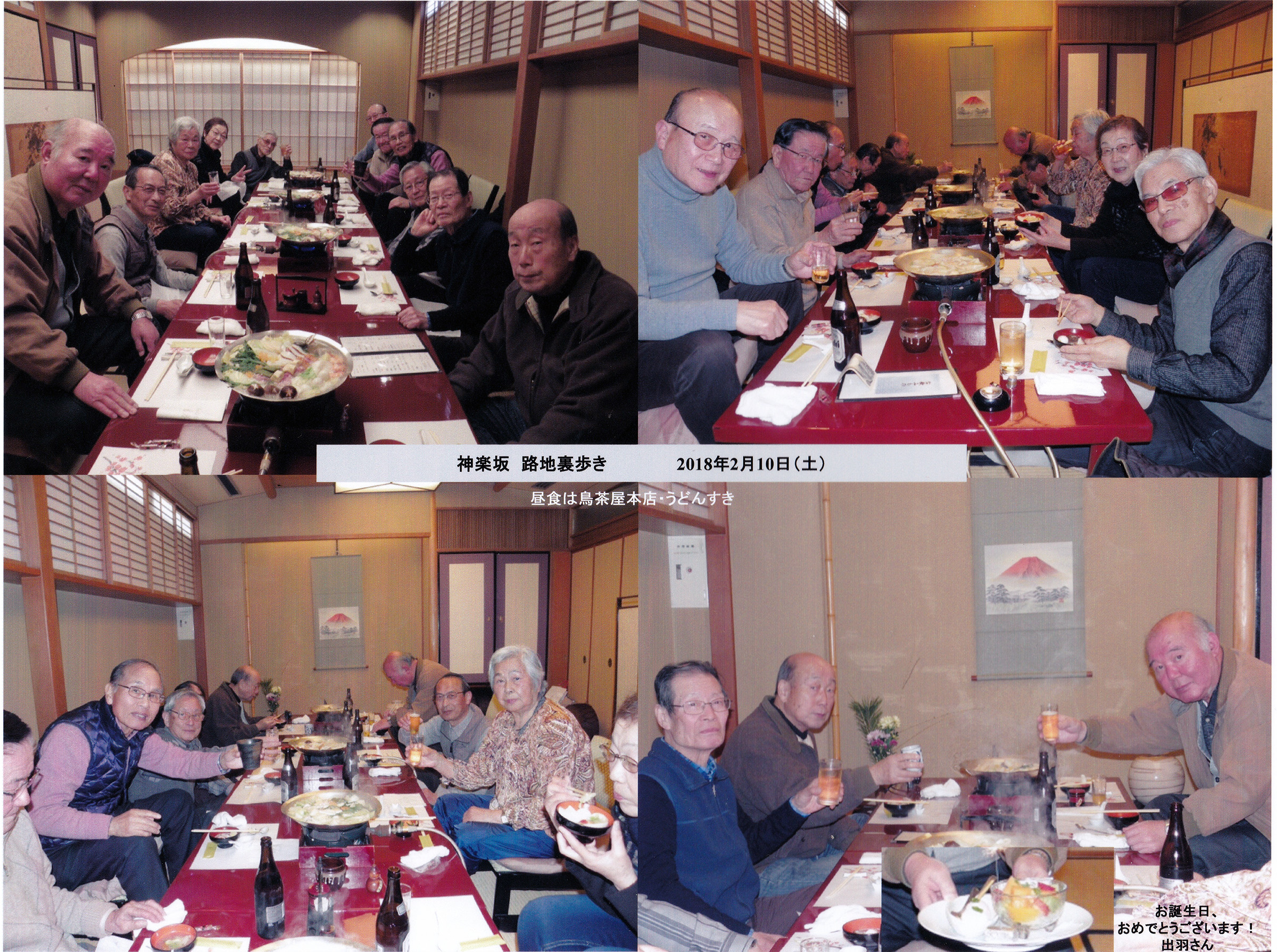 JR飯田橋西口集合→牛込御門跡→カナルカフェ→軽子坂→不二家の神楽坂店→和食・千→本多通り→芸者新道→熱海湯→光照寺(牛込城跡)→天文屋敷跡→神楽坂毘沙門天→鳥茶屋のうどんすき(昼食)