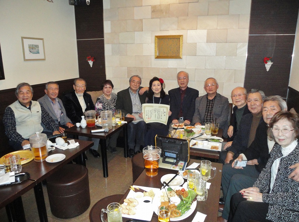◇期日 令和元年12月17日(火) ◇場所 コートダジュール銀座店 ◇参加者 18名 寿会東京支部カラオケ部会の忘年カラオケ会を12月17日に銀座「コートダジュール」で開催しました。年末の忙しい時期でしたが18名の参加者があり楽しい時間を過ごしました。 当日は阿川泰子さんが飛び入りで私たちのカラオケ会に参加され「伊勢佐木町ブルース」を熱唱されました。 阿川さんは永年我が国ジャズ界の振興に貢献された功績により日本ジャズ音楽協会名誉会長で衆議院議長大島理森様から表彰され、表彰式の帰りに私たちのカラオケ会に参加されました。 みなさんから祝福されてとても嬉しそうでした。 東京支部のカラオケ会は発足以来8年になりますが毎月第三火曜日に開催しております。 参加メンバーは多彩で近隣寿会の方が多く参加され盛り上がっております。 昔ビクターで仕事をした縁でつながる楽しい集まりで毎月15名前後の参加者があります。 高齢化は進んでいますがこれからも元気に歌っていきたいと思います。 以上