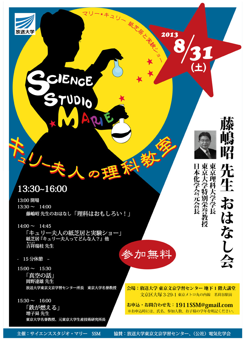 茗荷谷の放送大学(講堂)で東京理科大藤嶋学長と妹たちが下記、開催します。日時 2013年 8月 31日(土) 午後1時半〜4時 場所 地下鉄 茗荷谷駅前 放送大学 東京文京学習センター 地下1階大講堂 対象 子どもと父兄 無料 内容 @ 東京理科大学学長 東京大学栄誉教授、元日本化学会長、 藤嶋 昭先生のご講演 「理科はおもしろい!」 Aキュリー夫人の紙芝居と 実験ショー 吉祥 瑞枝 紙芝居 キュリー夫人ってどんな人? B真空の話 岡野 達雄(前東大大学院教授 、 放送大学 東京文京学習センター所 ) C鉄が燃える! 増子 昇 東京大学名誉教授、 元東京大学生産研究所長 市 川 光 男 ichikawa@nm.catv.ne.jp ![]()