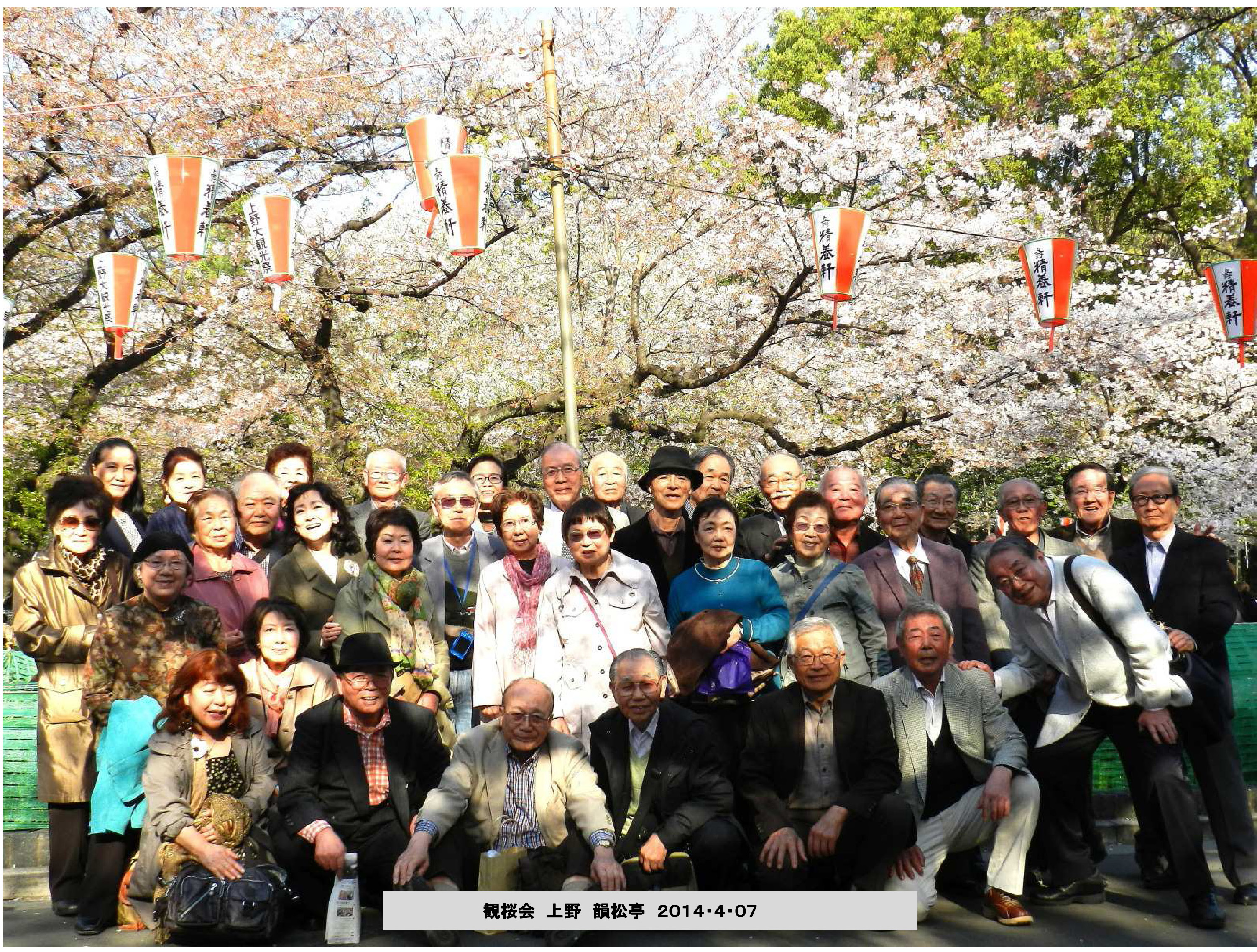 心も身体も浮き浮きしてくる春 桜のシーズンがやってきました。 2014年4月7日(月曜日)、東京寿会主催でメンバーのご健康と長寿を祝い、 観桜昼食会(韻松亭・上野公園)を実施しました。参加者35名。 季節の息吹を感ずる桜を愛でながら、老舗料亭の和食(酒・飲み放題)を楽しみ 世間話に花を咲かせた半日でした。参加費6000円。 今回の観桜会は寿会東京支部顧問(元東京西支部長)・長谷川さんのプロデュース のもとで実現しました。 健康長寿の奥野一郎さん(86歳)、高橋 廣さん(86歳)、前田 房江さん(86歳) は元気そのものでした。 ジャズ歌手の阿川泰子さんもゲスト参加され、楽しい観桜会で参加者全員 大満足でした。 来年も4月の上旬に実施します。 |