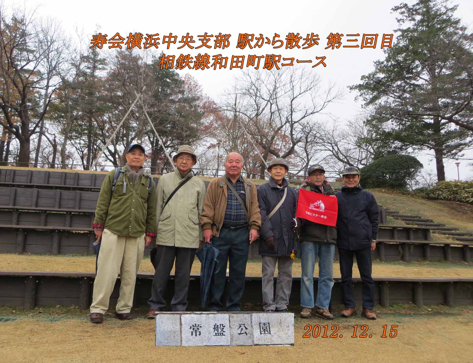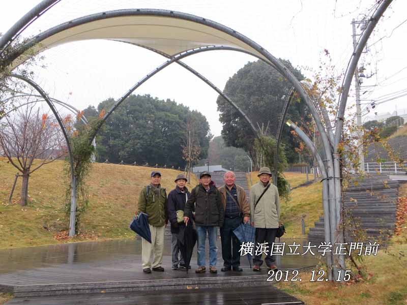 ◇開催日時 平成24年12月15日(土) 午前10時 相鉄線和田町駅改札口◇散歩概要 先月の散歩に続き、横浜は午後から雨の天気予報、どうも雨男がいるのかな? 雨にも負けず6名の 参加者が相鉄線和田町駅に集まりました。 先ずは、真福寺に参拝、散歩開始30分後常盤公園での記念写真撮影後、広大な公園を散策中から、 かなりの雨が降り続き、寒さも伴った事もあり、次の横浜国大構内では、学生気分を味わう予定でしたが 見物もそこそこに、全員急ぎ足で終点の三ッ沢上町駅を目指し、約90分の散歩が終了しました。 その後、参加者全員で横浜駅近くの〈なかいち〉にて昼食会を楽しみました。 1. 真福寺参拝と隣接する「和田稲荷」(和田町の地名の由来にもなっている)を見学 2. 常盤公園(保土ヶ谷区の高台にある公園)では、紅葉も終わっており、テニス・野球・グランドゴルフを楽しむ市民を見ながら、公園一周・・記念写真撮影 3. 横浜国大の北門から構内を散策、正門へ 4. 国道1号線を東へ、市営地下鉄三ッ沢上町駅で散歩終了 ◇今回の参加者 6名 (敬称略) 飯田耕治郎、熊倉達郎、佐々木一三、下條光輝、新谷則雄、出羽善武> |