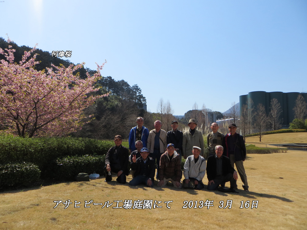 ☆開催日時 平成25年 3月16日(土)午前10時 伊豆箱根鉄道・大雄山線和田河原駅集合☆狩川春木径 本日の散歩の主目的は花見。半年前に本日のスケジュールは決まっており、桜の咲き具合はお天道さままかせ、如何なるや? はたして、見事な桜にめぐり会えました。絶好の天気にも恵まれ、参加者12名は狩川沿いの通称春木径の散歩で満開の春めき桜を楽しみました。 ☆アサヒビール工場の見学 引き続き全員でアサヒビール神奈川工場へ移動、工場内の庭園を散策後、生憎土曜日でラインは非稼働でしたが、美しいガイドさんの案内で「仕込み・ろ過・発酵・熟成・ビン詰&缶詰」と流れる巨大な工場を見学、最後に出来たてのビールの試飲(これが主目的かな?)で見学終了。 飲みたりない全員はその後、工場内ビール園にて昼食懇談会、おおいに盛り上がりました。 ☆参加者 12名(アイウエオ順、敬称略) 荒井嘉根男、飯田耕治郎、熊倉達郎、佐々木一三、下條光輝、新谷則雄、菅沼喜久次、鈴木隆雄、出羽善武、 平塚 直、弘海昭雄、山本三樹夫。 |