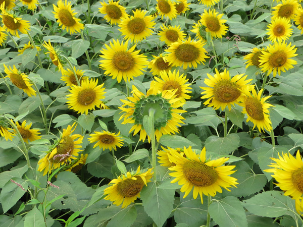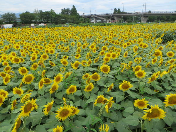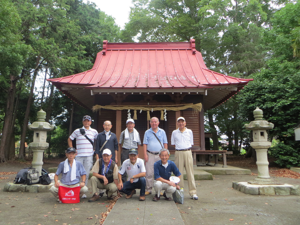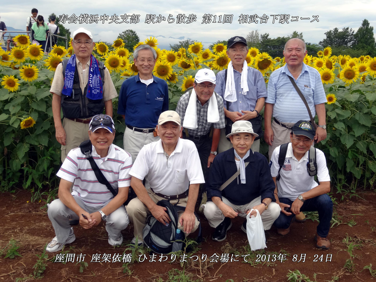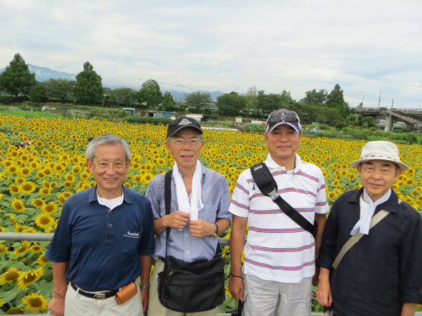 ☆開催日時平成25年 8月24日(土)午前10時JR相模線 相武台下駅集合 ☆主な散歩コース JR相模線相武台下駅→ひまわり畑→諏訪明神社→県立谷戸山公園→小田急座間駅 ☆本日の散歩 つい先日まで続いていた、極暑も一段落、今日は薄曇りで少し涼しく(少し楽な散歩が出来ました)ひまわりで有名な座間市の中でも、見事な花を見せてくれたのが座袈依橋付近の広大なひまわり畑です。当日は「ひまわりまつり」開催中で、55万本と言われるひまわりは、まるで黄金のジュータンを敷き詰めたかの様に見事な風景でした。 次に諏訪明神社に参拝し、県立谷戸山公園に向かいました。谷戸山公園はかなり広大な面積(30.6ヘクタール)を有し、県立の自然公園として平成14年に開園(自然生態観察公園)されたとの事。本日はその公園の一部を散策、一休みの後、最終目的地の小田急線座間駅に到着、美しいひまわり畑と自然を満喫出来る約2時間の散歩が終了しました。 その後海老名駅に移動、駅近くの蕎麦屋にて参加者全員でいつものように昼食会を楽しみました。 参加者 9名(アイウエオ順、敬称略) 飯田耕治郎、佐々木一三、下條光輝、新谷則雄、鈴木隆雄、出羽善武、平塚 直、 百瀬允秀、山本三樹夫 |