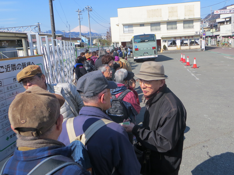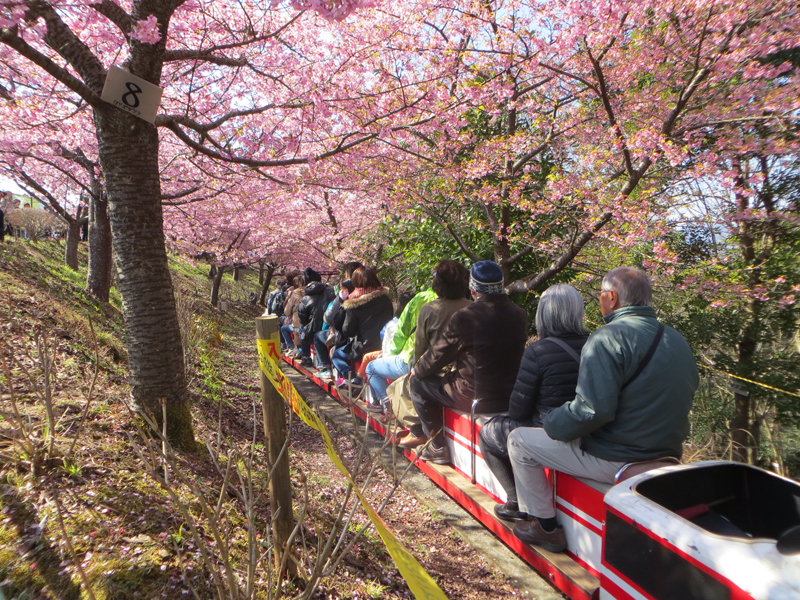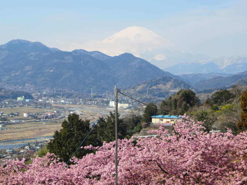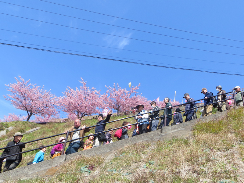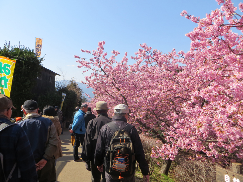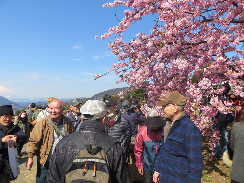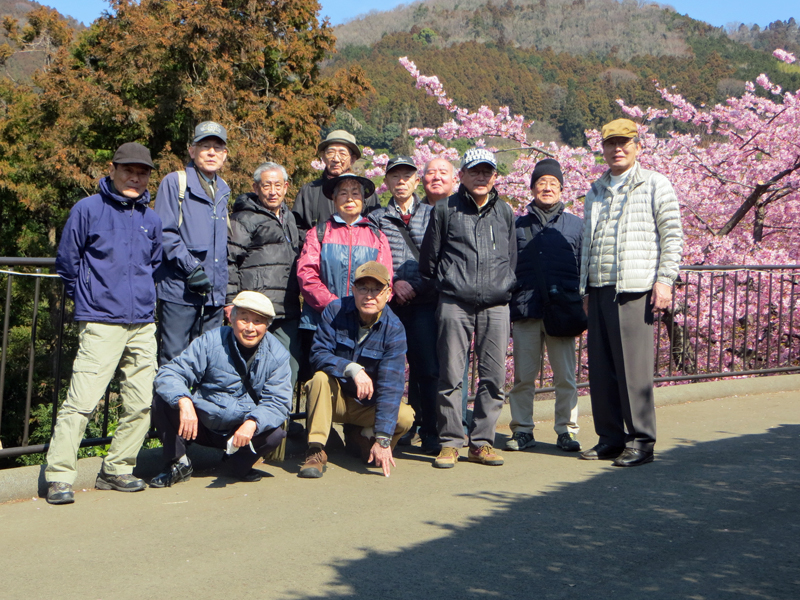 天気快晴 松田町「河津桜」満開、富士山くっきり 健脚12名が素晴らしい景色を満喫☆開催日・集合場所 平成28年2月27日(土)午前10時 小田急線:新松田駅北口 ☆ 主な散策コース 新松田駅 ⇒ 中沢酒造 ⇒ JR松田駅前 ⇒ シャトルバス乗車 ⇒ 松田山ハーブガーデン ⇒ふるさと鉄道 ⇒ つるし雛会場 ⇒ 河津桜道 ⇒ 新松田駅 ☆2月27日(土)午前10時 小田急線:新松田駅北口に12名が集合、中沢酒造を見学後JR松田駅まで歩き、そこからシャトルバスで松田ハーブガーデンに向かった。 天気快晴 雲一つない絶好の観光日和に恵まれ、濃いピンク色の河津桜が山の麓一帯に咲き誇っている松田山ハーブガーデンや河津桜道の散策に、観光客が松田駅前のシャトルバス乗り場に長蛇の列をなしていた。松田町の「桜まつり」が開催中であった。 ☆駅から散歩も天気で大きく左右される。一週間前、2月20日(土)に支部役員によるコース下見の際は、あいにくの雨天で傘をさしての散歩であった。当然ながら観光客もまばら、富士山も雲に覆われ全く見えなった。 ☆本番の2月27日は快晴、大勢の観光客のなか、松田山ハーブガーデン一帯の満開の河津桜や、立派なつるし雛、そして富士山の絶景を眼に焼き付けた後、大勢の観光客と共に、河津桜道を歩いて下り、小田急線 新松田駅へ到着。 - 以上 ☆参加者 12名 (アイウエオ順、敬称略) 荒井嘉根男、飯田耕治郎、熊倉達郎、佐々木一三、新谷則雄、菅沼喜久次、出羽善武、中倉国男、 平塚 直、前田房江、山本三樹夫、吉田親司 以上