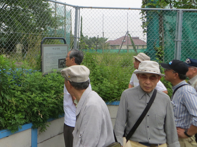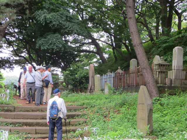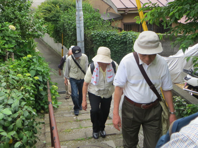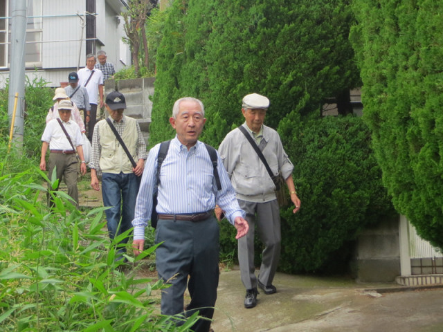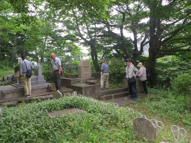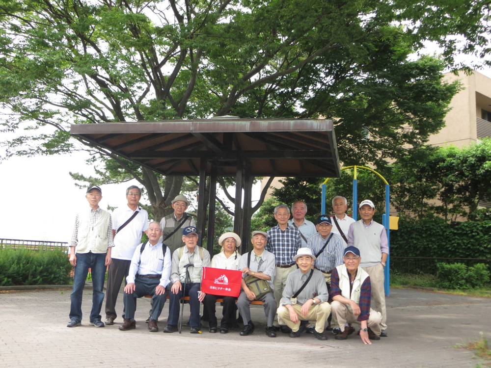☆開催日・集合場所平成28年5月28日(土)午前10時 JR根岸線:山手駅改札口集合 ☆ 主な散策コース 山手駅 ⇒ 根岸外人墓地 ⇒ 清水寺 ⇒ 池袋公園 ⇒ ひらん台貝塚 ⇒ 善行寺 ⇒ 山手駅 横浜には、外人墓地が4つありますが、根岸外人墓地は1861年(文久元年)山手の横浜外国人墓地が手狭になったため設けられた横浜市営墓地で、多様な洋式の墓石が点在し、観光名所なっている山手外人墓地とは対象的でした。 曹洞宗清水寺(せいすいじ)はお稲荷さんに併設され、今は往時の面影もありません。更に足を進め、丘の頂上が池袋公園。小休止の後、写真撮影と前田さんご持参の「間違い探しゲーム」で頭の体操、眼下には写真撮影スポットの石油コンビナートの一群が見られました。坂を下り中腹に県立緑丘高校があり、グランドの片隅に「ひらん台貝塚」がありますが、4回の調査を終了との事で、原型をとどめていませんでした。 更に坂を下りきったところに日蓮宗善行寺があり、整備が行き届き新しく綺麗なお寺でした。最後に山手駅を目指し丘超えをし山手駅にて解散。 今回の散歩コースは山手の名にふさわしく、アップダウンを何度も繰り返しましたが、参加者全員元気に散歩を楽しみました。食事会は、当支部会員:佐々木輝光さんが経営されるそば処「百花」で大いに楽しみました。 ☆参加者 14名 (アイウエオ順、敬称略) 荒井嘉根男、井上 茂、熊倉達郎、小泉八郎、佐々木一三、下条光輝、 新谷則雄、 出羽善武、 中倉国男、平塚 直、前田房江 、三木吉弘、山本三樹夫、 吉田親司、 以上