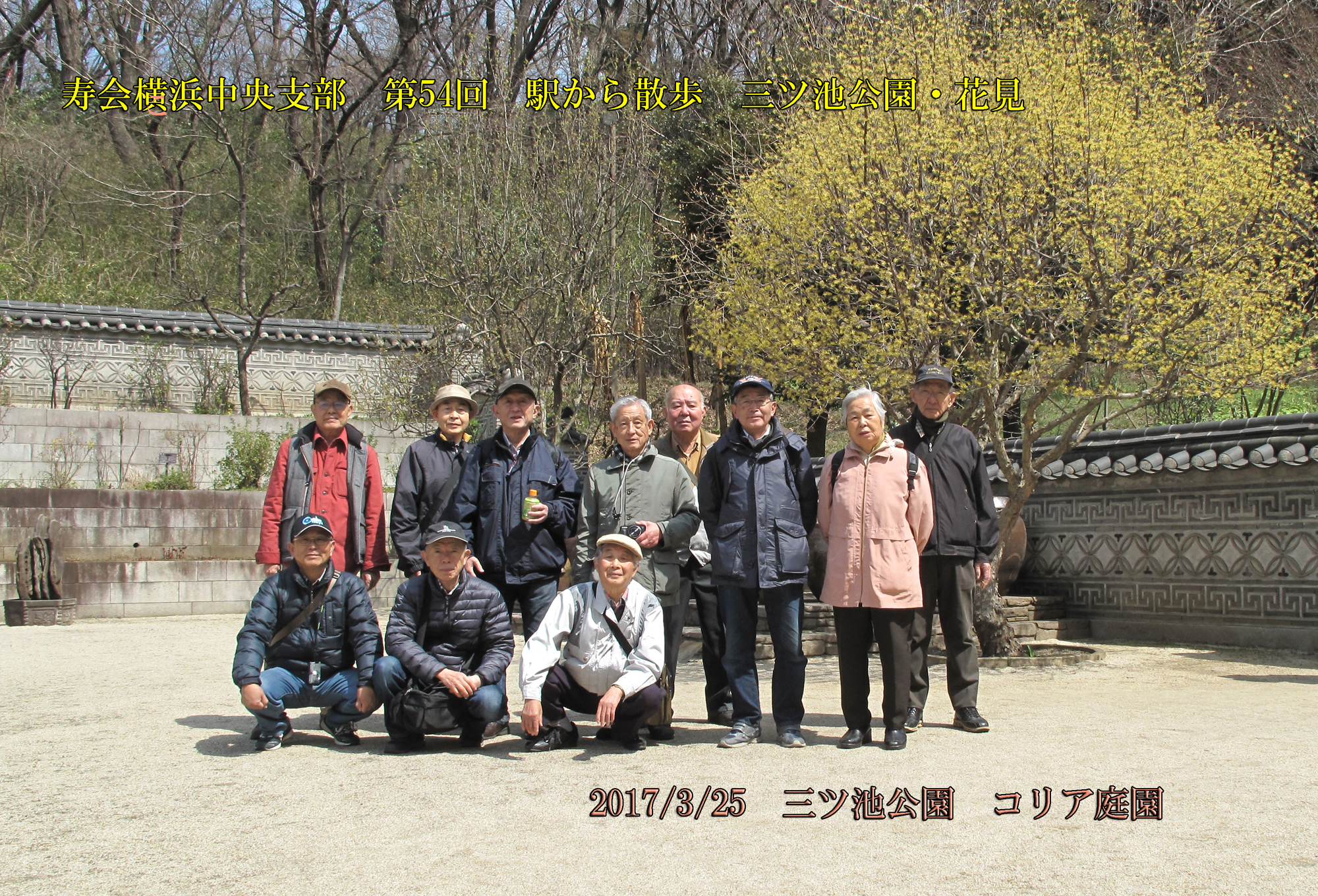 ☆開催日・集合場所平成29年3月25日(土)JR京浜東北線 鶴見駅 集合 ☆ 主な散策コース 鶴見駅 ⇒ 総持寺 ⇒ 三ツ池公園 ⇒ 鶴見駅 (鶴見駅近郊で、食事会) 横浜市鶴見区の鶴見が丘に位置する、曹洞宗の大本山「總持寺」は交通の便もよく、国際的な禅の根本道場として偉容を誇っています。8万坪の寺域には、仏殿(大雄宝殿)をはじめ多くの国登録文化財は人を圧倒いたします。 当日は多くの人が開放された境内を散策されており、我々も主な仏殿を見学、そして記念撮影。中でも人気のスポット故・石原裕次郎のお墓参りをし、総持寺を後にしました。 今回のコースは丘陵地での長く続く登り坂が多く予定時間内での散策が難しい・・・との判断で、バスでの移動に変更し、三ツ池公園に向かいました。 桜の名所として知られる三ツ池公園は、多くの家族連れで、賑わいを見せていましたが、お目当ての花見コースには1〜2周間早かったようです。 池の沿道を散策、記念撮影をし、三ツ池公園を後にしました。 今回、「幹事による下見」で、「バスでの移動」を取り入れましたが、年々移動に時間がかかるのを感じます。 ☆参加者 11名 (アイウエオ順、敬称略) 荒井嘉根男、飯田耕治郎、井上 茂、熊倉達郎、佐々木一三、下條光輝、出羽善武、平塚 直、 前田房江、三木吉弘、山本三樹夫 以上
