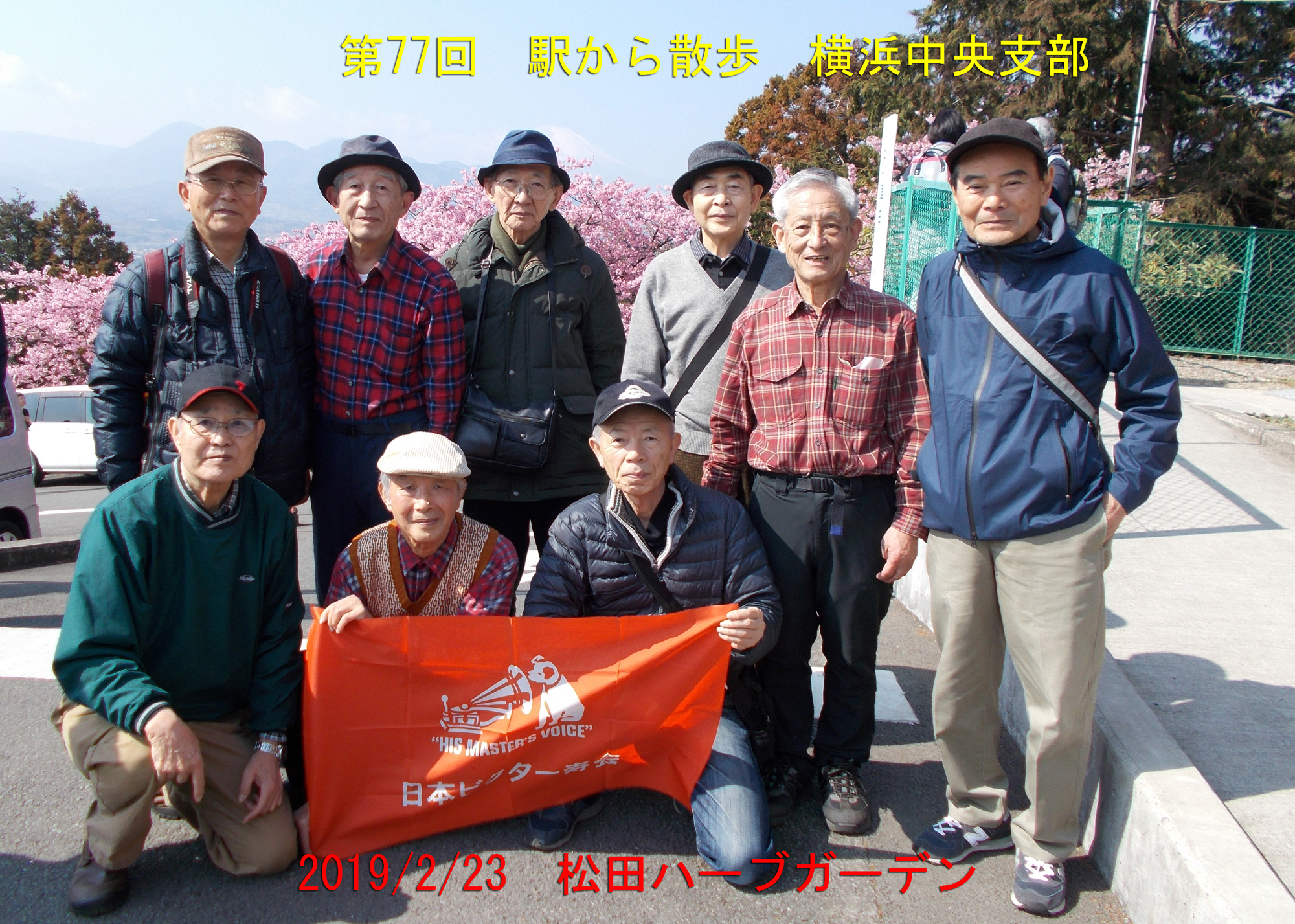 2.主な散策コース 新松田駅 ⇒ 中澤酒造 ⇒ 河津桜道 ⇒ 西平畑公園 ⇒ 松田山ハーブガーデン ⇒ 新松田駅 ☆ようやく桜の季節がやってきました。今年も多くの観光客で賑わいを見せている松田町の河津桜(まつだ桜まつり2/9〜3/10開催中)を見る会です。 下見の時は雪が降るような天気で寒かったのですが、今日はお天気にも恵まれ絶好のお花見日和でした。 小田急 新松田駅は 桜まつり開催中で多くの人で賑わっていました。 新松田駅をスタート、程なくみなさんが好きな酒蔵、中澤酒造を見学(吹奏楽演奏があるとのこと)。中澤酒造は旧小田原藩御用商人として出入り、創業200年の老舗酒蔵です。 一路、右手に山を見ながら上りを開始。かなり急な坂道、階段等を登りイベント会場を目指す。 山道には河津桜と菜の花が咲き とてもきれい。 相模湾や富士山が見渡せる場所で一服。 会場の西平畑公園に到着。記念写真を撮る。(公園は多くの人でいっぱい、外人も多い) 西平畑公園は子供の館(吊るし雛展示)、自然館、ハーブ館、(子供向け)ふるさと鉄道等々があり、相模湾、箱根連山が一望できるところです。ここは富士見百景にも選定されているそうで、自然に囲まれた見晴らしがよい公園です。 松田ハーブガーデンを見ながら下山、無事に新松田駅に到着。駅前で昼食会を楽しみました。