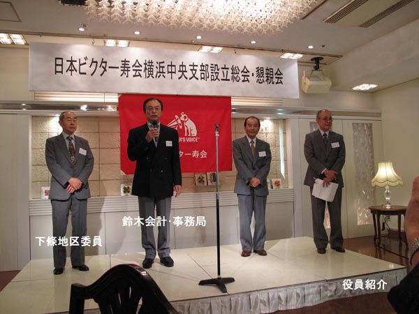 1.いきさつ平成23年10月4日横浜駅西口「横浜国際ホテル」に於いて、寿会・横浜中央支部設立総会を開催いたしました。 これは旧横浜東・西地区を1本化する寿会本部のご方針により、有志が準備員会を結成、本部則岡理事のご指導を賜り 準備を進め、会を盛り上げる為 休会員の皆様や他地区の会員の方々へもお声掛けし、合計53名の方々のご参加を賜りました。 2.ご参加いただいた皆様 |